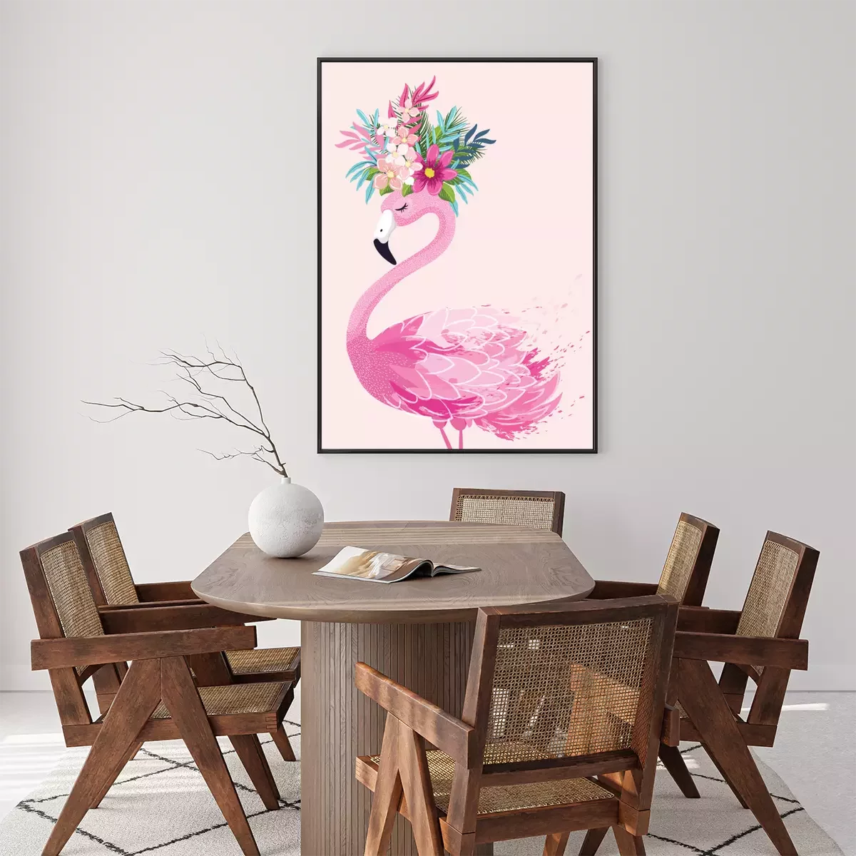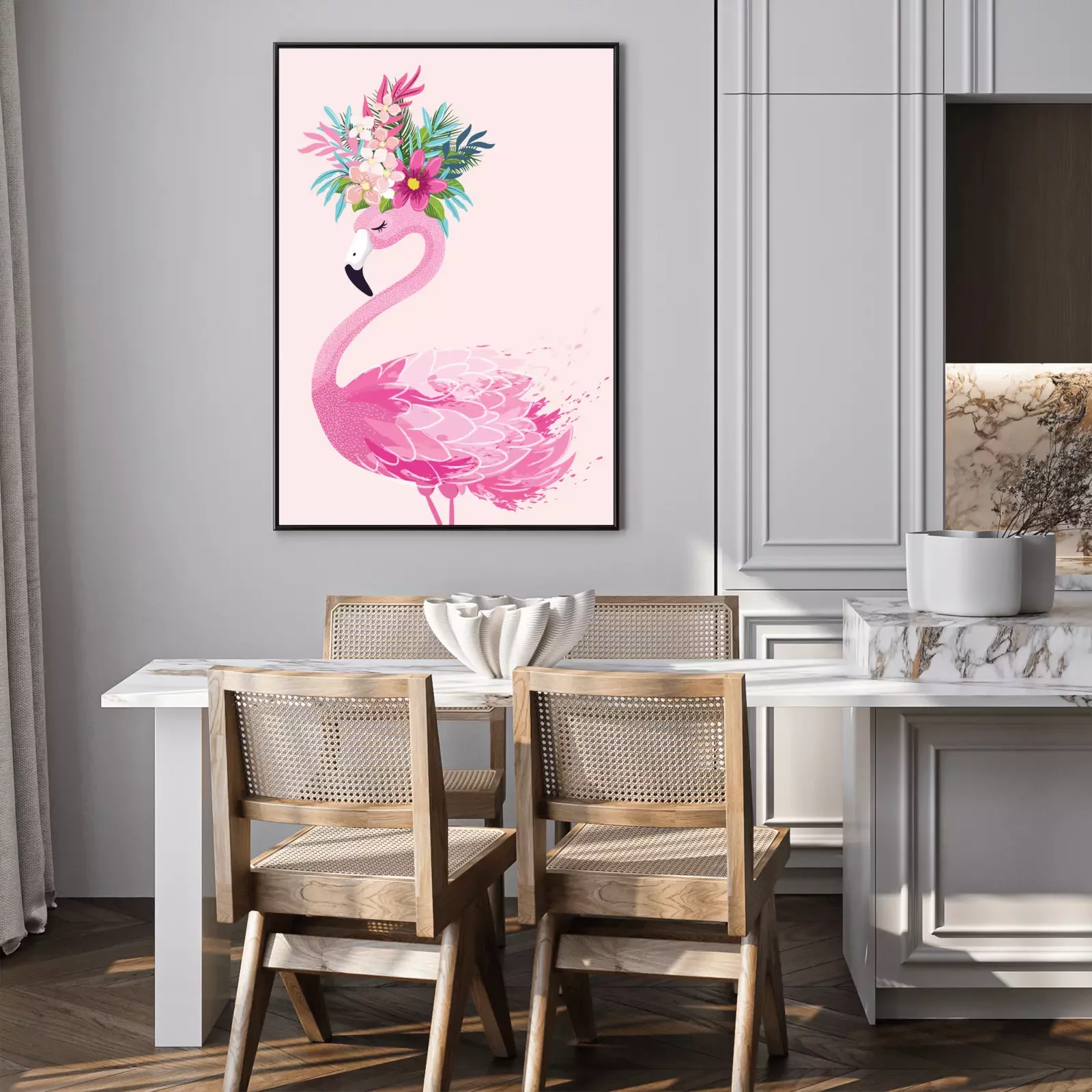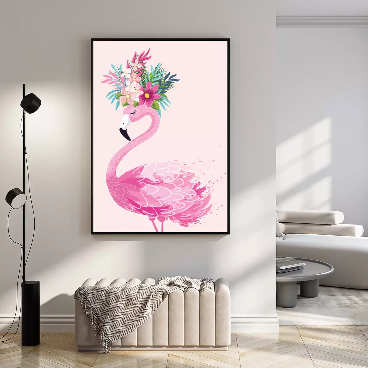 Un poster rose représentant un flamant est un excellent choix pour décorer son intérieur avec une touche d’humour tout en créant une atmosphère joyeuse et amusante. Une illustration expressive représentant un oiseau exotique apportera du dynamisme à la décoration et s’harmonisera parfaitement avec un espace agrémenté de plantes tropicales en pot, telles que des ficus, des monsteras ou des bananiers. Il suffit d’opter pour un poster flamant de grand format afin de créer une dominante décorative capable de transformer complètement l’ambiance de la pièce. Bien qu’il s’agisse d’une illustration au caractère fantastique, rien n’empêche de l’utiliser pour décorer un salon ou une chambre à coucher. Ce poster rose, représentant un flamant orné d’une composition florale sur la tête, sera du plus bel effet au-dessus d’un meuble sur lequel repose un vase avec des fleurs ou une plante en pleine floraison. Les motifs floraux restent toujours tendance. Avant de l’accrocher au mur, il est conseillé d’encadrer votre poster flamant. Si votre intérieur est aménagé avec des meubles modernes, un cadre noir le mettra particulièrement en valeur. En revanche, si votre décoration intègre des éléments rétro, un cadre en bois marron sera une excellente option. Dans un salon ou une chambre à coucher, un tel poster flamant exotique sera toujours du plus bel effet. Cet oiseau rose s’intègrera également parfaitement dans une décoration destinée à un enfant. Cet adorable animal créera une atmosphère enchantée et ravira les petits passionnés d’animaux. Les fleurs ornant la tête du flamant en font une décoration idéale pour une chambre de fille. Ce poster peut être accroché au-dessus du lit ou du bureau, apportant une touche de charme à un espace dédié au dessin et aux devoirs. Si vous souhaitez créer un décor original pour un enfant, le flamant rose sera un excellent point de départ. Ce poster représentant un animal tropical peut être complété par d’autres affiches d’oiseaux exotiques, comme des perroquets ou des toucans, ainsi que par des motifs floraux. Pour une touche encore plus harmonieuse, vous pouvez fixer des panneaux rembourrés roses au mur derrière le lit, en guise de tête de lit. En accrochant le poster au-dessus, vous créerez un magnifique espace de sommeil pour votre enfant.