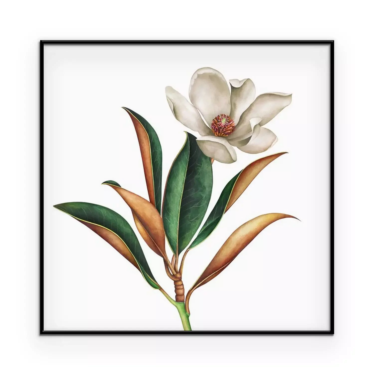 Poster : Fleur de magnolia entourée de feuilles vert-brun