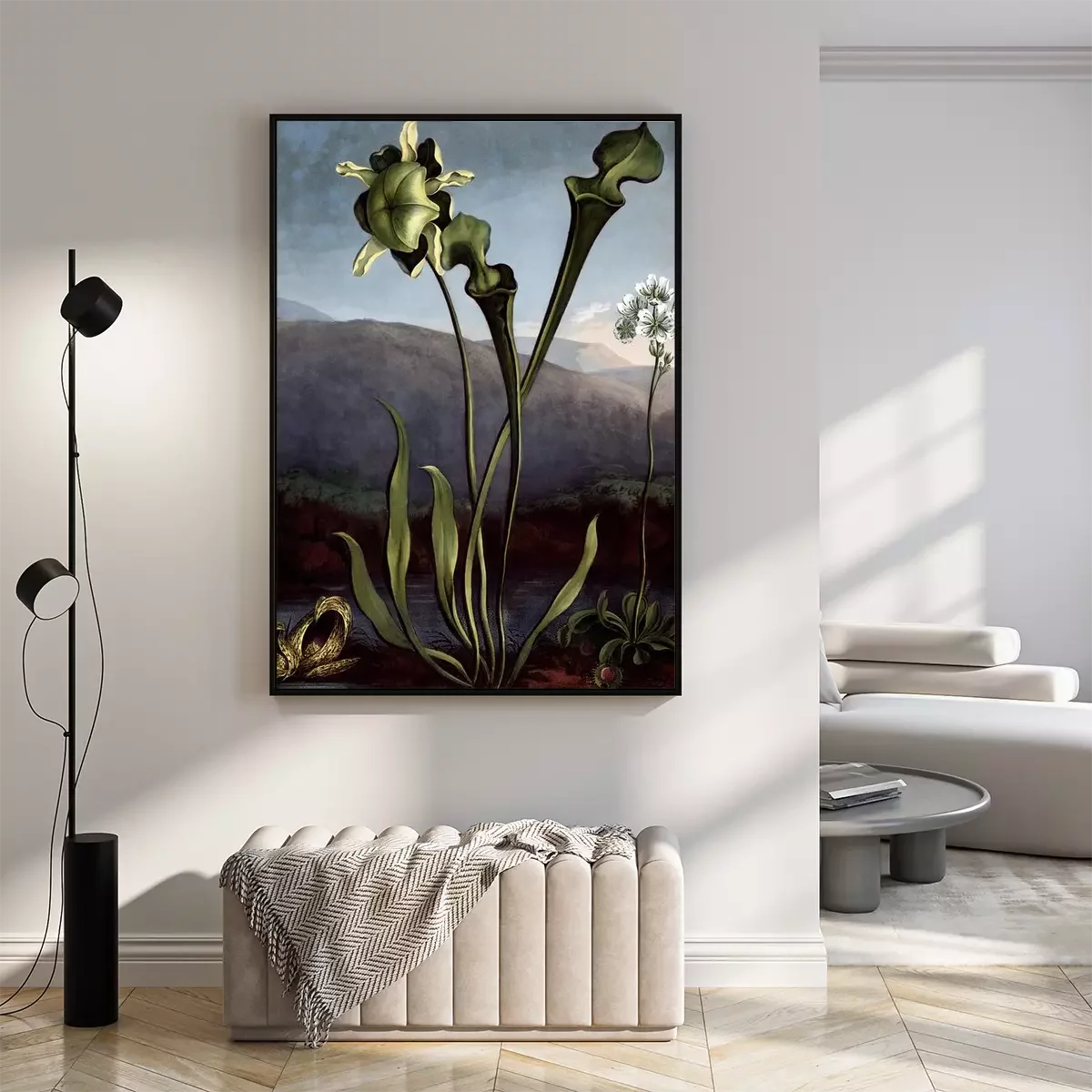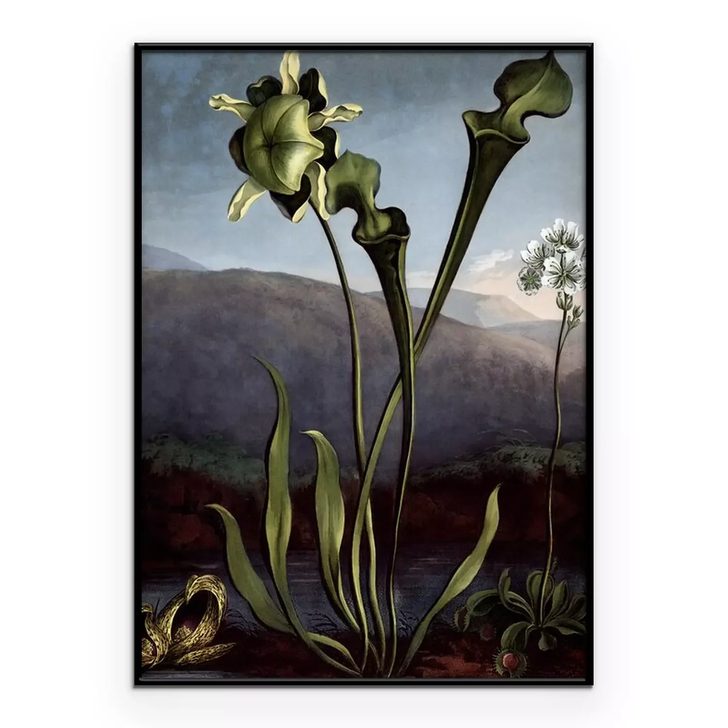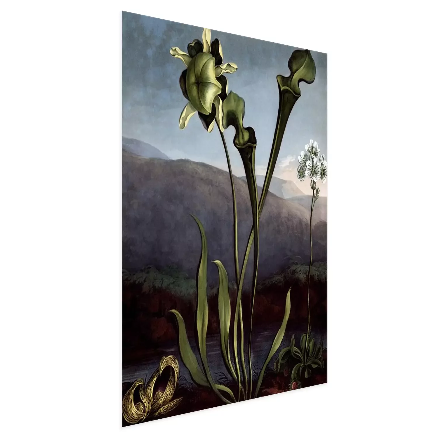 Poster : Fleurs à longues tiges sur fond de montagnes et d'eau