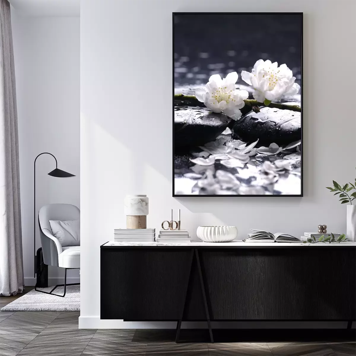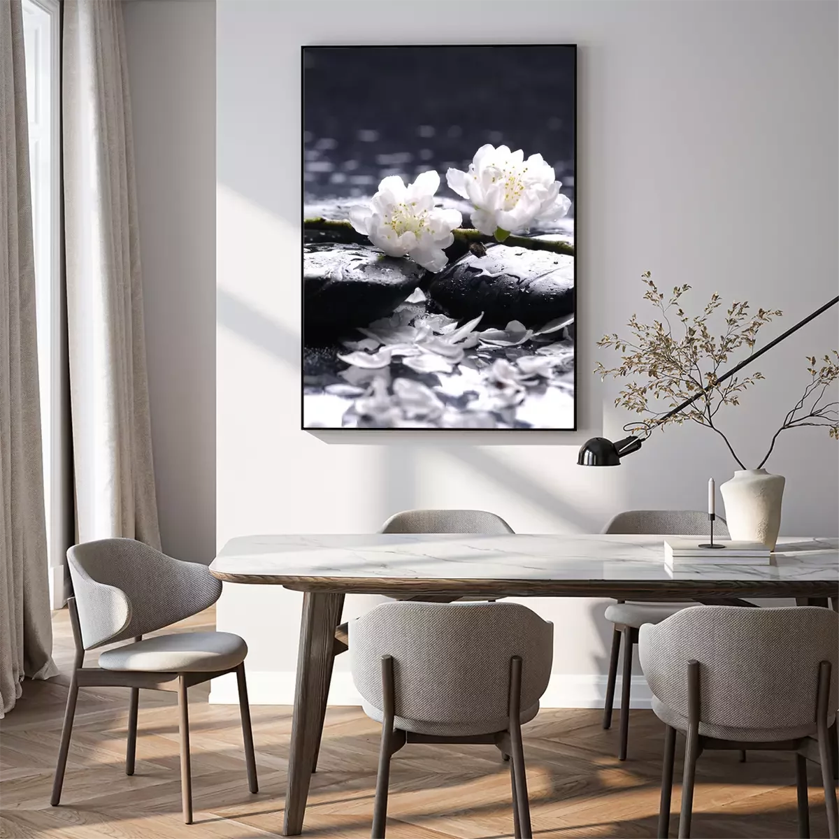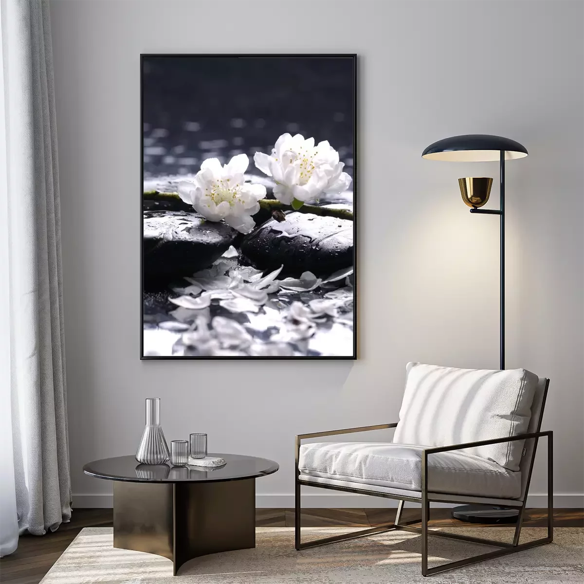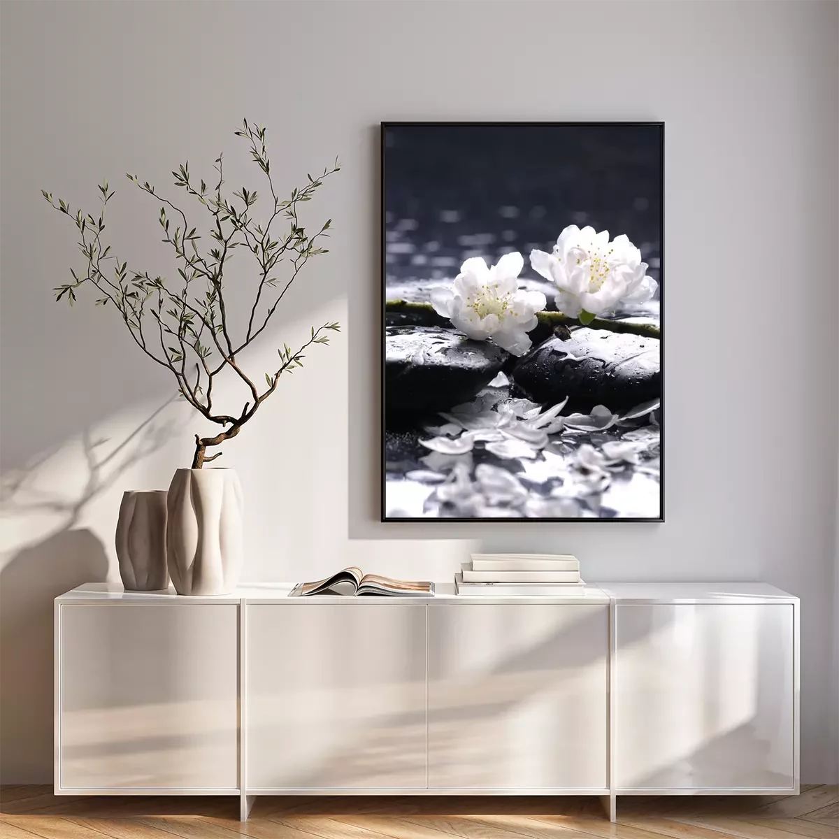 Poster : Fleurs blanches à base de pierres humides