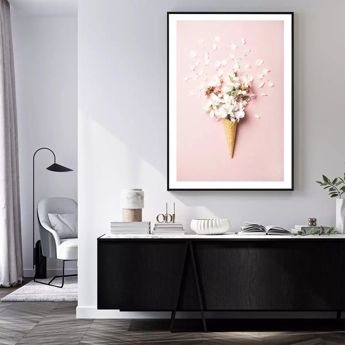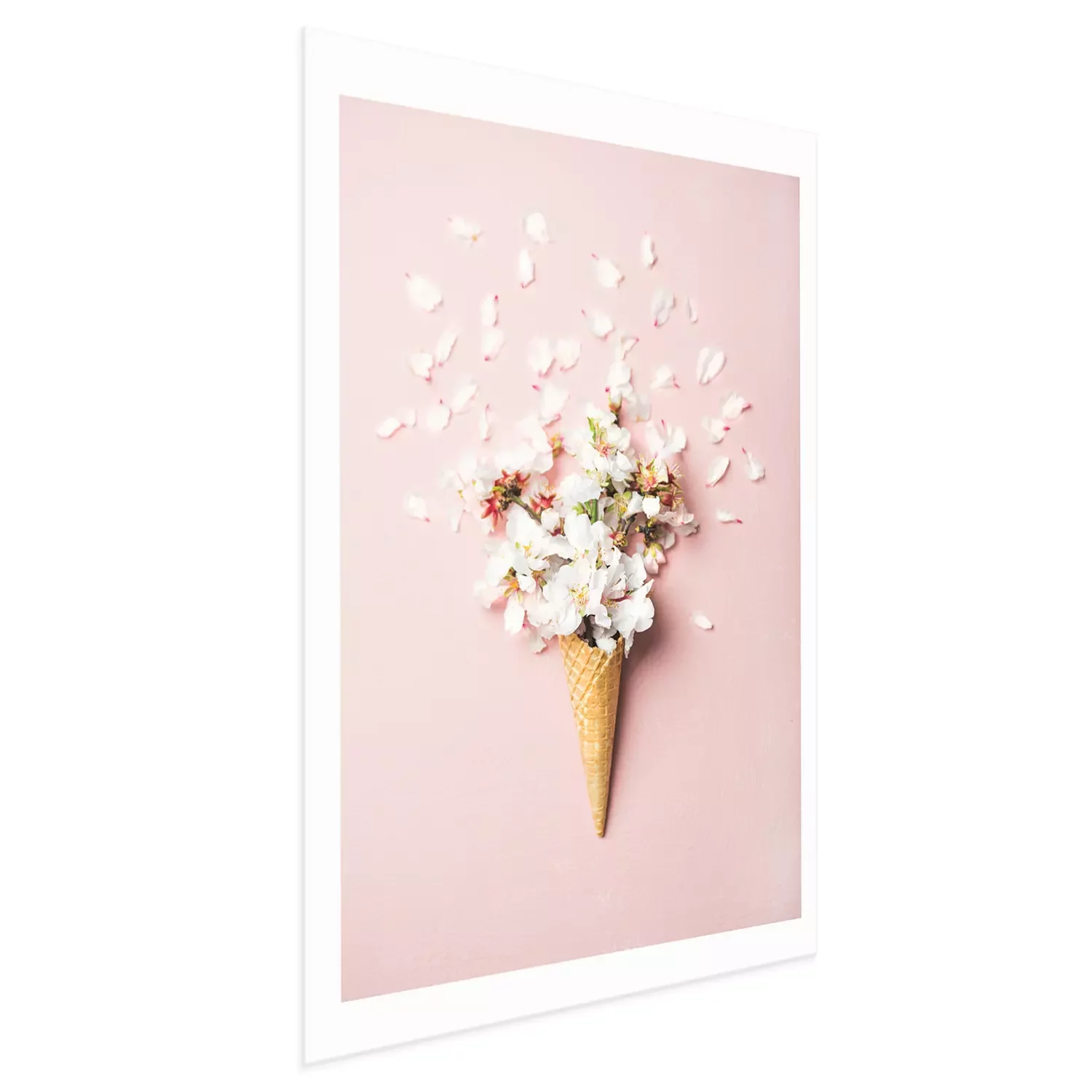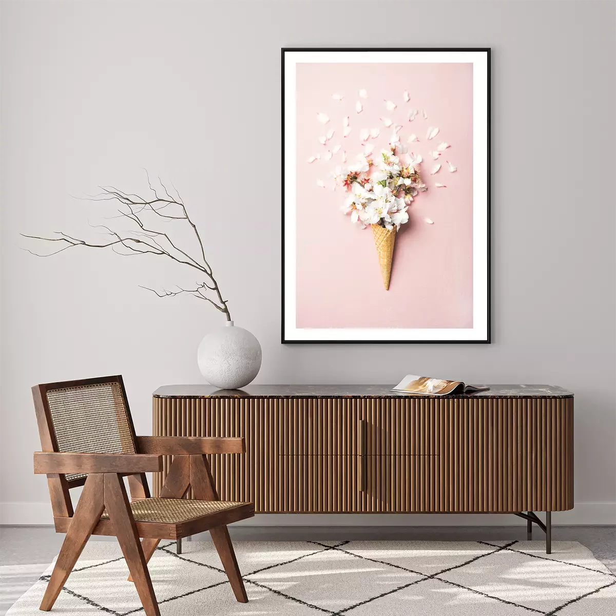Poster : Fleurs de cerisier dans un cornet gaufré sur fond rose