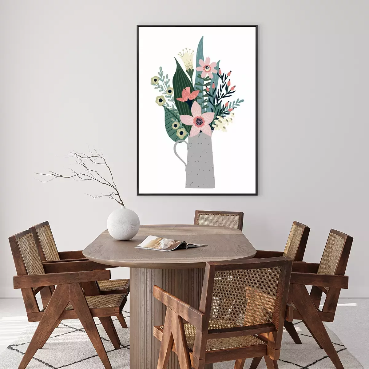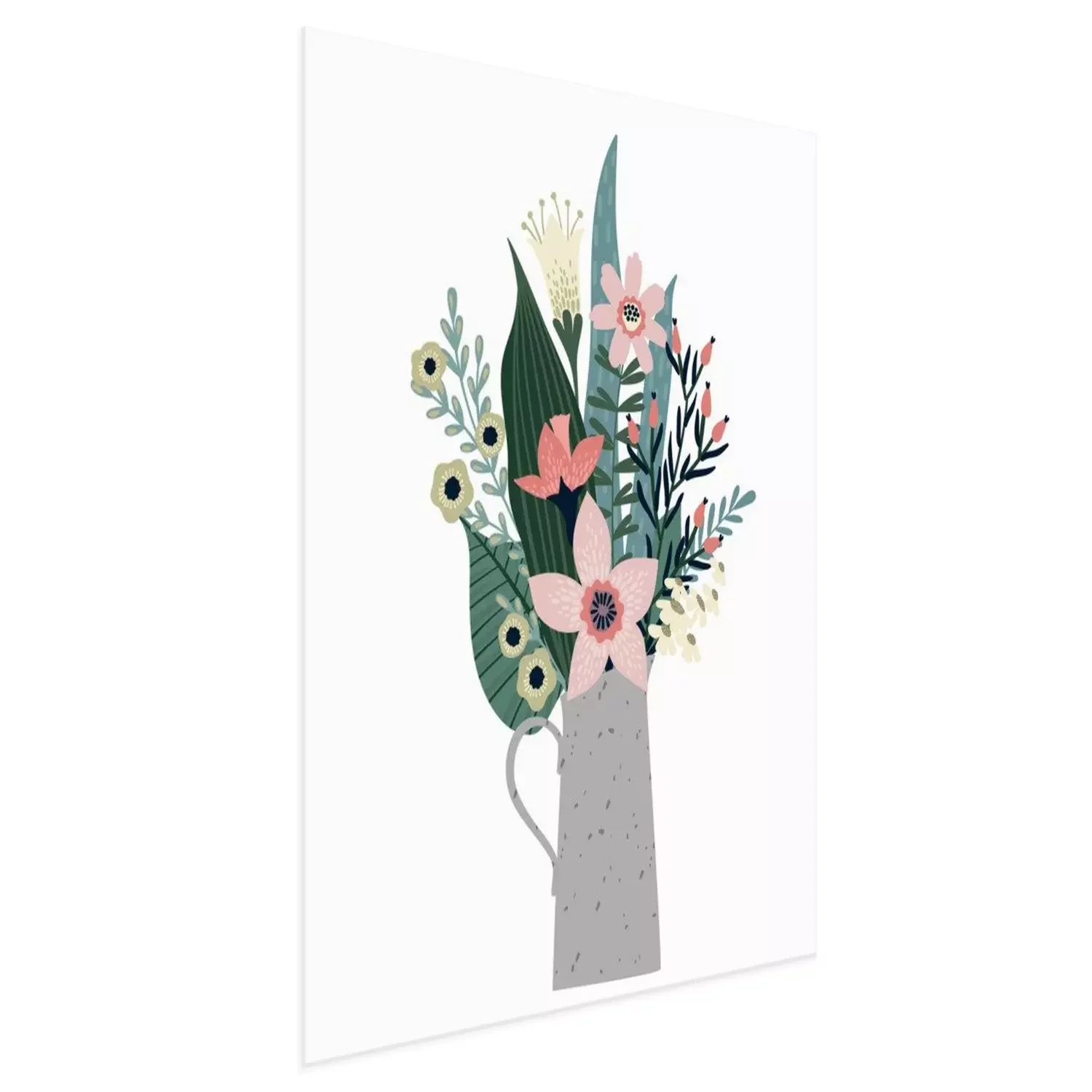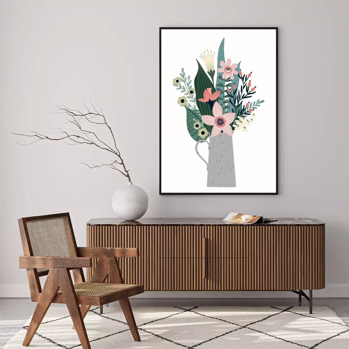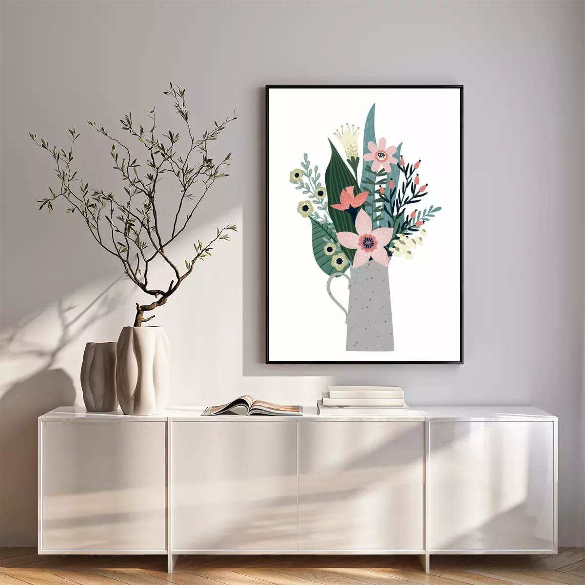 Poster  Fleurs multicolores et grandes feuilles dans un vase