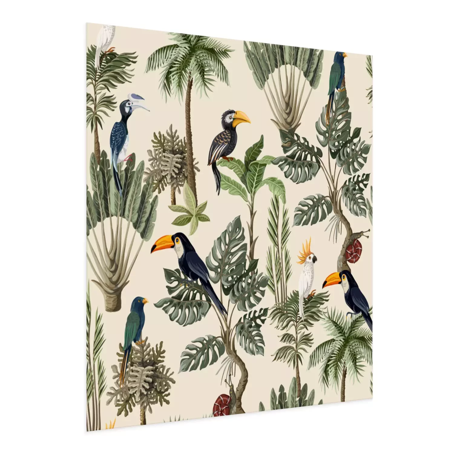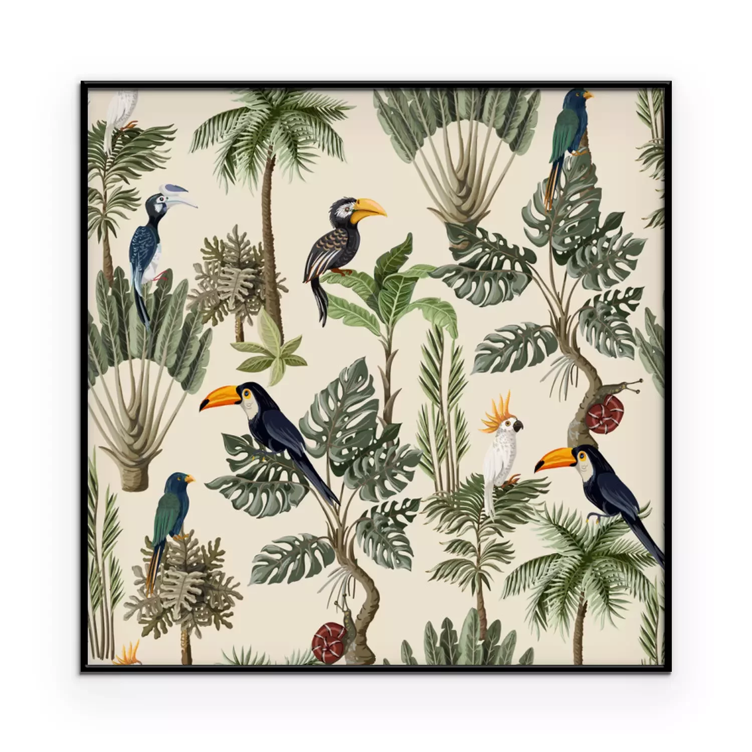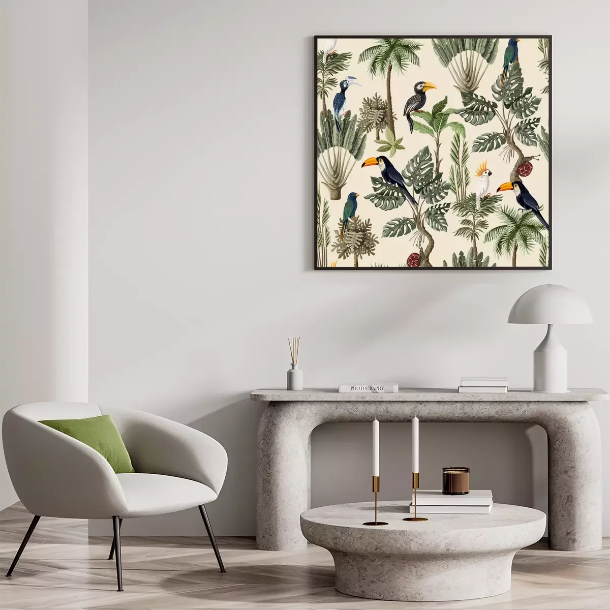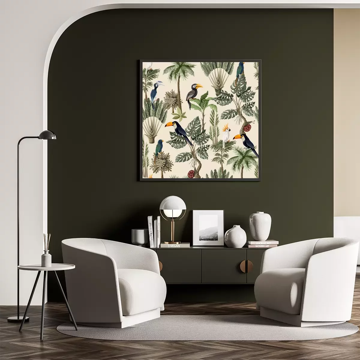 Seamless pattern with exotic trees and animals. Interior vintage wallpaper.