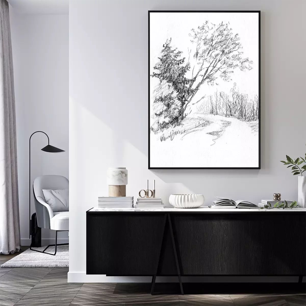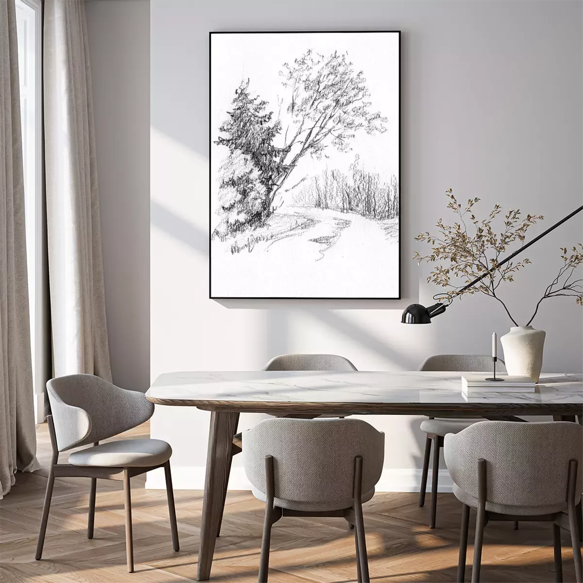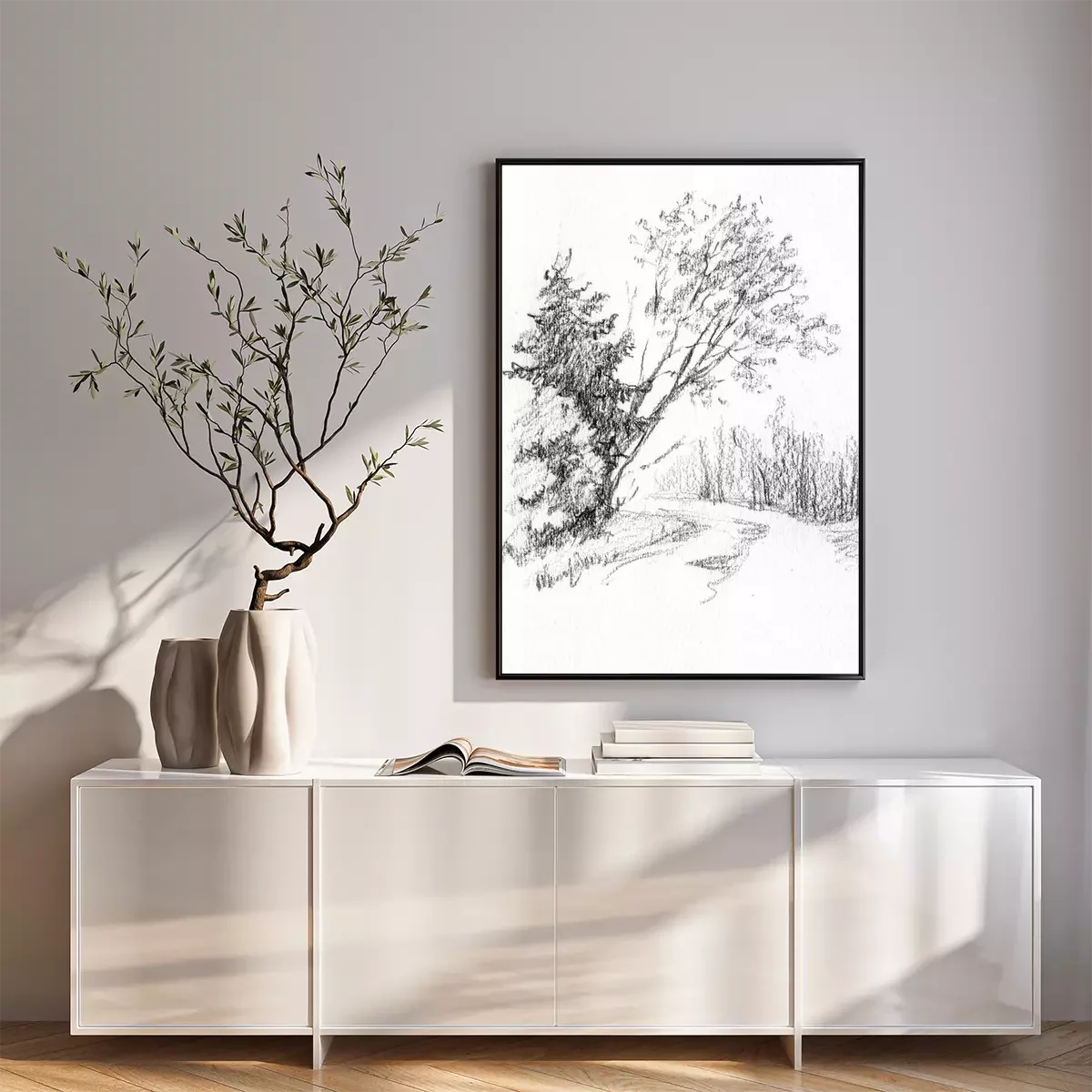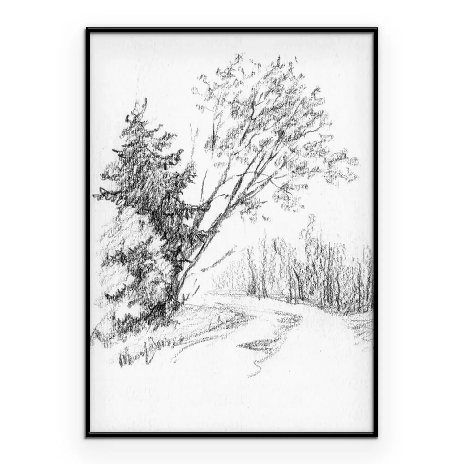Poster : Forêt. Bouleau et épinette. Dessin au crayon sur papier. Dessiné à la main. Pour la décoration intérieure, carte de voeux.