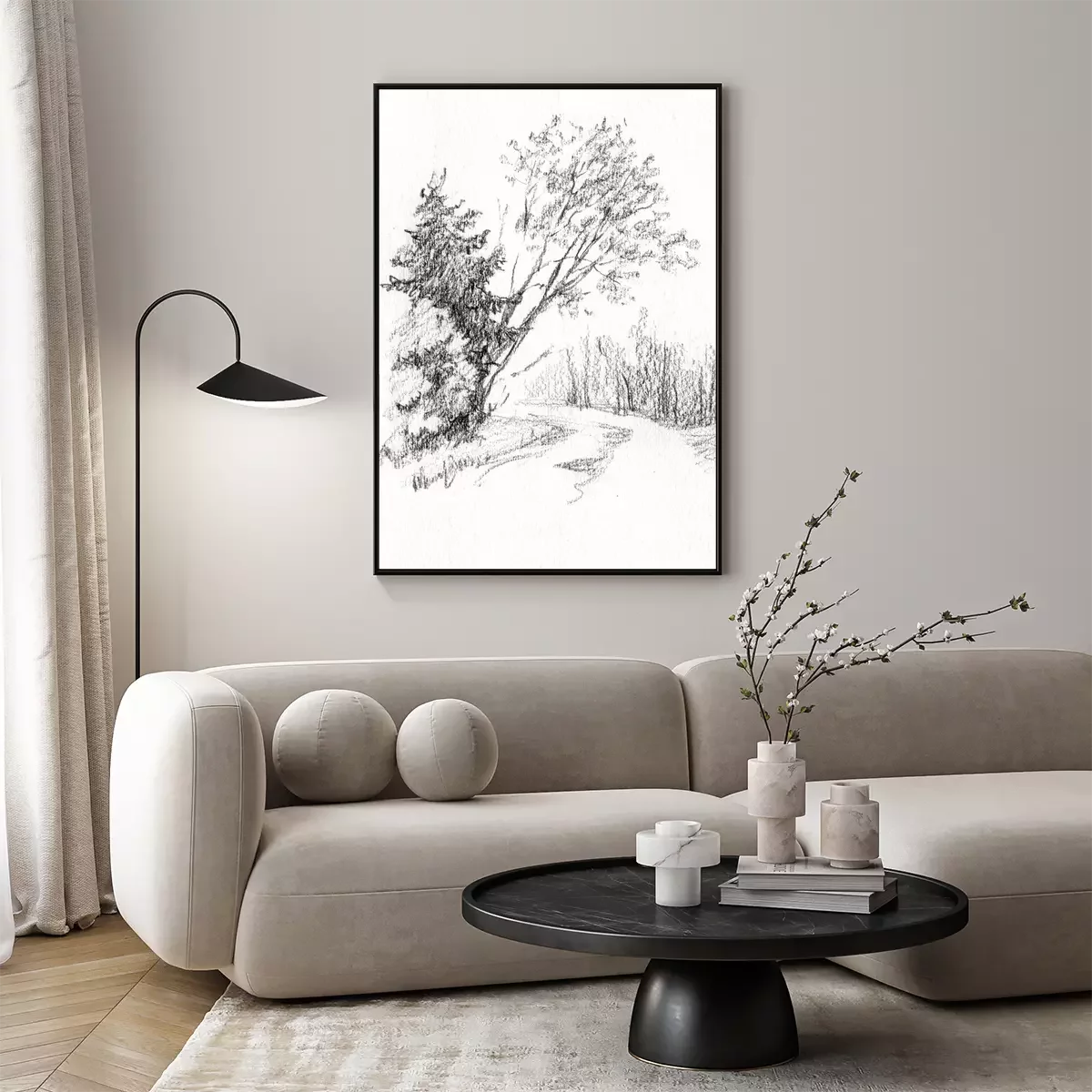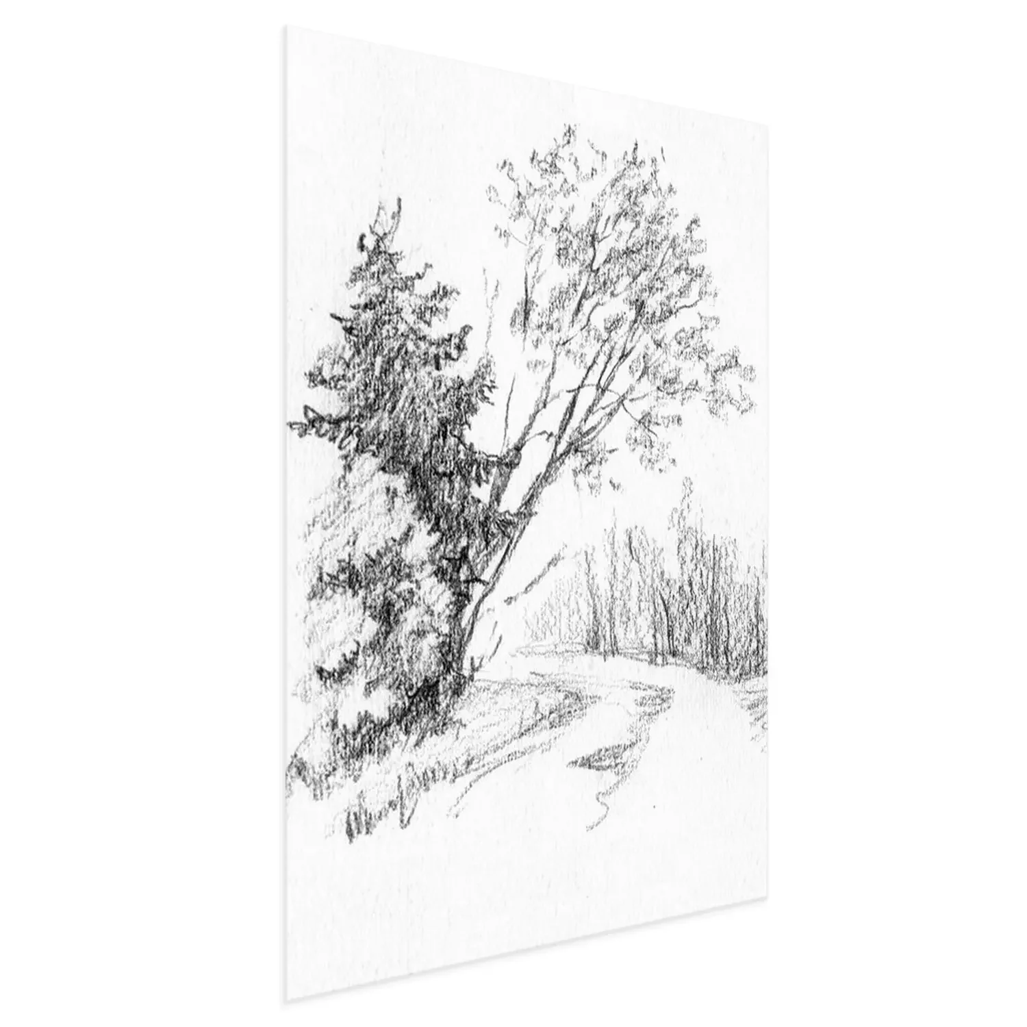 Poster  Forêt. Bouleau et épinette. Dessin au crayon sur papier. Dessiné à la main. Pour la décoration intérieure, carte de voeux.