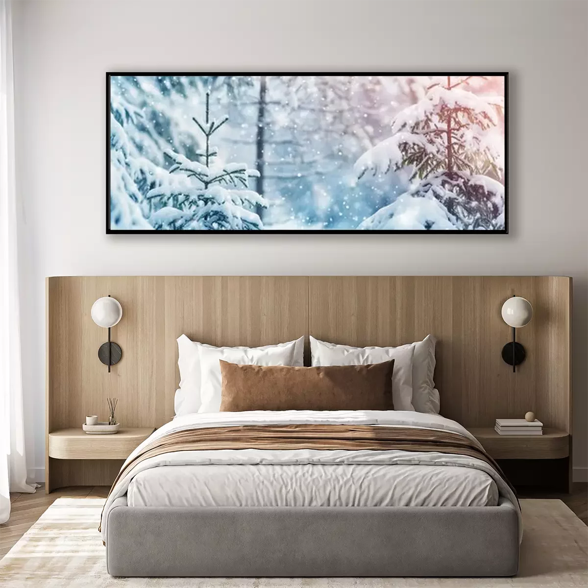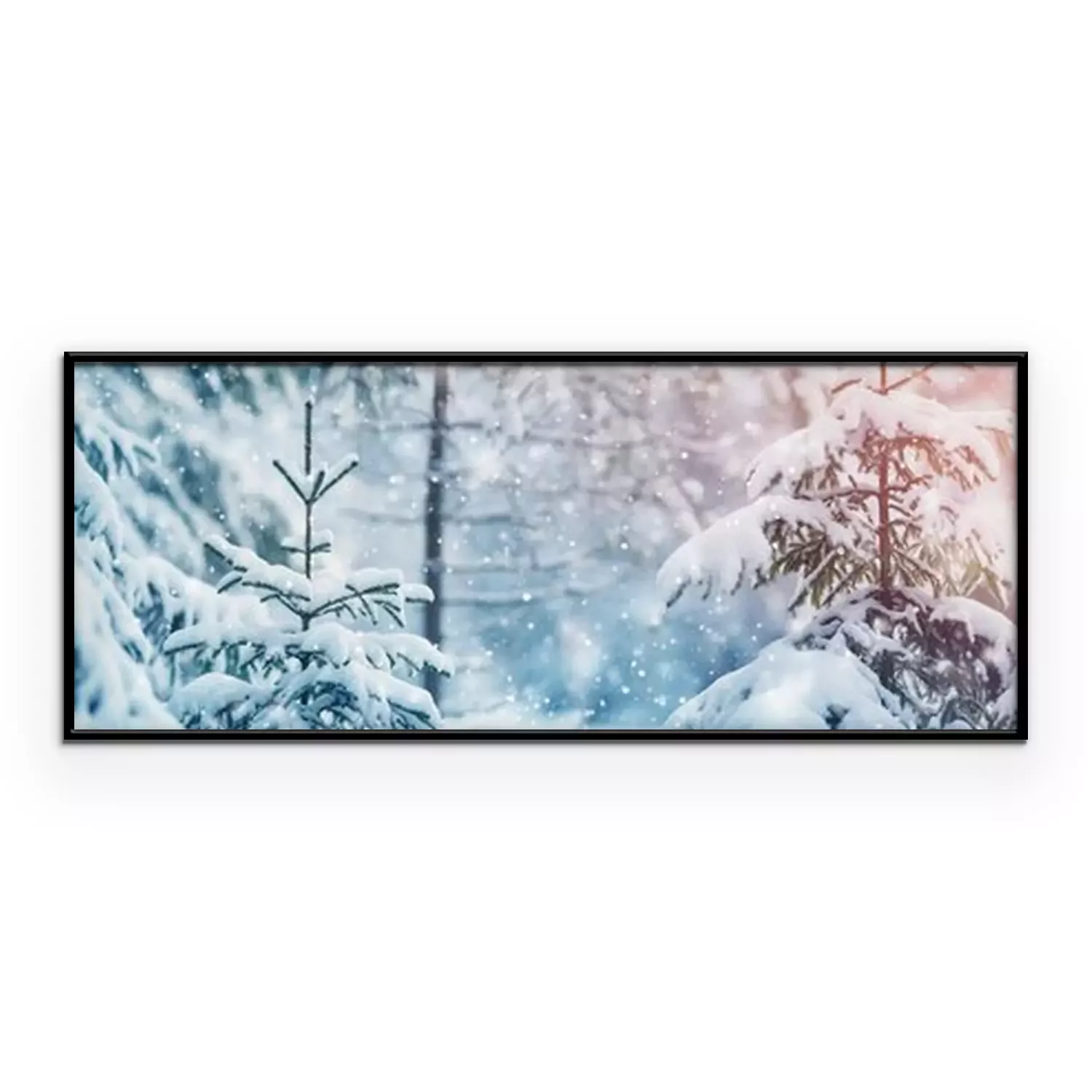 Des arbres de pin recouverts de neige le soir glacé. Beau panorama hivernal