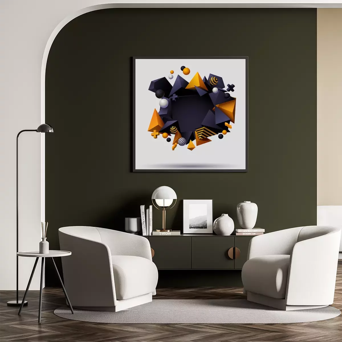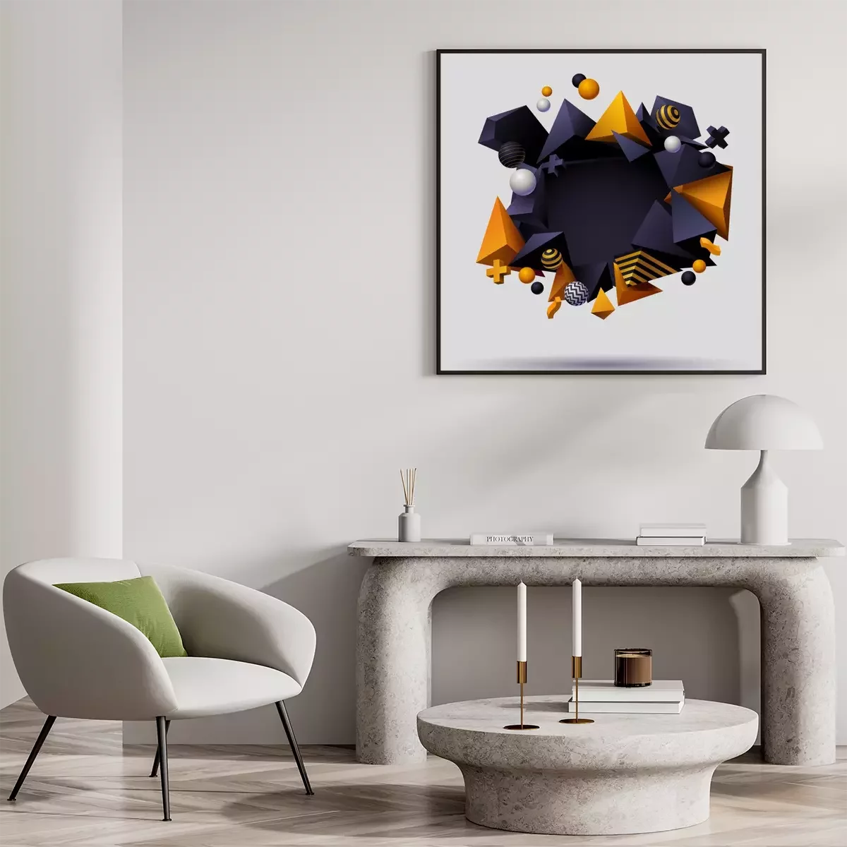 Poster  Formes géométriques abstraites 3D. Design de fond moderne avec la place pour le texte. Jaune, blanc, noir et or. Vecteur EPS10