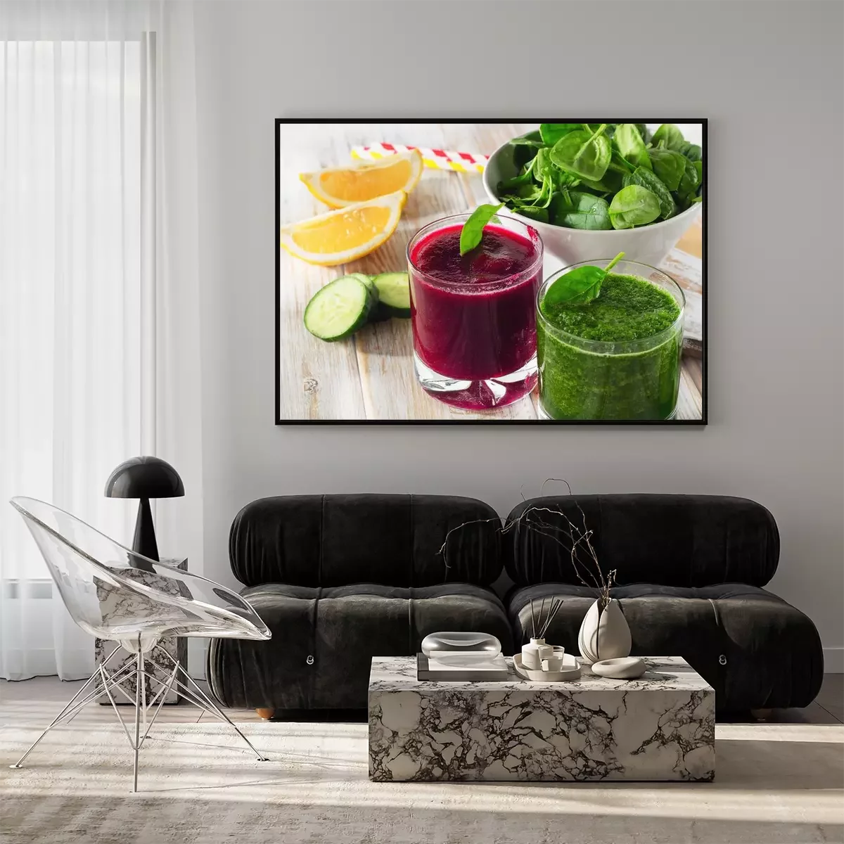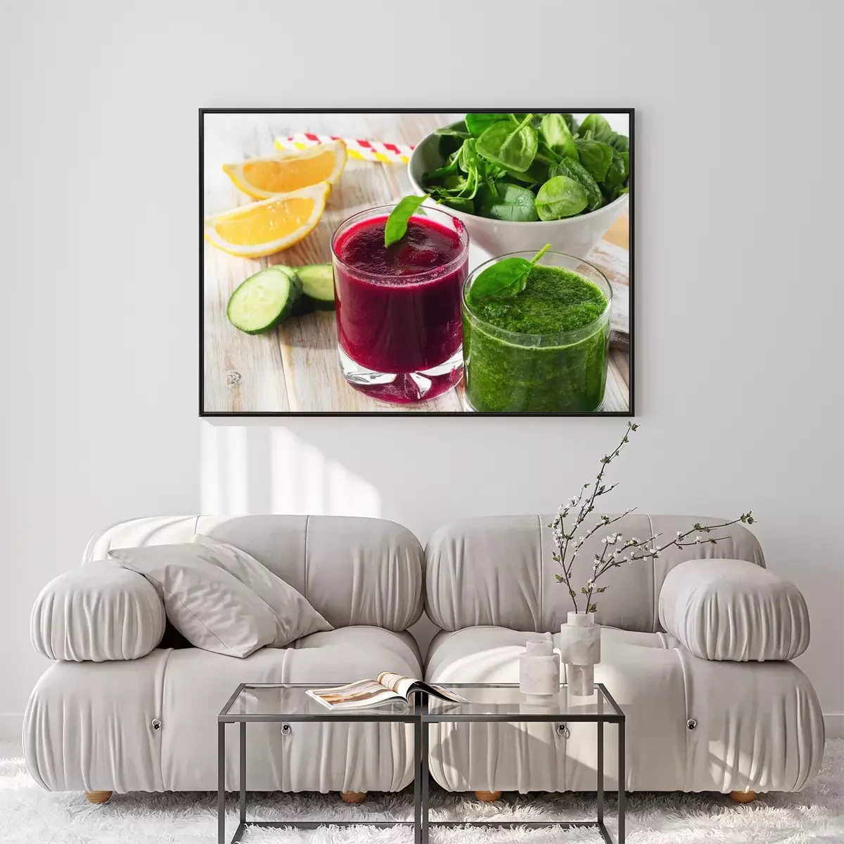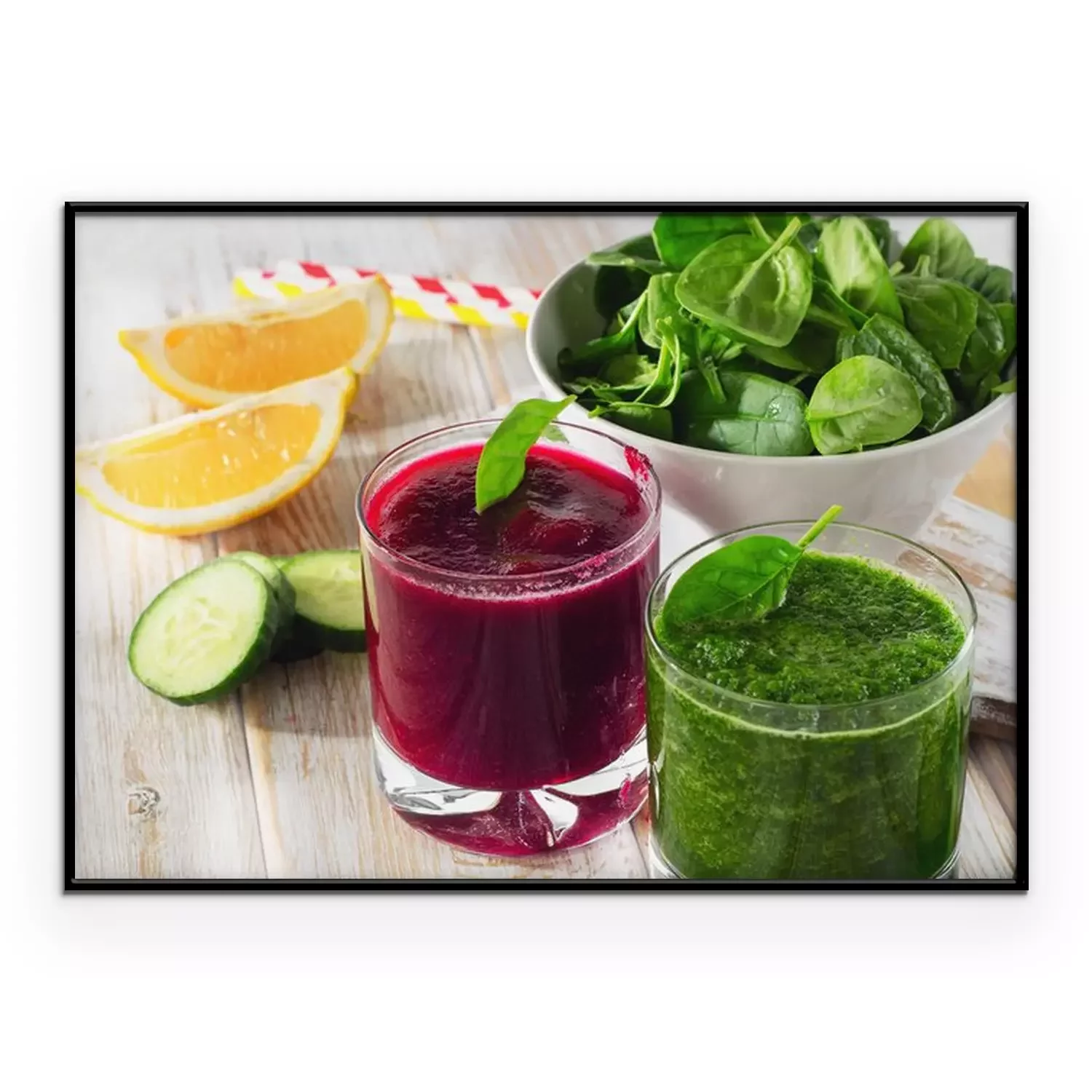 Poster  Fraîchement pressé jus de légumes sur une table en bois