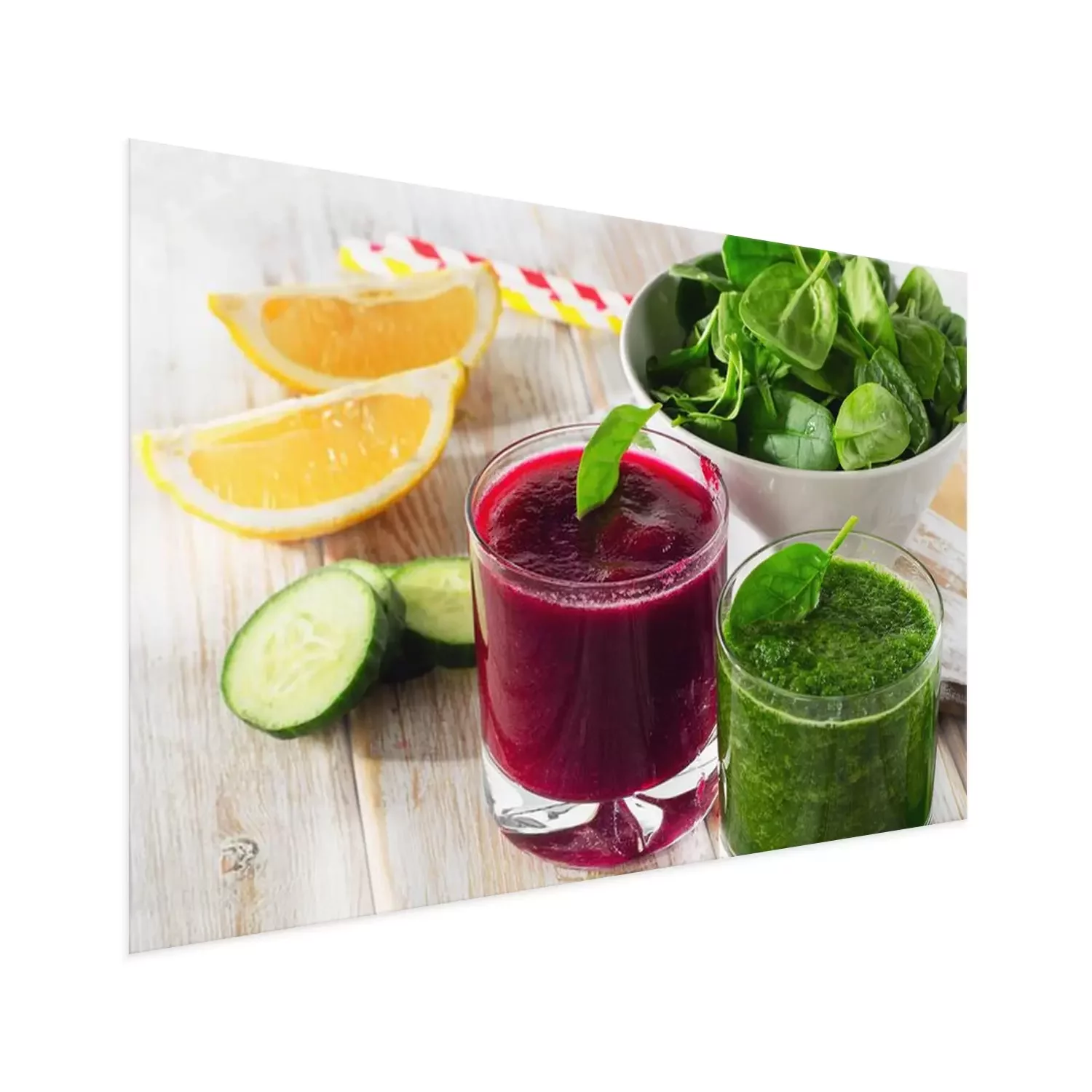Poster : Fraîchement pressé jus de légumes sur une table en bois