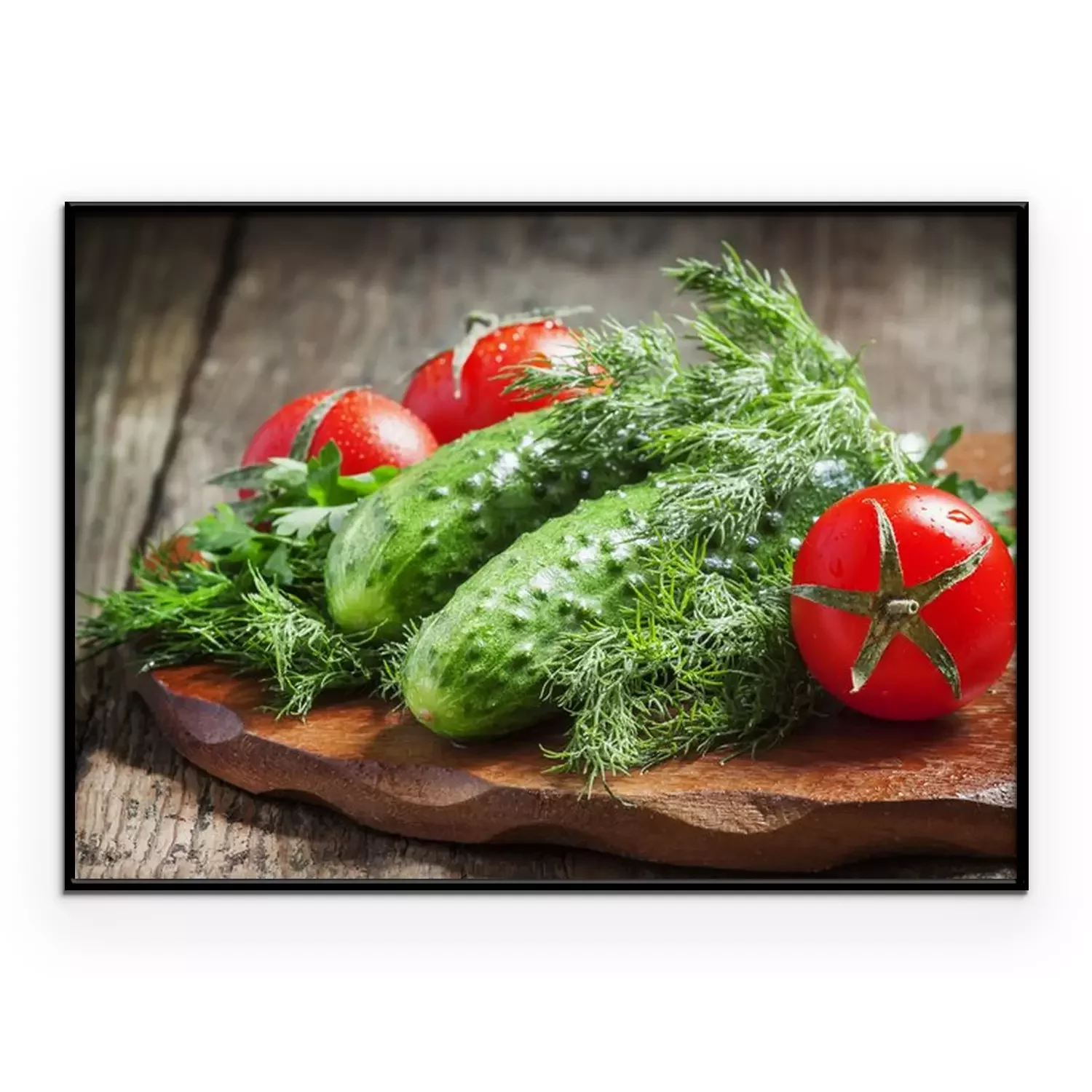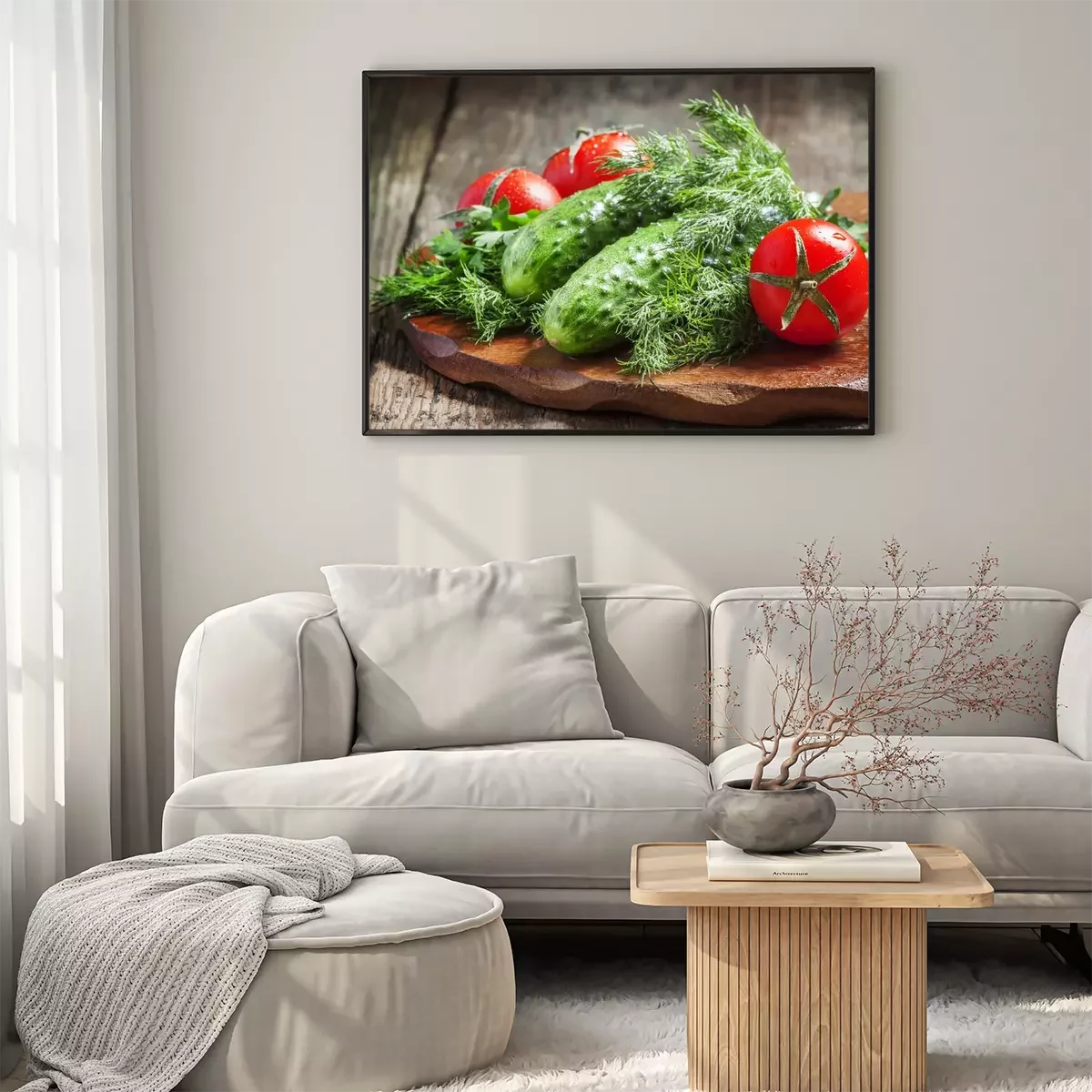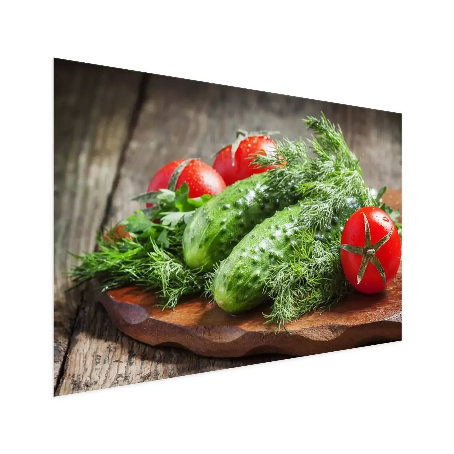 Poster  Frais, concombres, tomates, aneth, persil, vieux, bois, ba