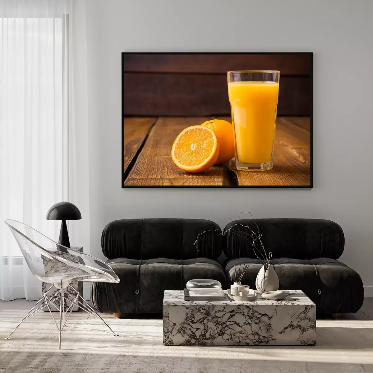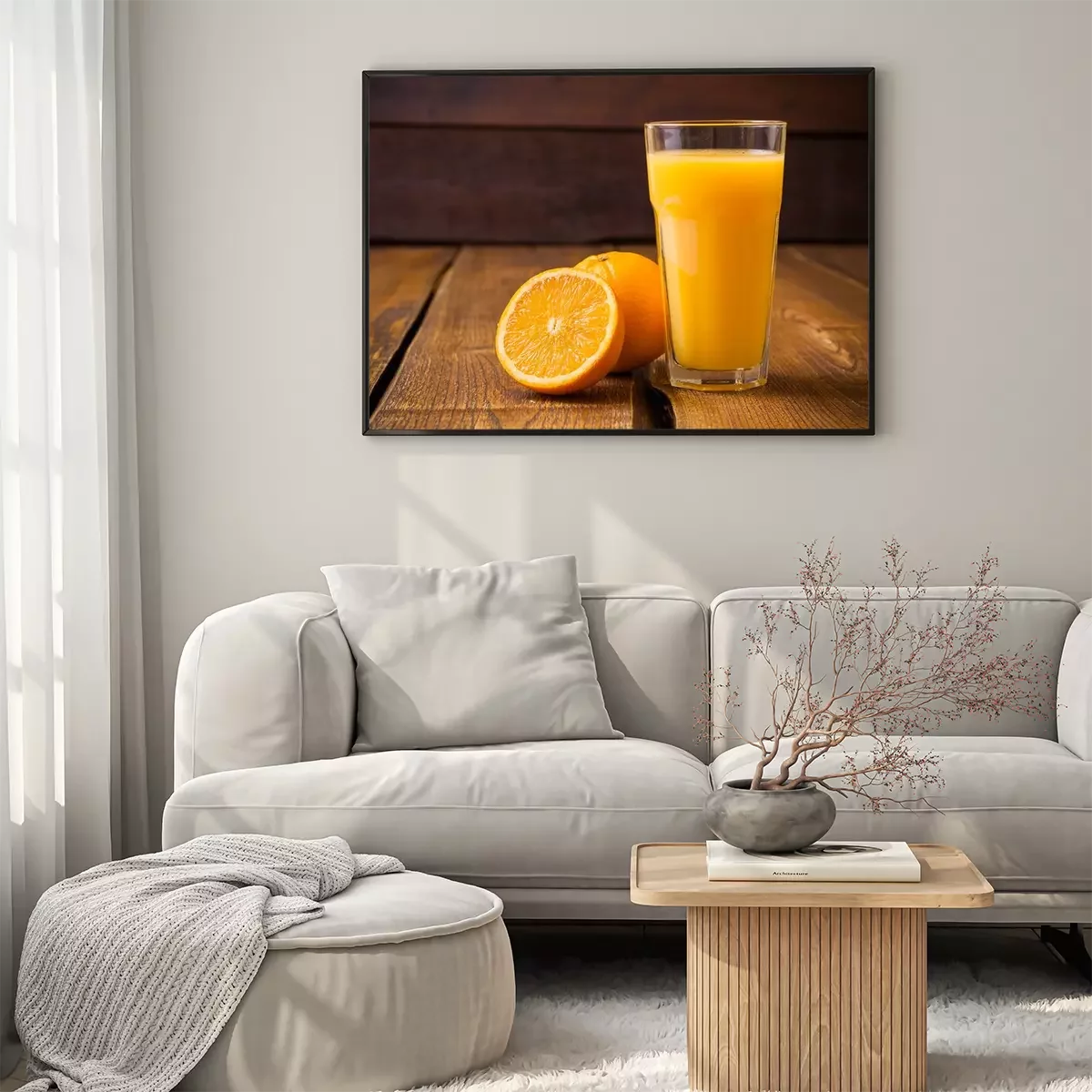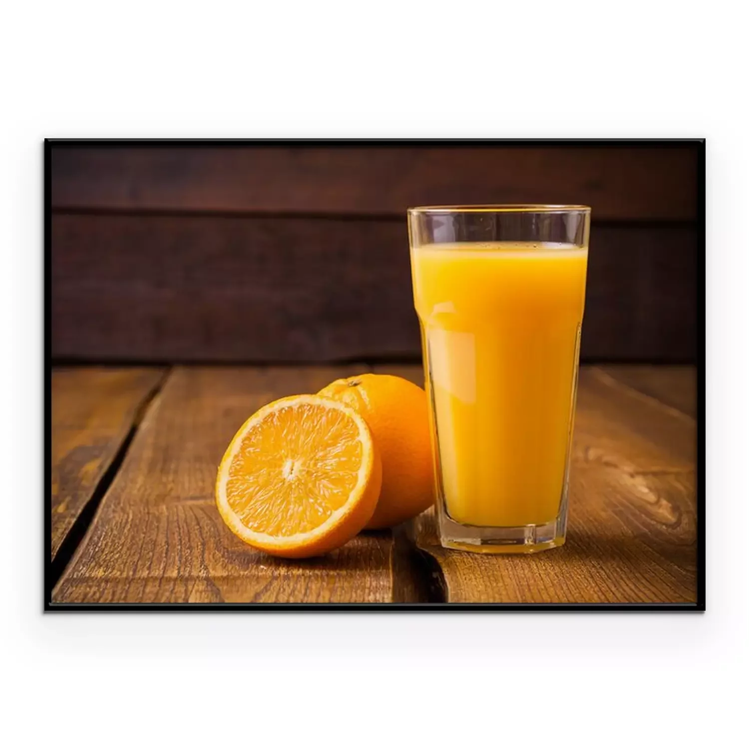 Poster  Fruits Orange et verre de jus sur fond de bois brun