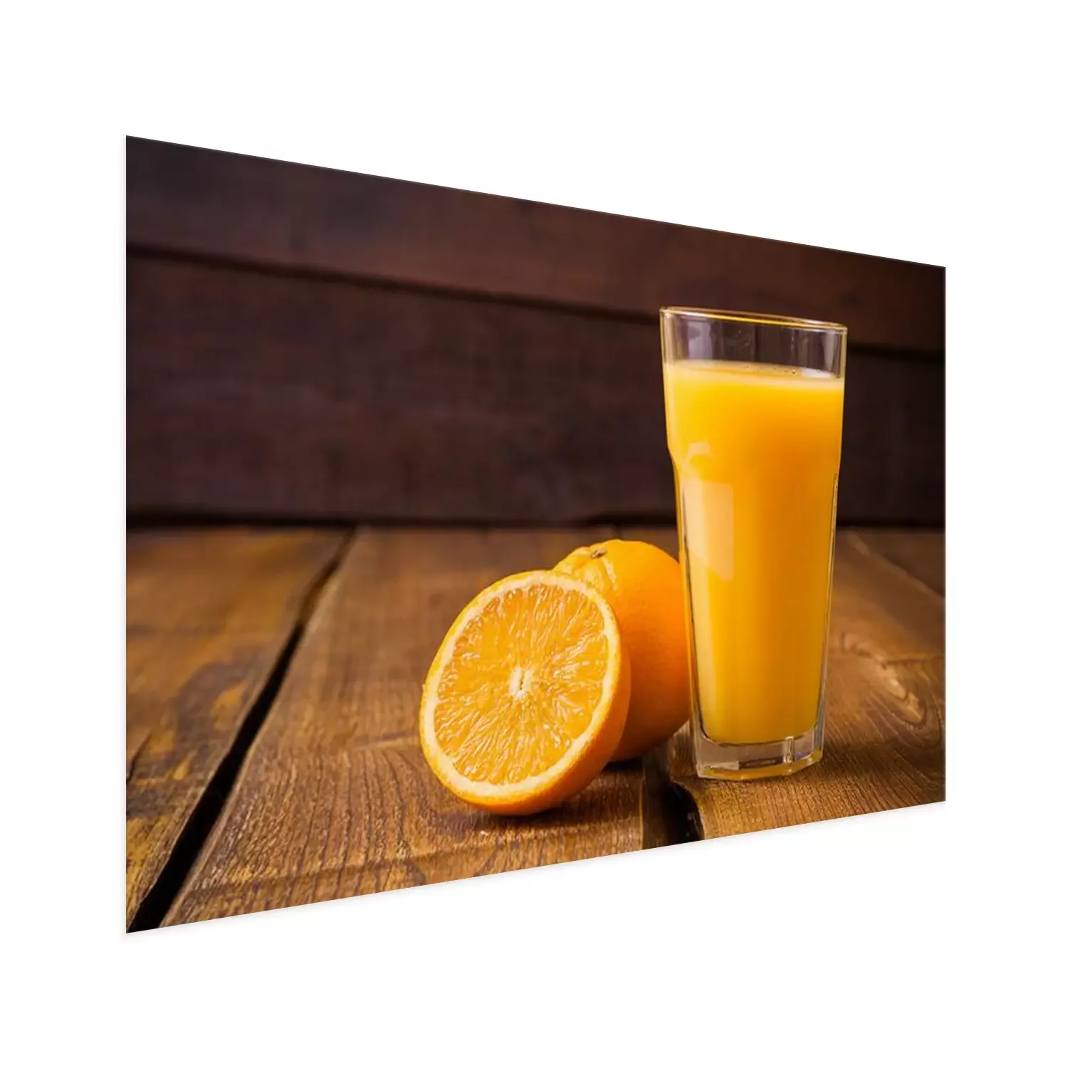 Poster : Fruits Orange et verre de jus sur fond de bois brun