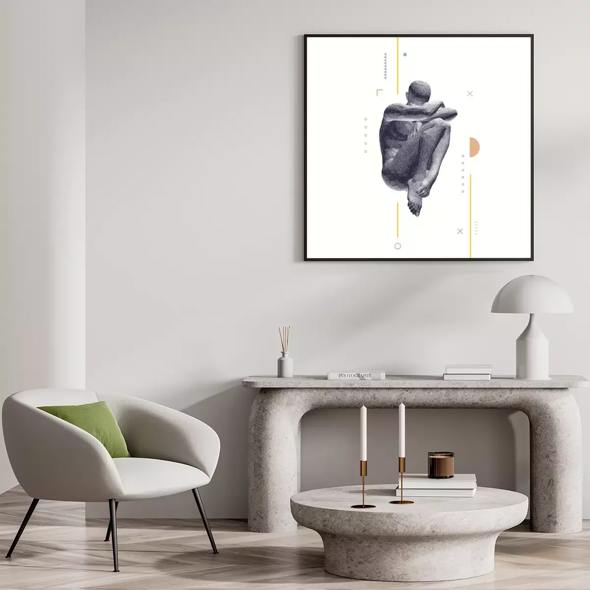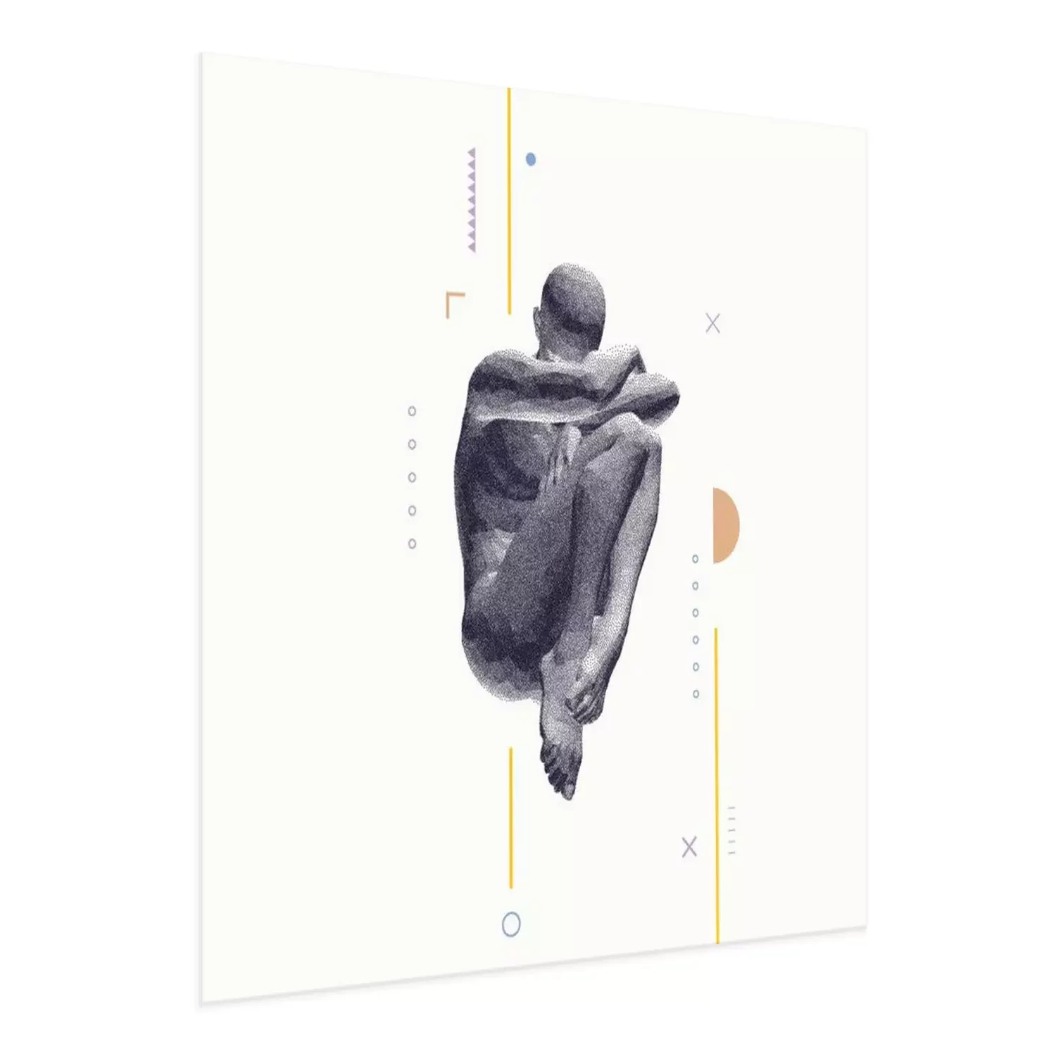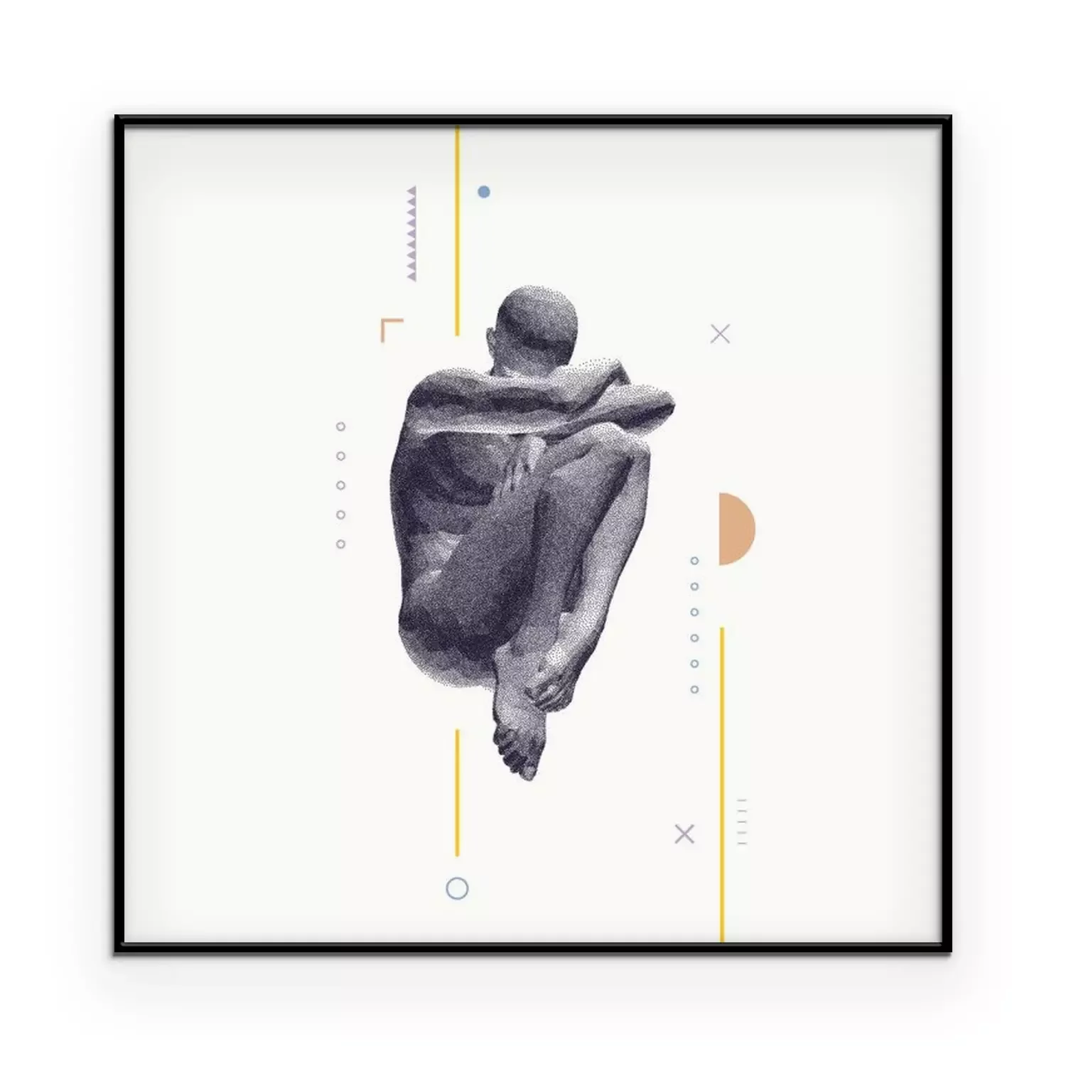 Poster : Full length view of sad stressed man sitting with hands on knees. Time for reflection. Man thinks about a problem. Despair, depression, hopelessness or addiction concept. 3D vector illustration.