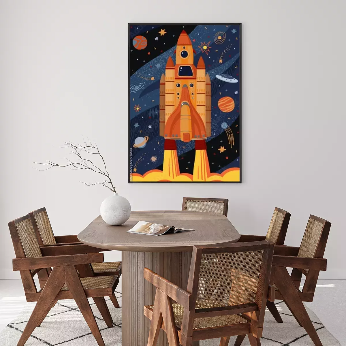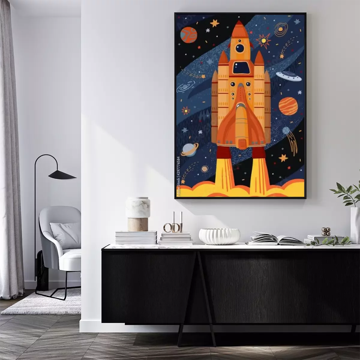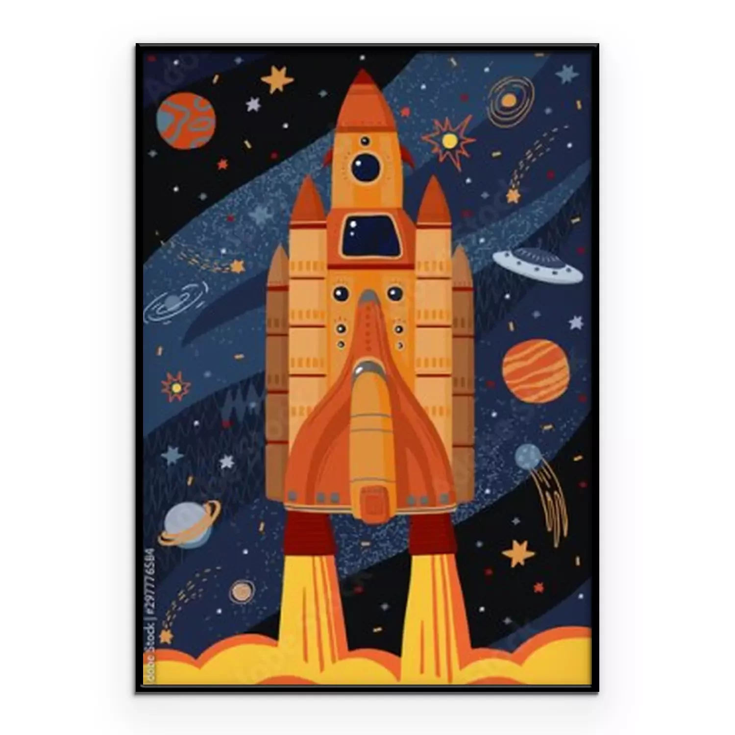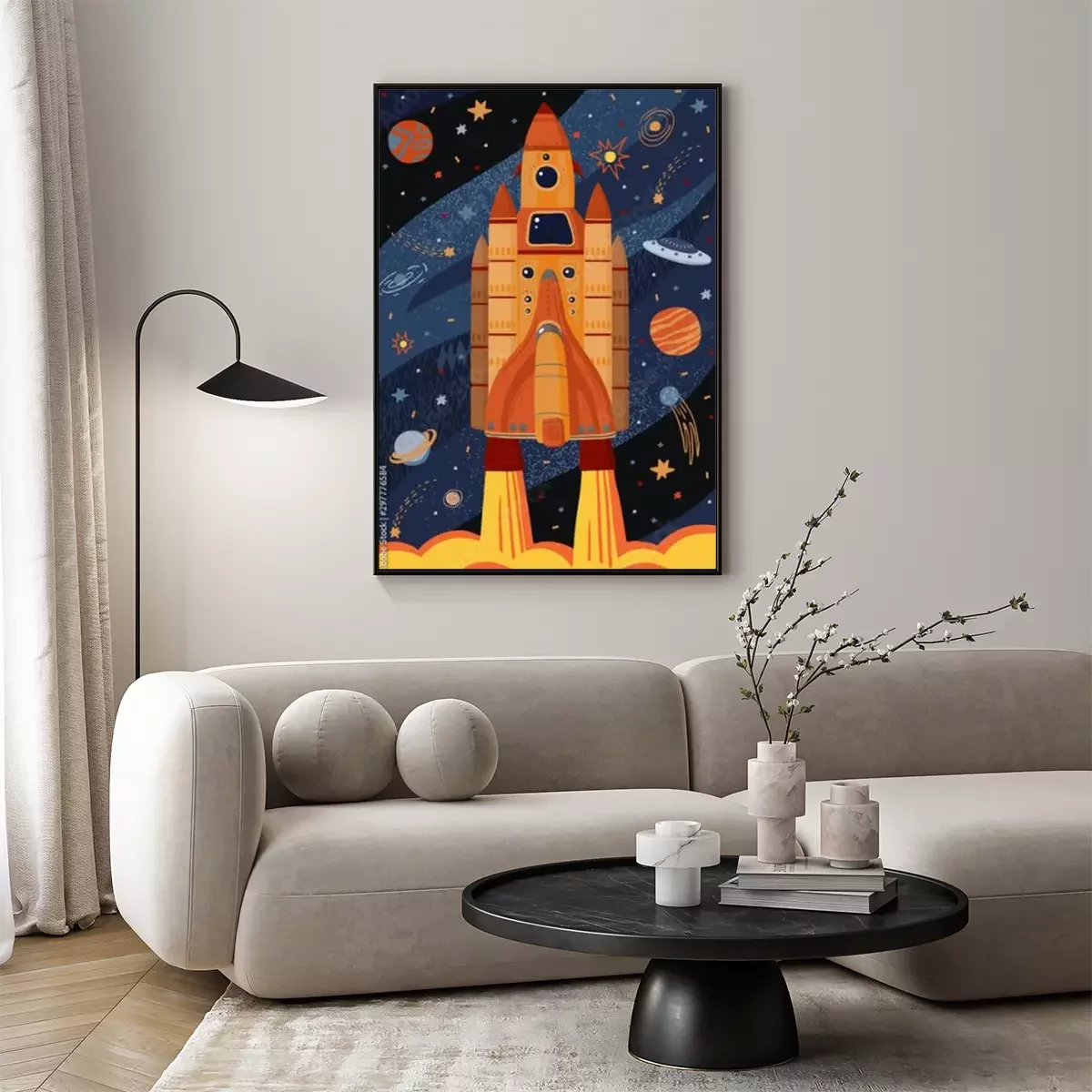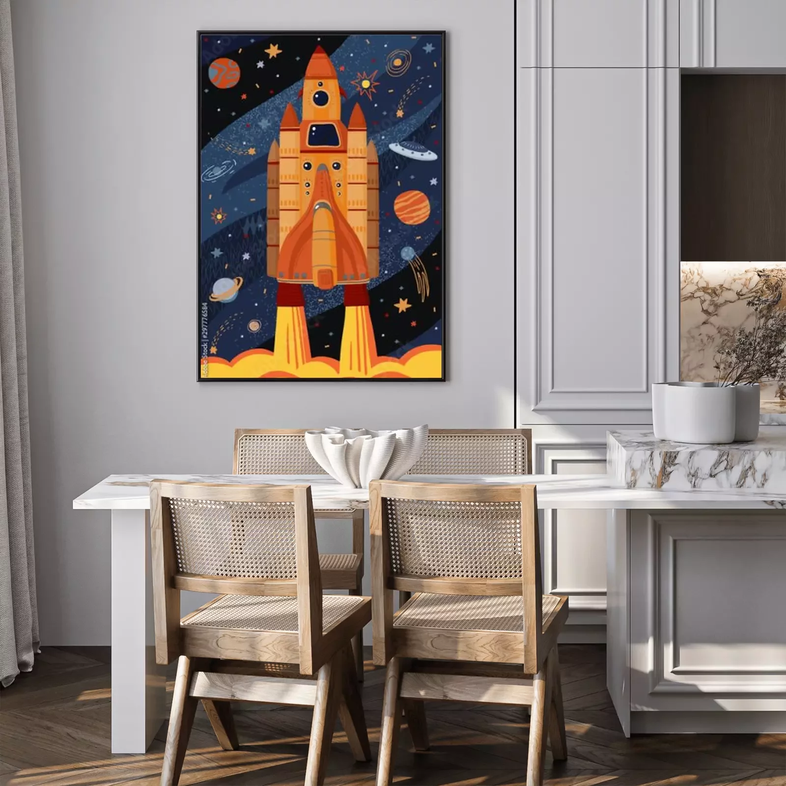 Une décoration originale ne rime pas obligatoirement avec une forme extraordinaire – vous pouvez obtenir un tel résultat en optant pour un poster. L’espace est un motif populaire qui offre une multitude de possibilités décoratives. Ce poster sera une décoration idéale pour la chambre d’un garçon, où son style dessiné façon cartoon apportera une ambiance ludique et évoquera ses dessins animés préférés. Pour décorer le coin-lit dans une telle chambre, nous vous conseillons de jouer avec les différents éléments représentés sur ce poster. L’espace et les planètes qui l’ornent peuvent être mis en valeur grâce à des accessoires tels qu’une lampe de chevet en forme de lune ou une parure de lit aux motifs galactiques. De plus, grâce à son contraste de couleurs, ce poster fusée dynamisera la pièce et deviendra l’un des éléments décoratifs centraux. Cet effet peut être accentué en accrochant la décoration plus bas sur le mur, afin de créer un arrière-plan idéal pour jouer. Par ailleurs, le motif dynamique de l’illustration en fait également un excellent poster pour une chambre d’adolescent. L’espace, représenté dans un style cartoon, rend cette illustration à la fois originale et ludique. Une fois encadrée, elle pourra être posée sur une étagère entre des livres et des disques, ou encore accrochée près de l’espace dédié aux jeux vidéo. Une autre idée d’aménagement consiste à créer une galerie thématique sur le mur. Placer cette illustration entre des photographies de l’espace ou d’autres images similaires mettra en valeur ce poster dessin de manière créative. Il sera également du plus bel effet dans un cadre rouge ou jaune, qui viendra finaliser la composition et s’harmonisera parfaitement avec les couleurs de l’image. Cette disposition, combinant illustrations modernes et photographies classiques, donnera à la chambre d’adolescent une touche unique et personnelle. Enfin, ce poster fusée, présente également une couleur vive qui servira d’élément visuel lumineux dans la pièce. Un avantage qui mérite d’être mentionné, surtout si l’illustration est accrochée dans un intérieur relativement sombre.