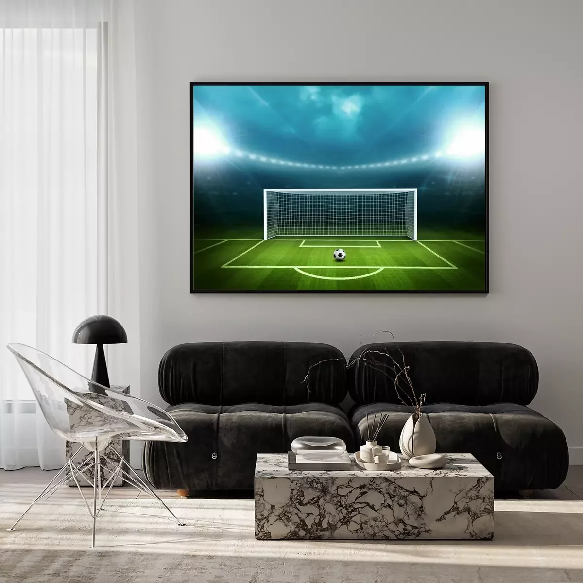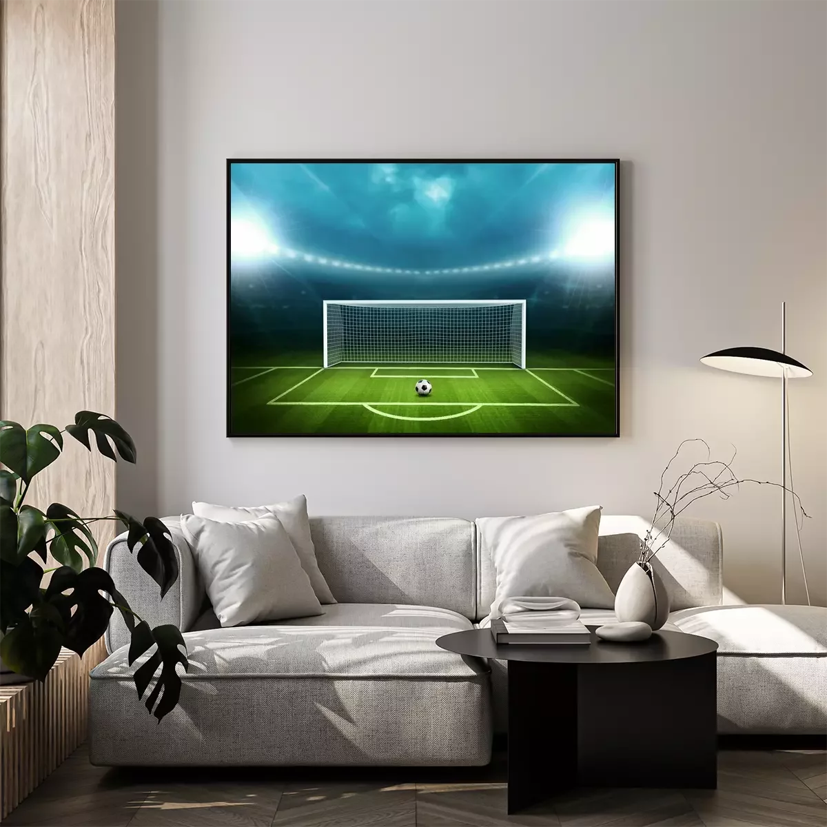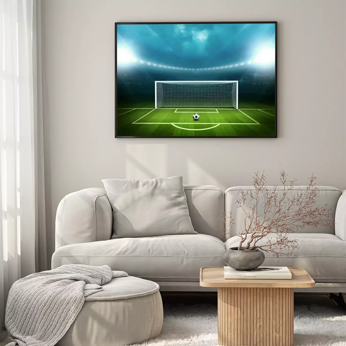 Poster  Gazon et but de football éclairés par des lampes halogènes