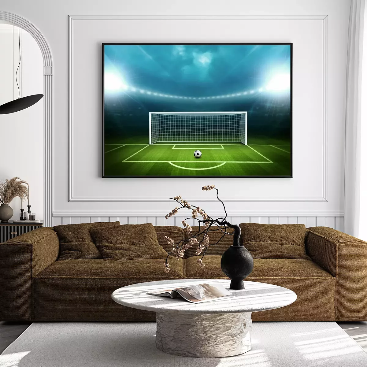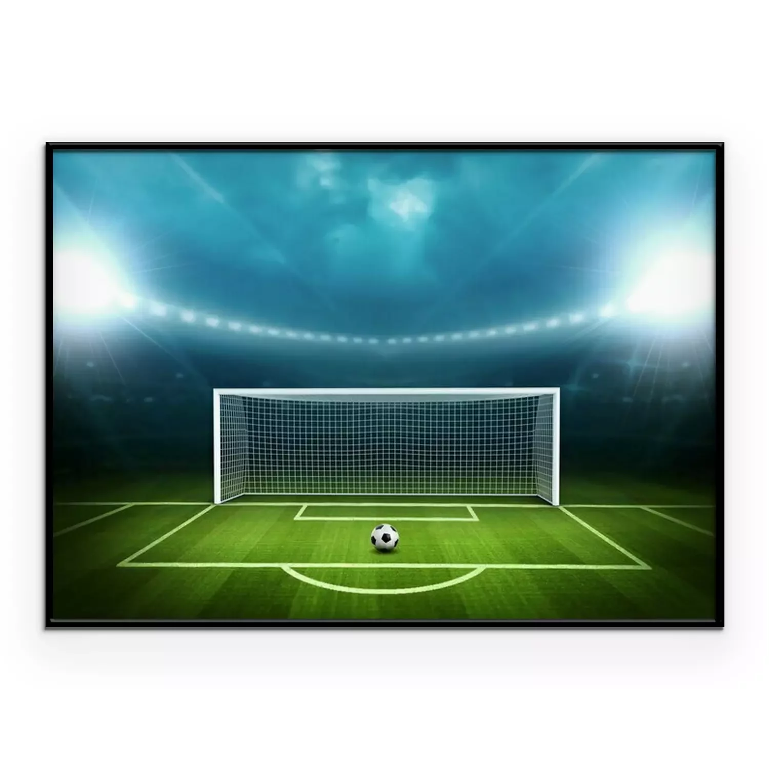 Poster : Gazon et but de football éclairés par des lampes halogènes
