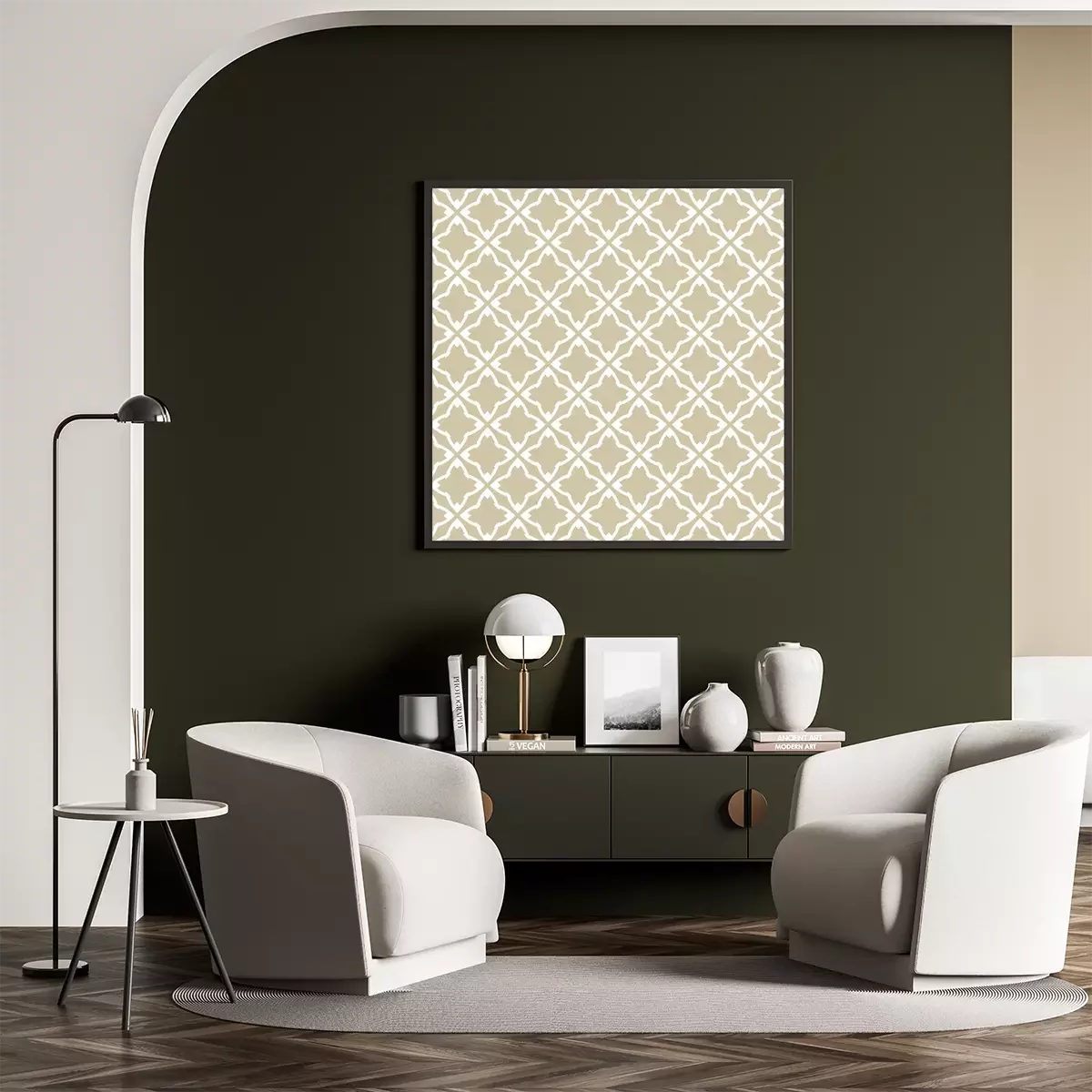 Poster : Golden vector geometric seamless pattern in oriental style. White and gold ornamental texture. Abstract background with diamond shapes, stars, flower silhouettes, grid, repeat tiles. Luxury design
