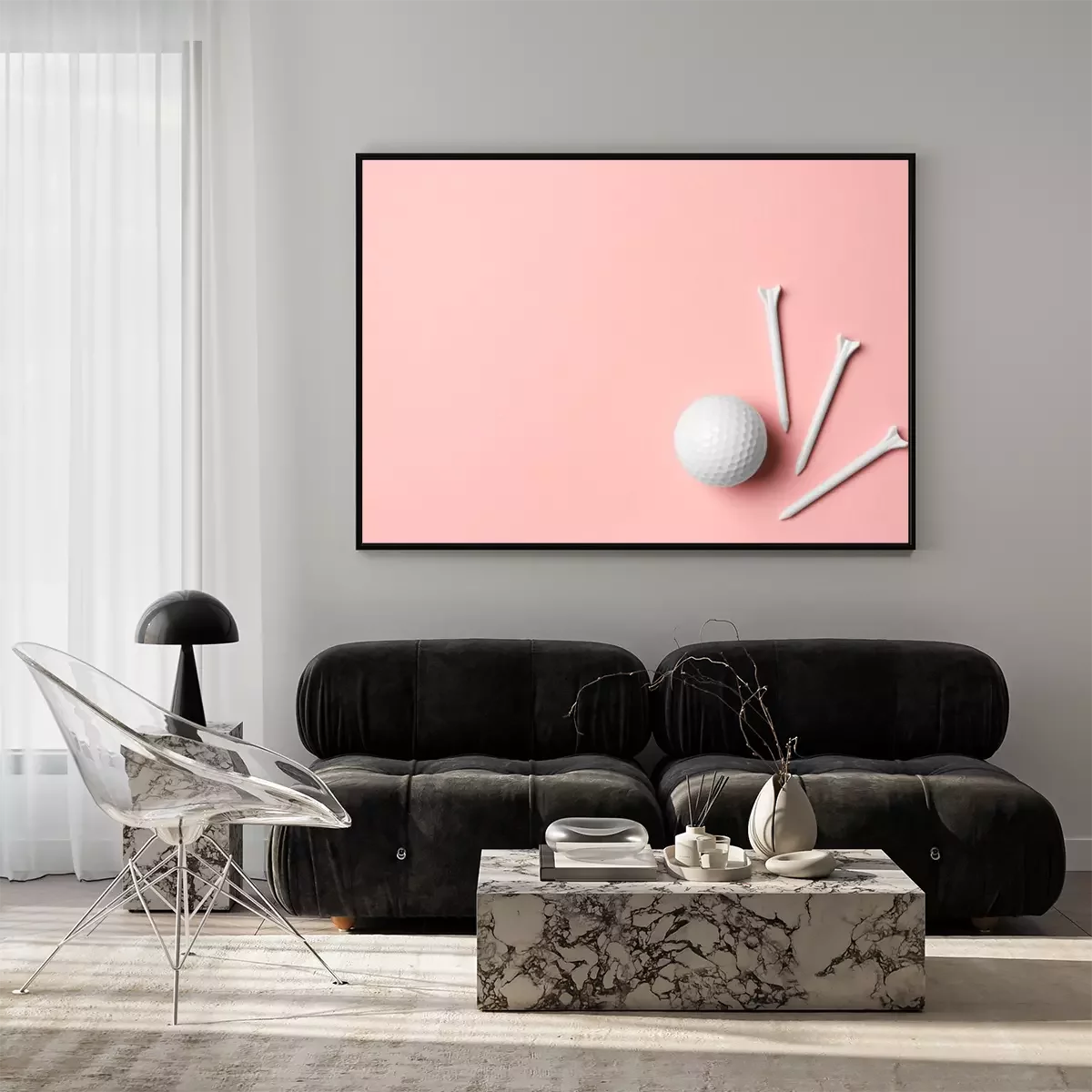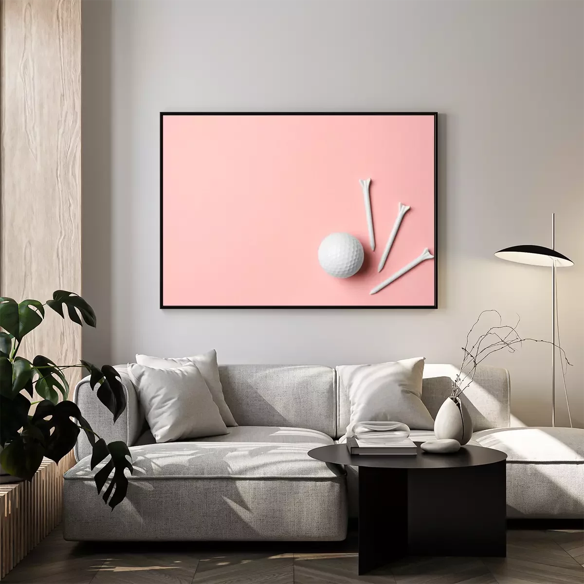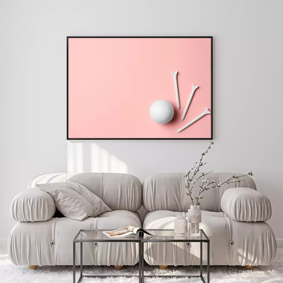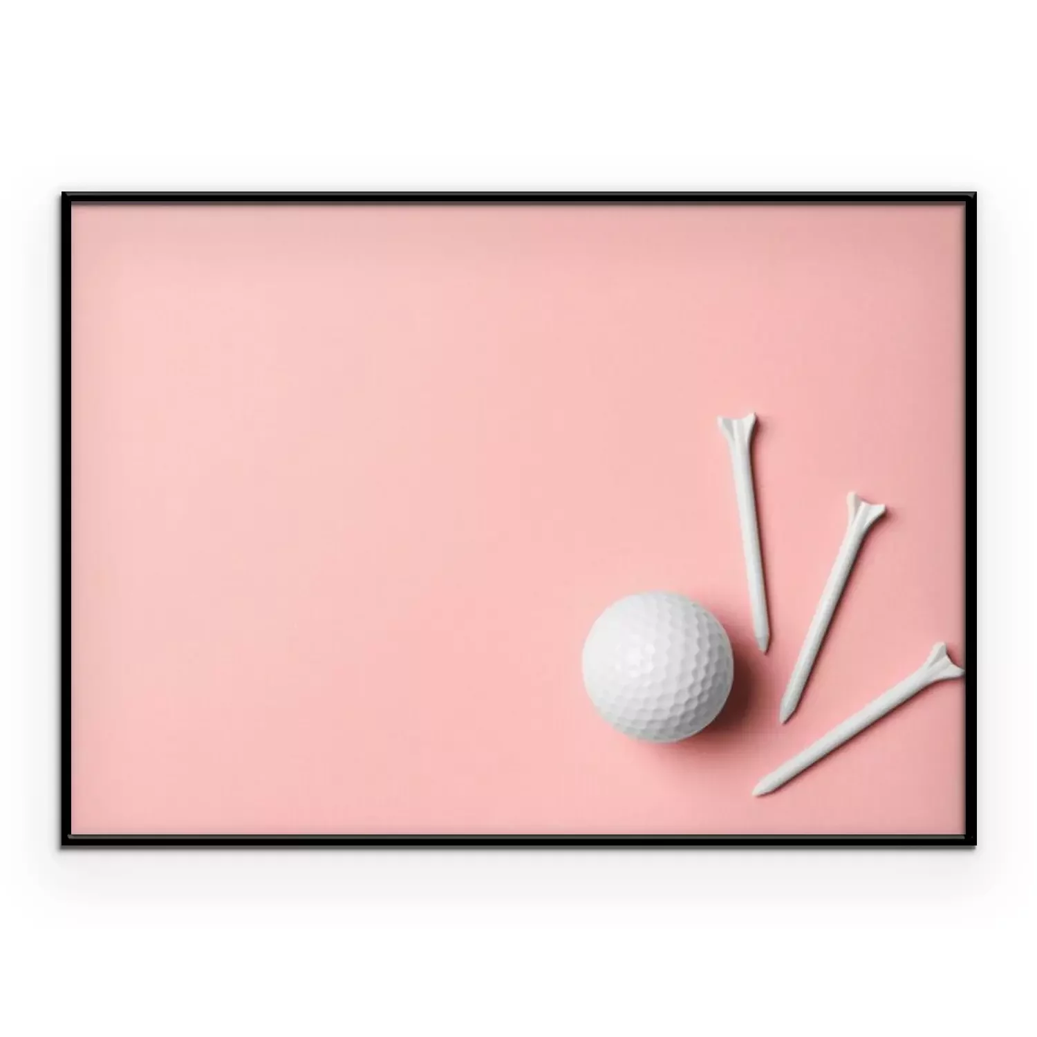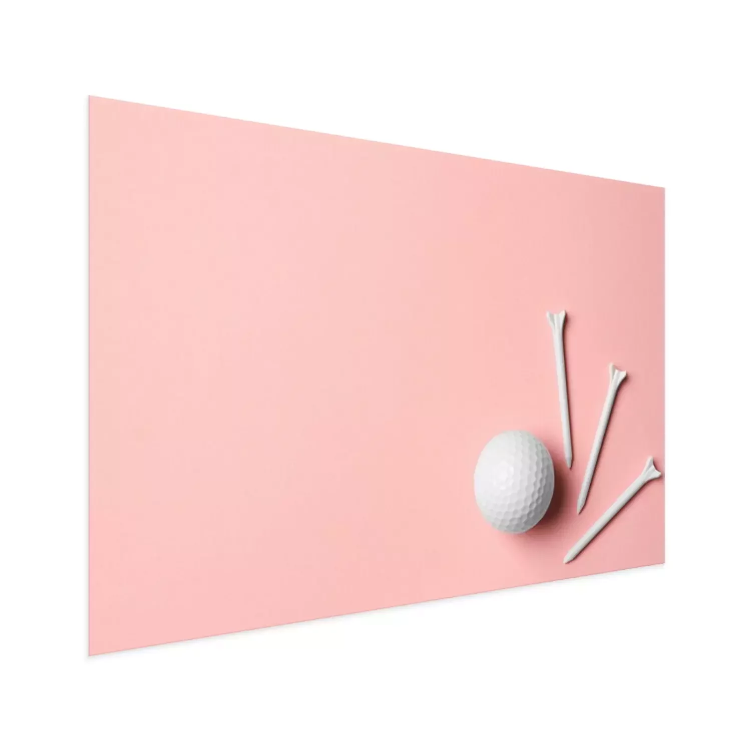 Poster  Golf ball and tees on pink background, flat lay. Space for text