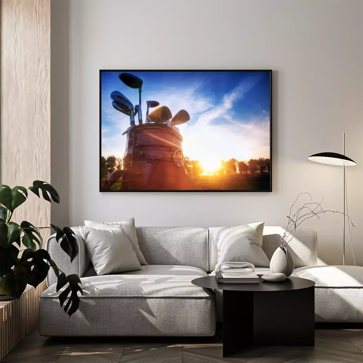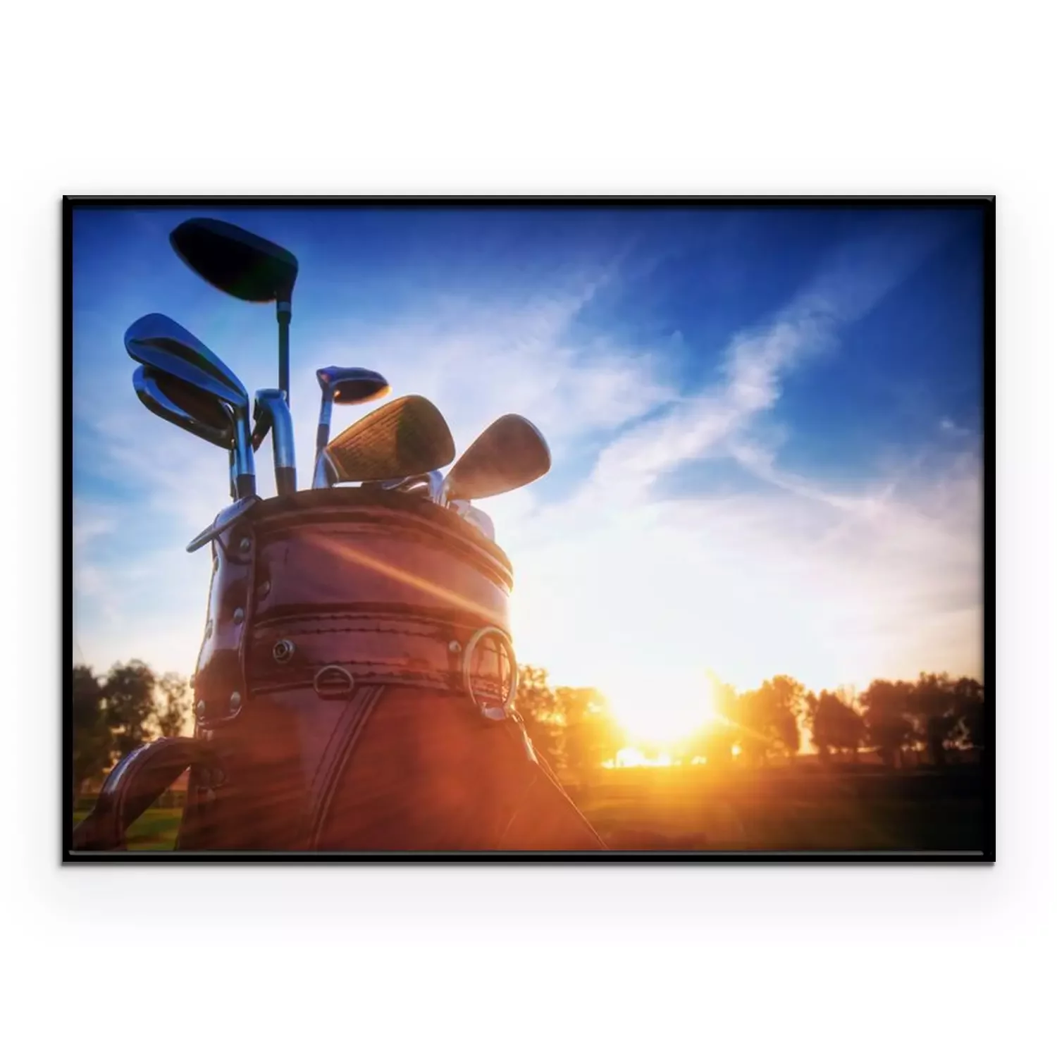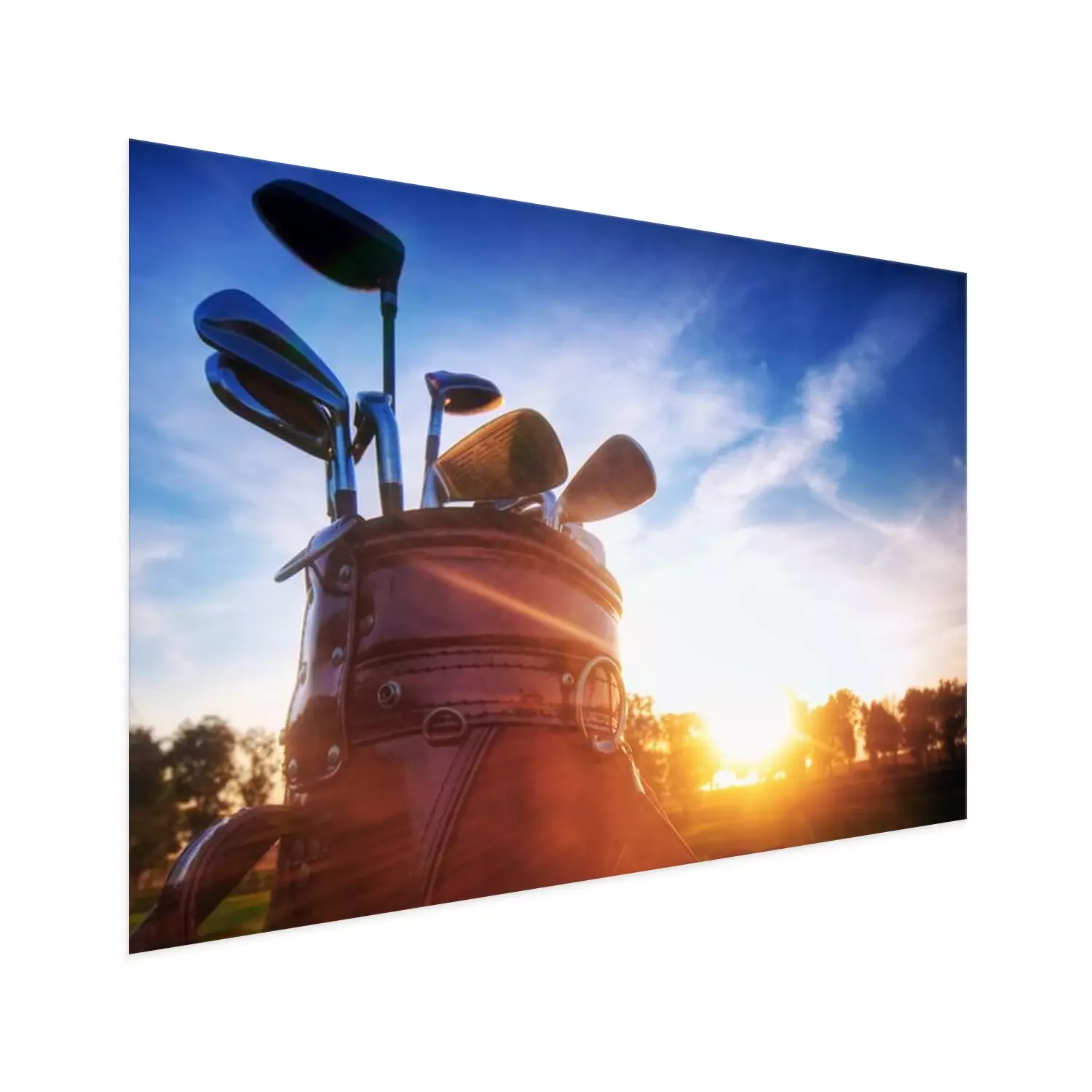 Poster  Golf engins, clubs au coucher du soleil sur le parcours de golf