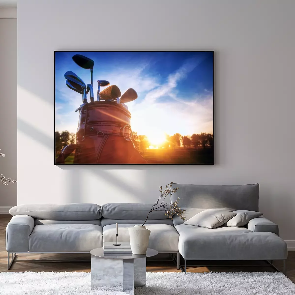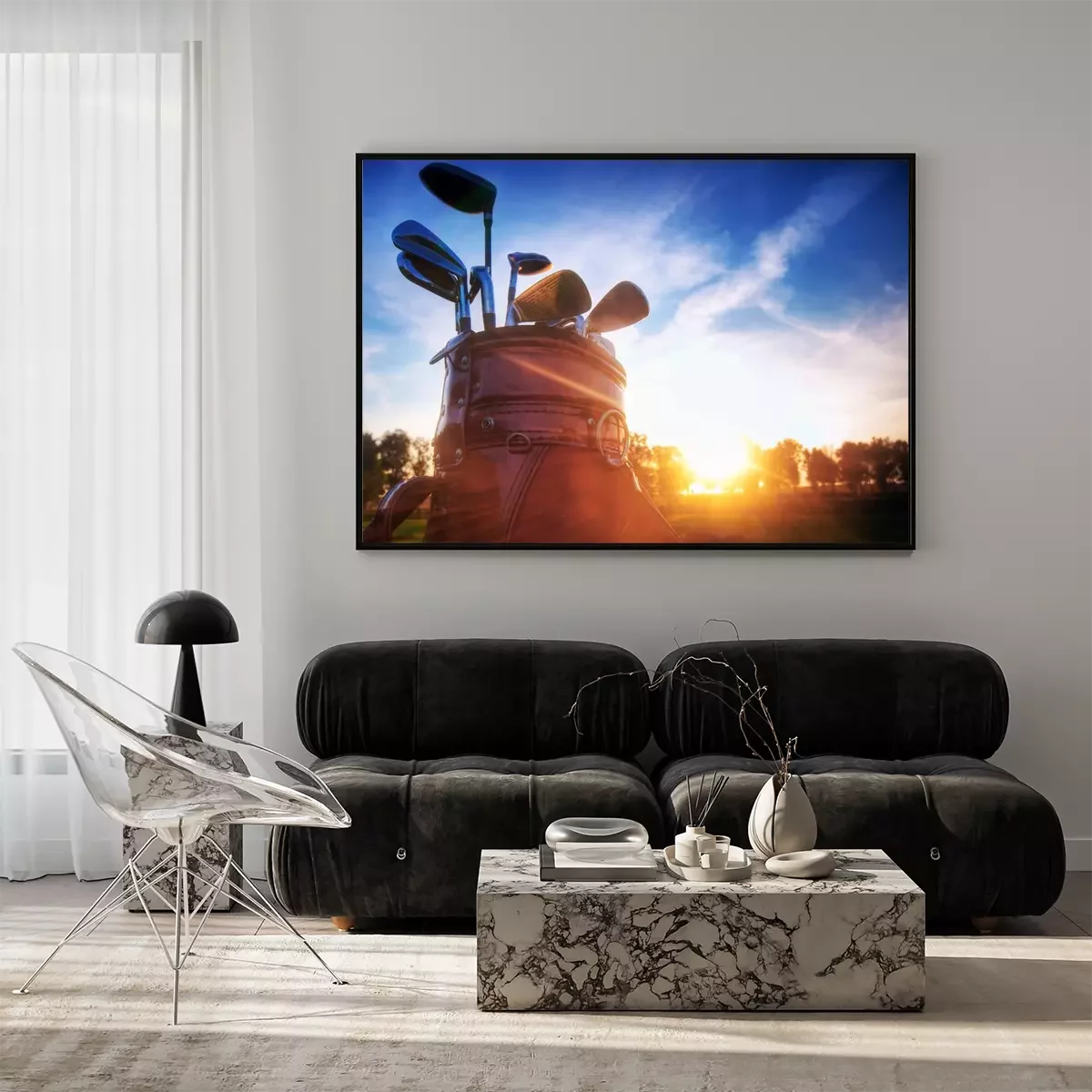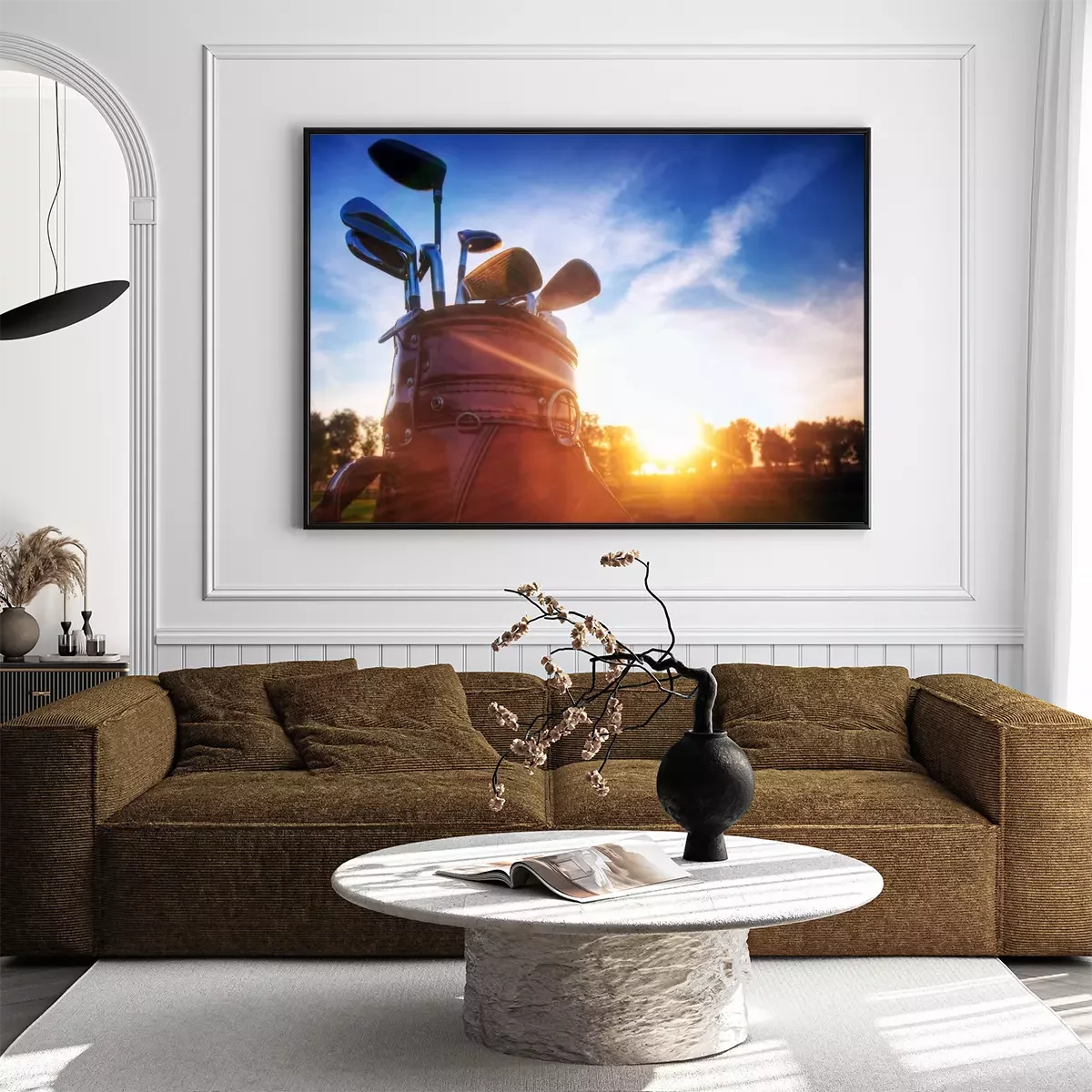 Poster  Golf engins, clubs au coucher du soleil sur le parcours de golf