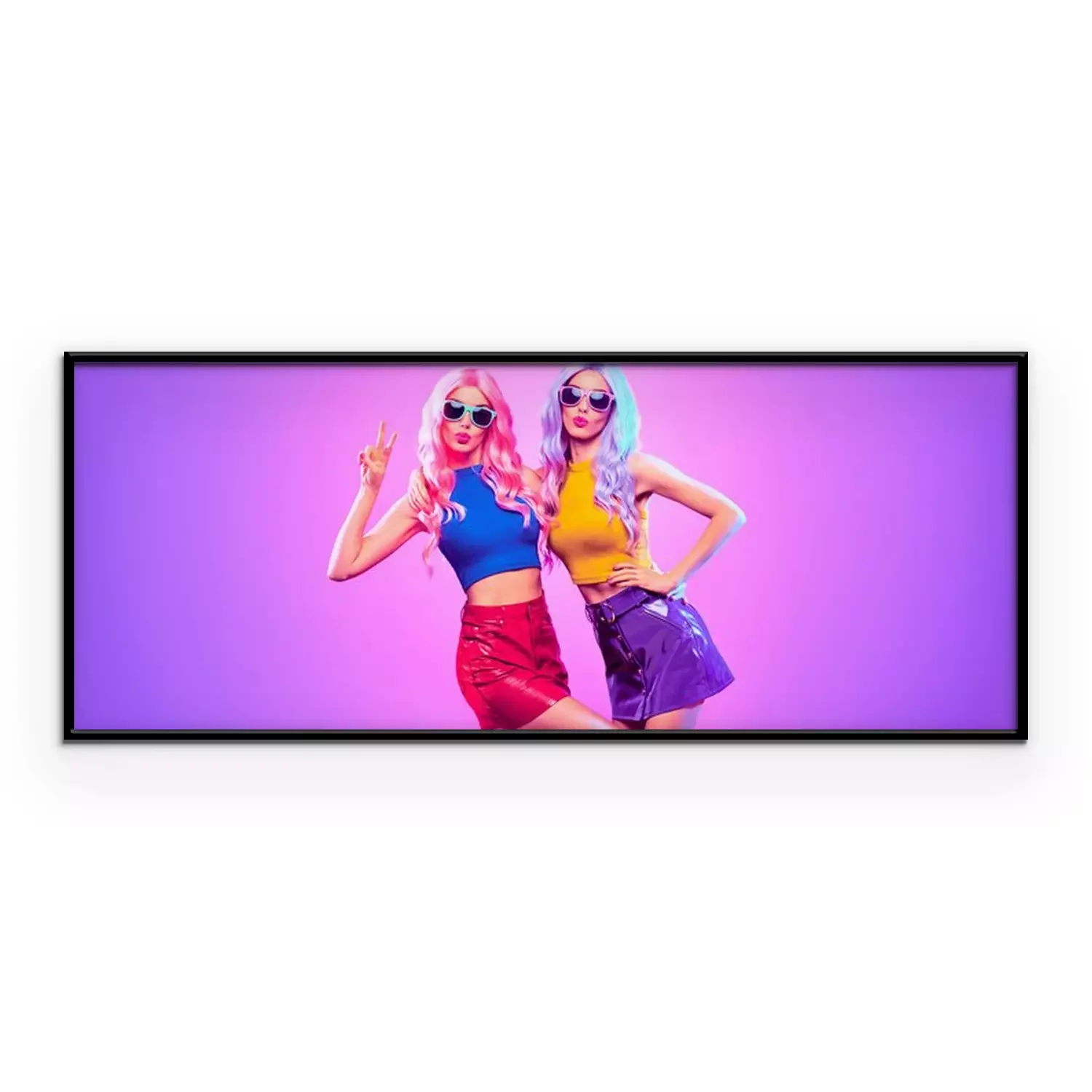 Poster : Gorgeous Disco Party girl with Having Fun, neon style. Pink Purple hairstyle. High Fashion. Two young beautiful model woman friends Dance, colorful neon Light. Night Clubbing.Pop Art fashionable Style