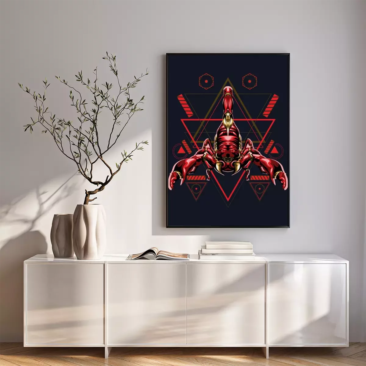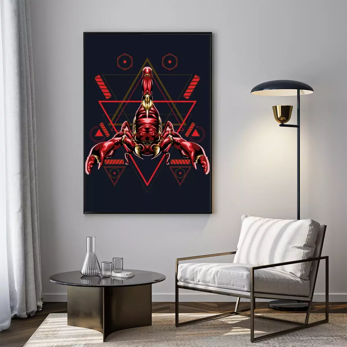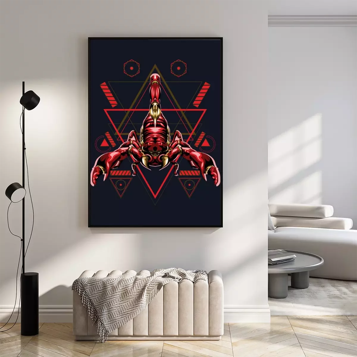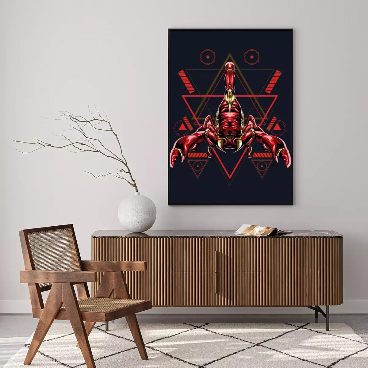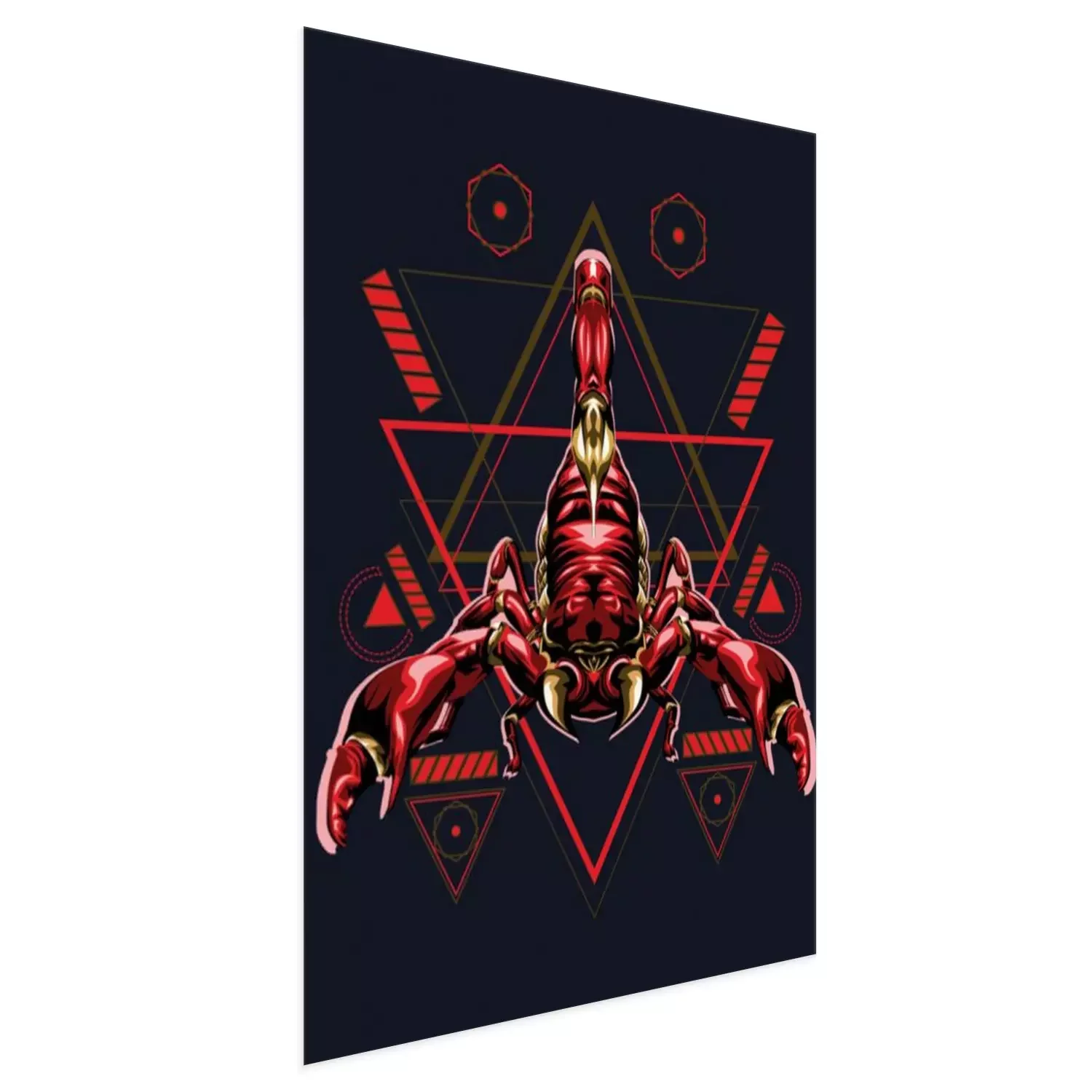 Poster : Graphiques d'un scorpion rouge sur fond de triangles