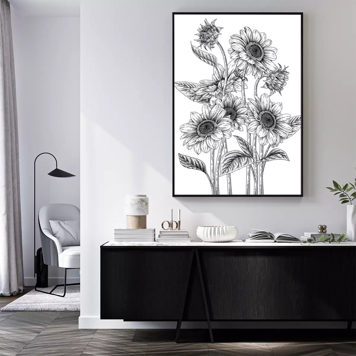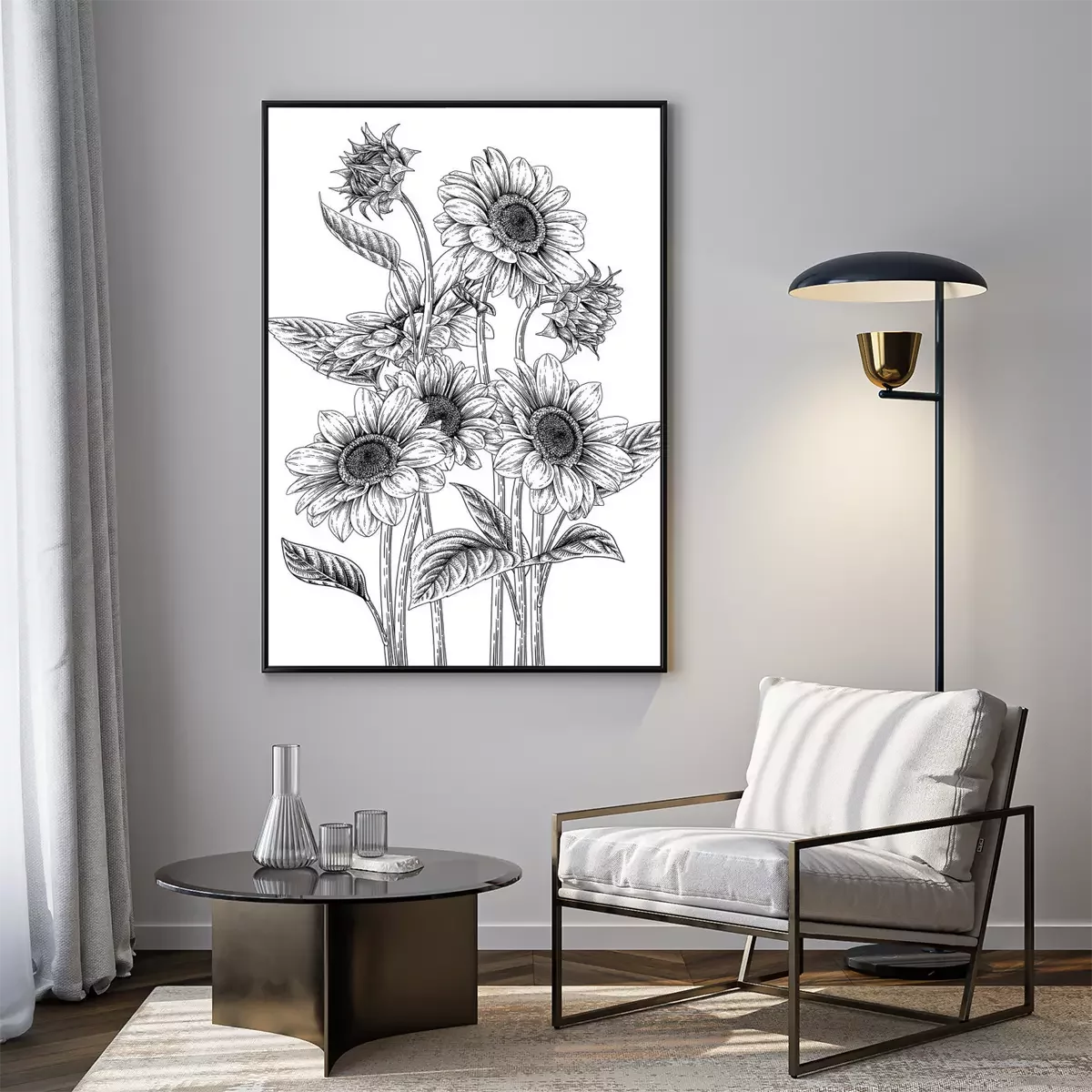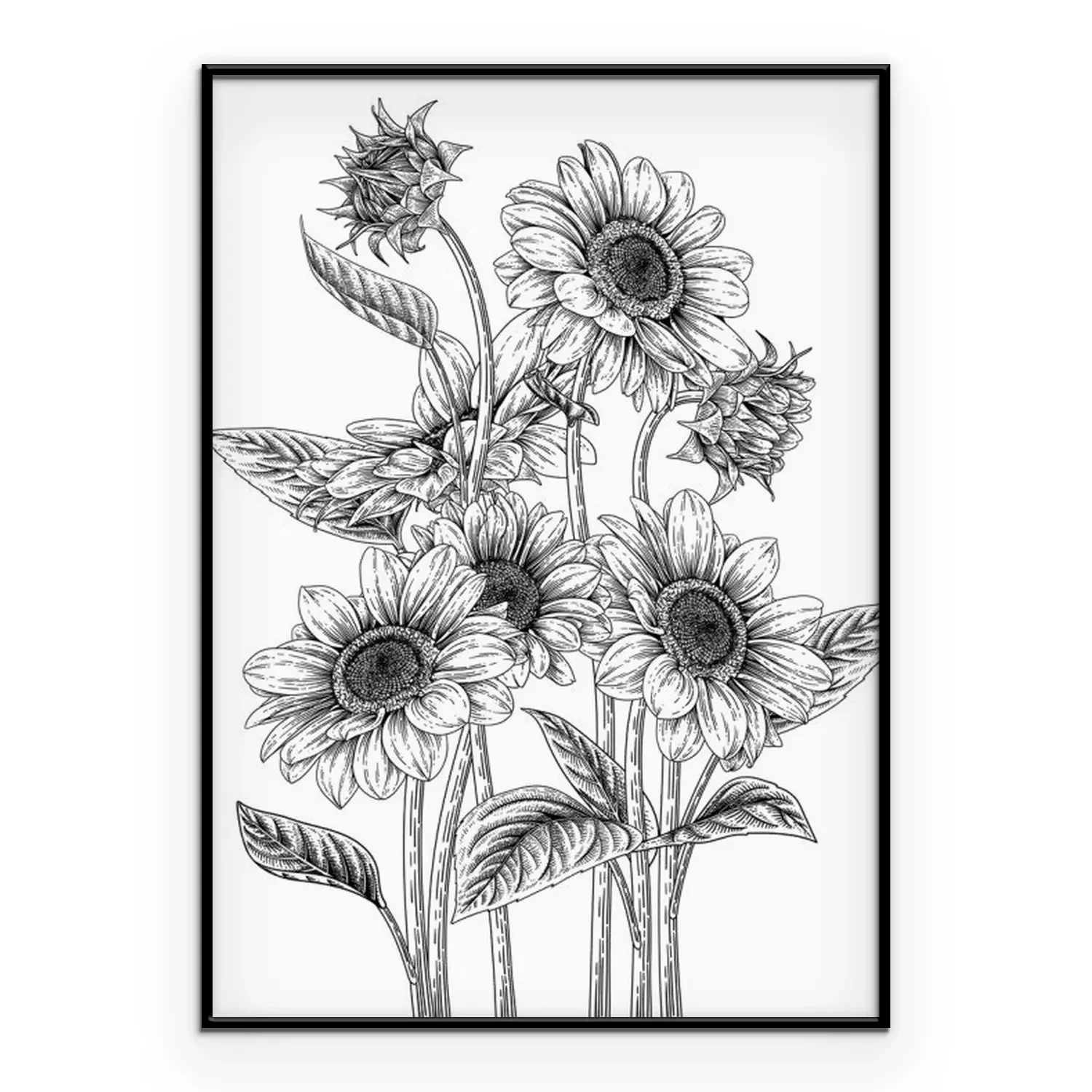 Poster : Graphisme en noir et blanc de tournesols dans une esthétique de croquis
