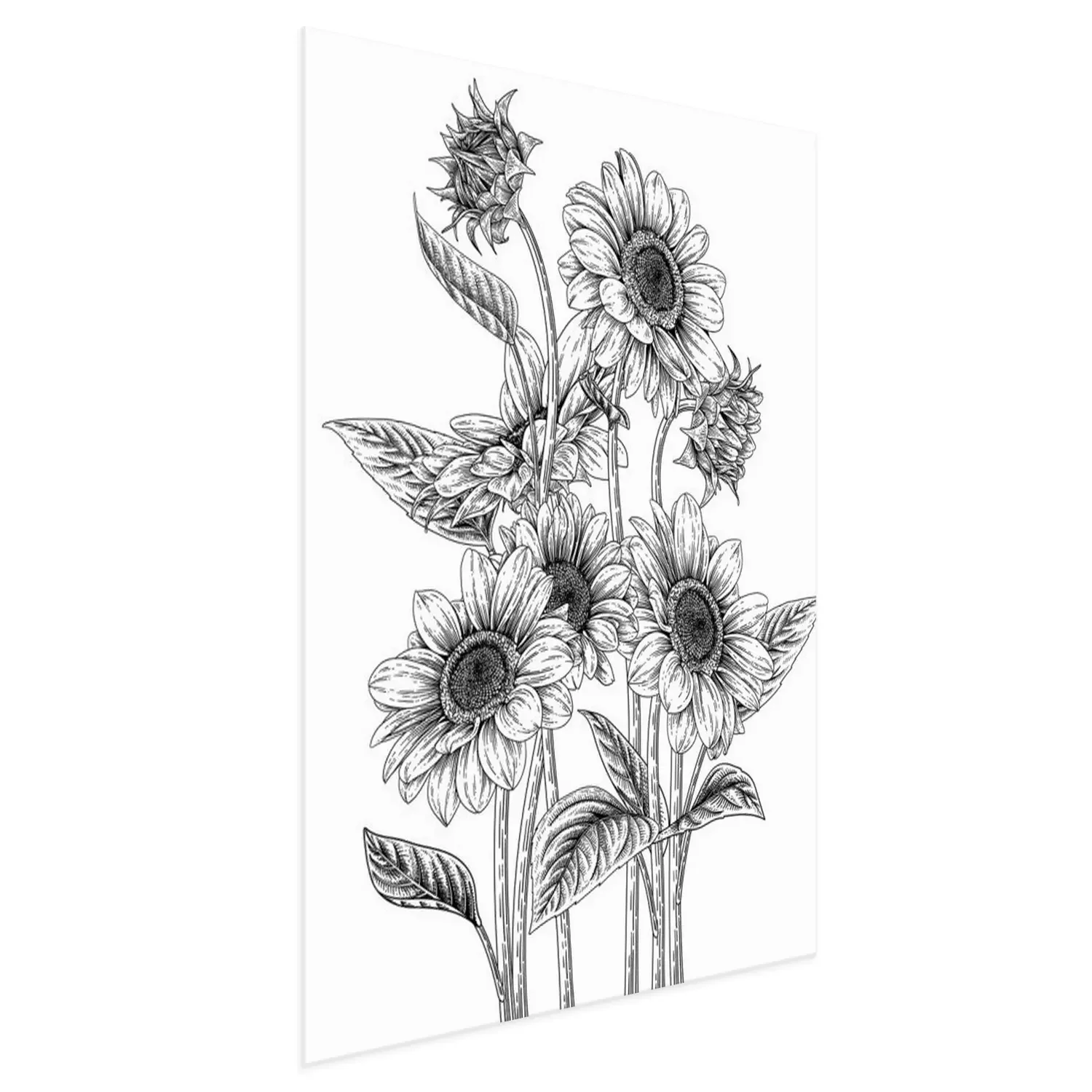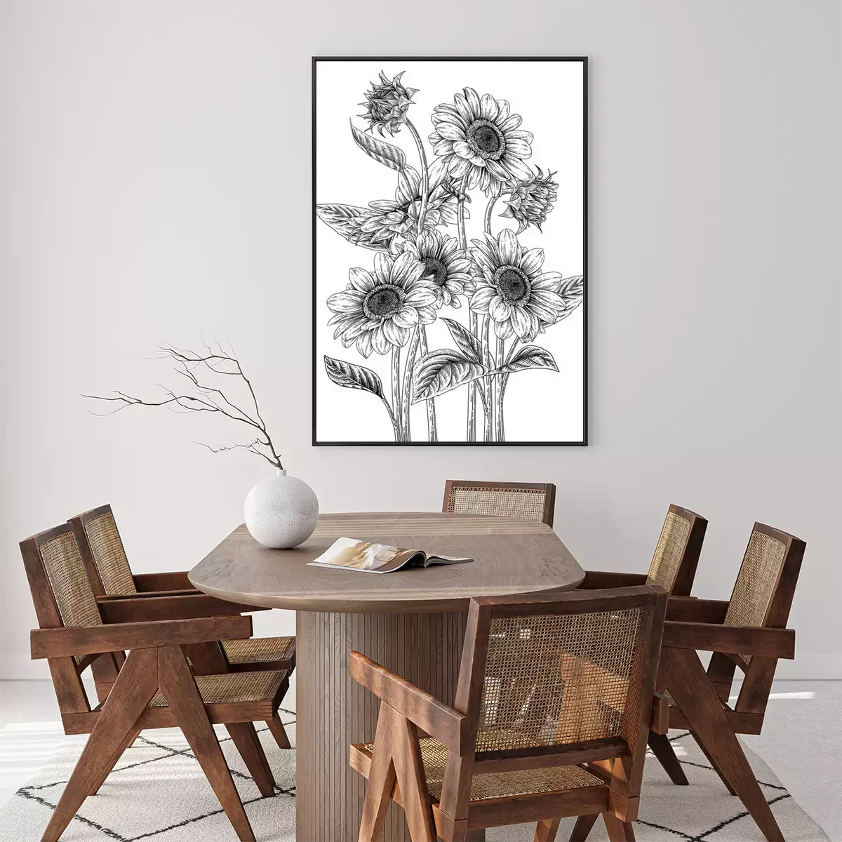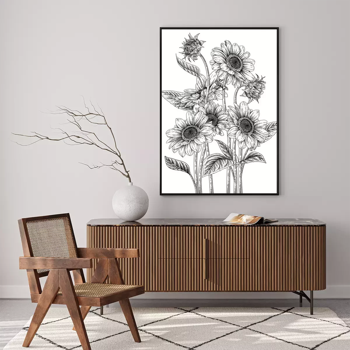 Poster : Graphisme en noir et blanc de tournesols dans une esthétique de croquis
