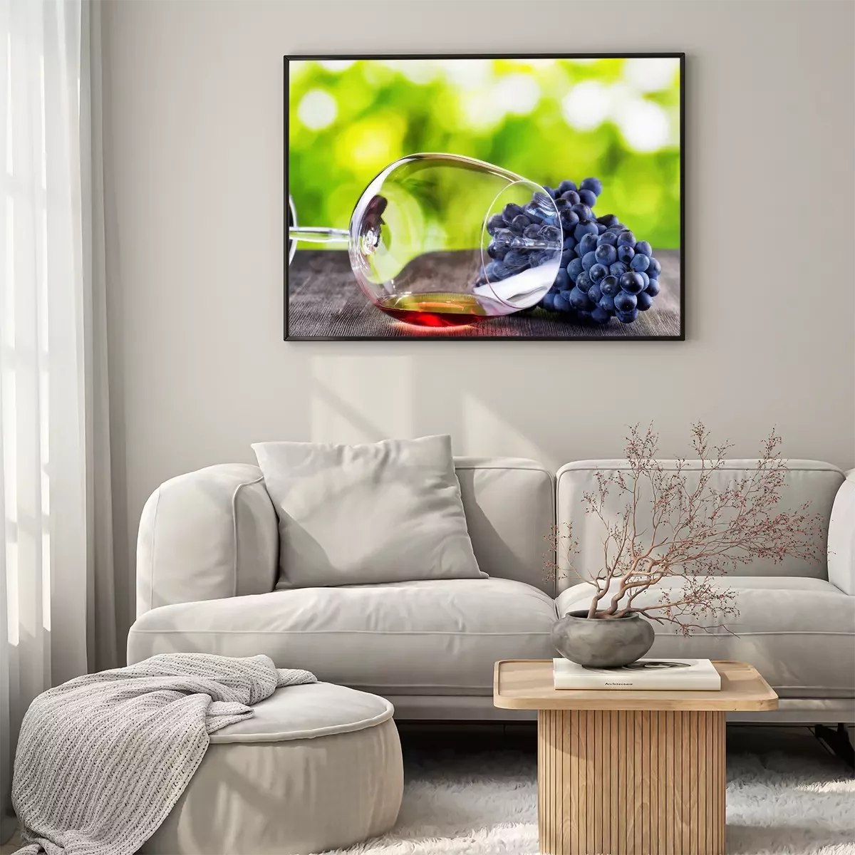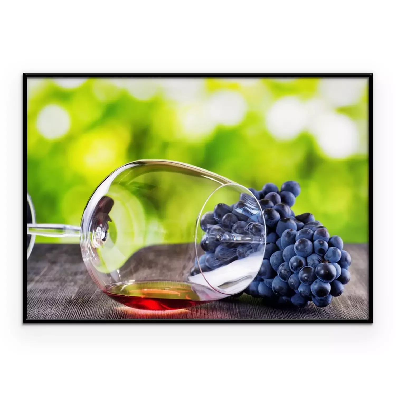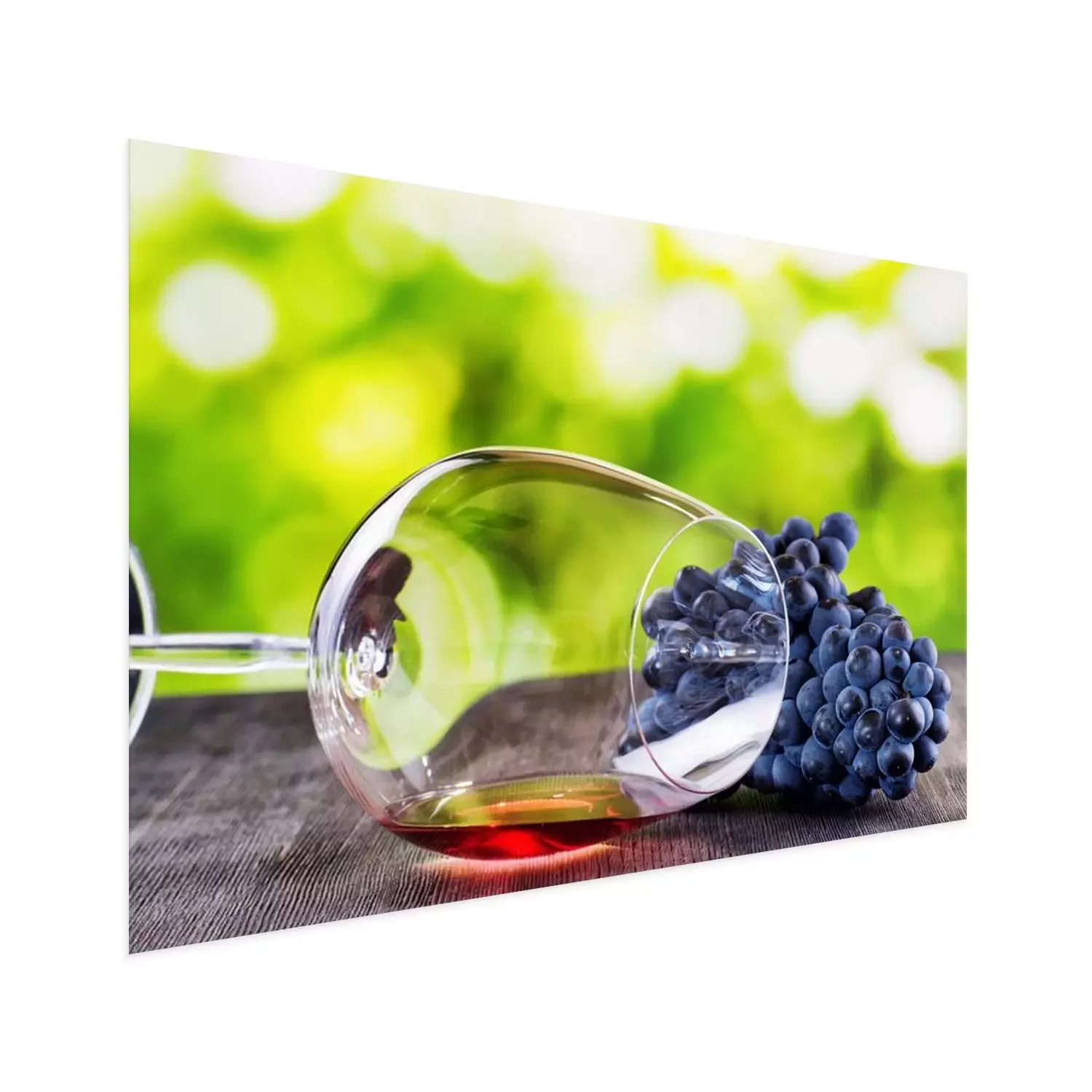 Poster  Grappe de raisin et verre de vin rouge couché sur un ta bois noir