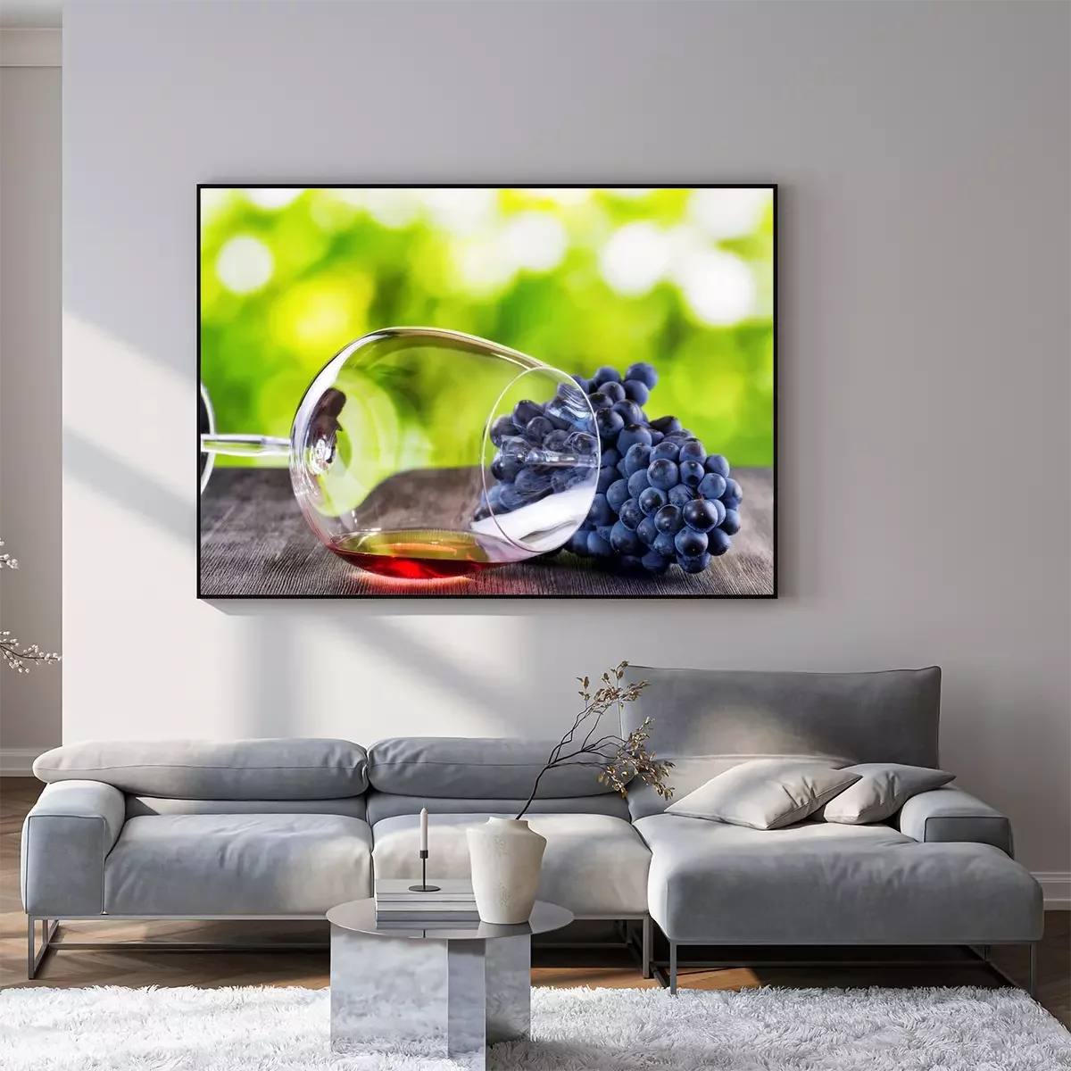Poster : Grappe de raisin et verre de vin rouge couché sur un ta bois noir
