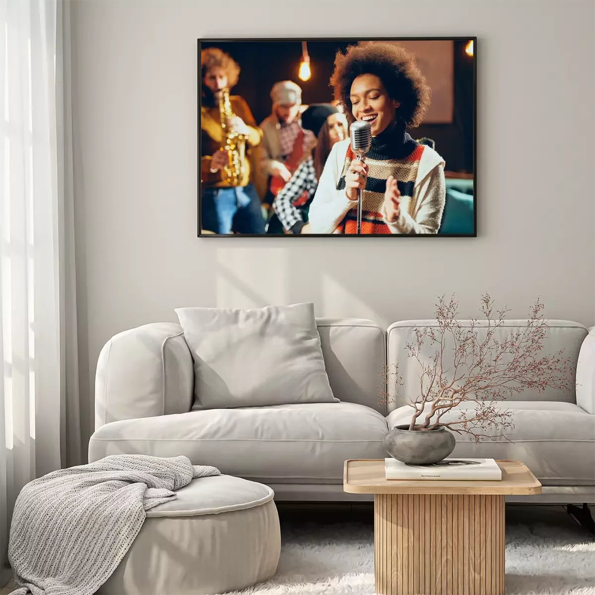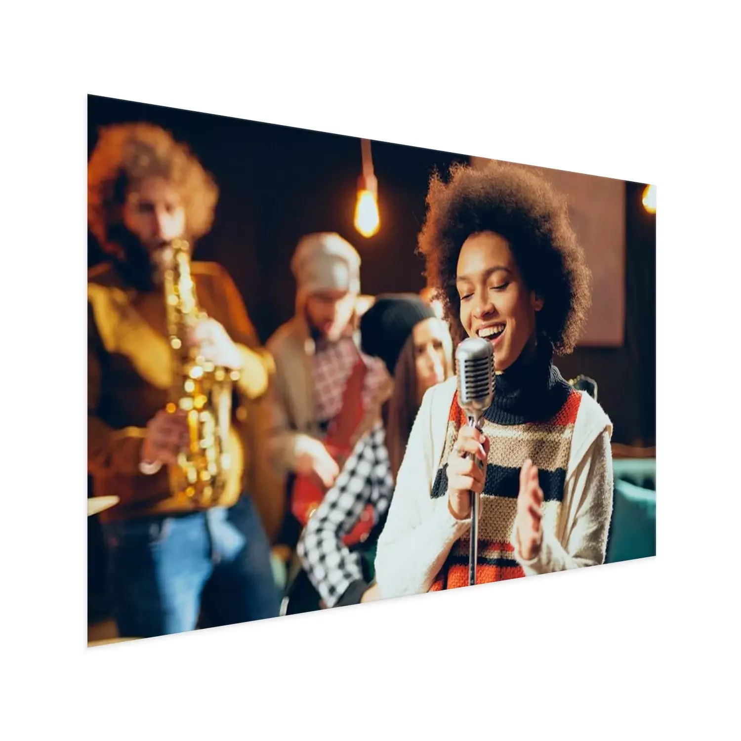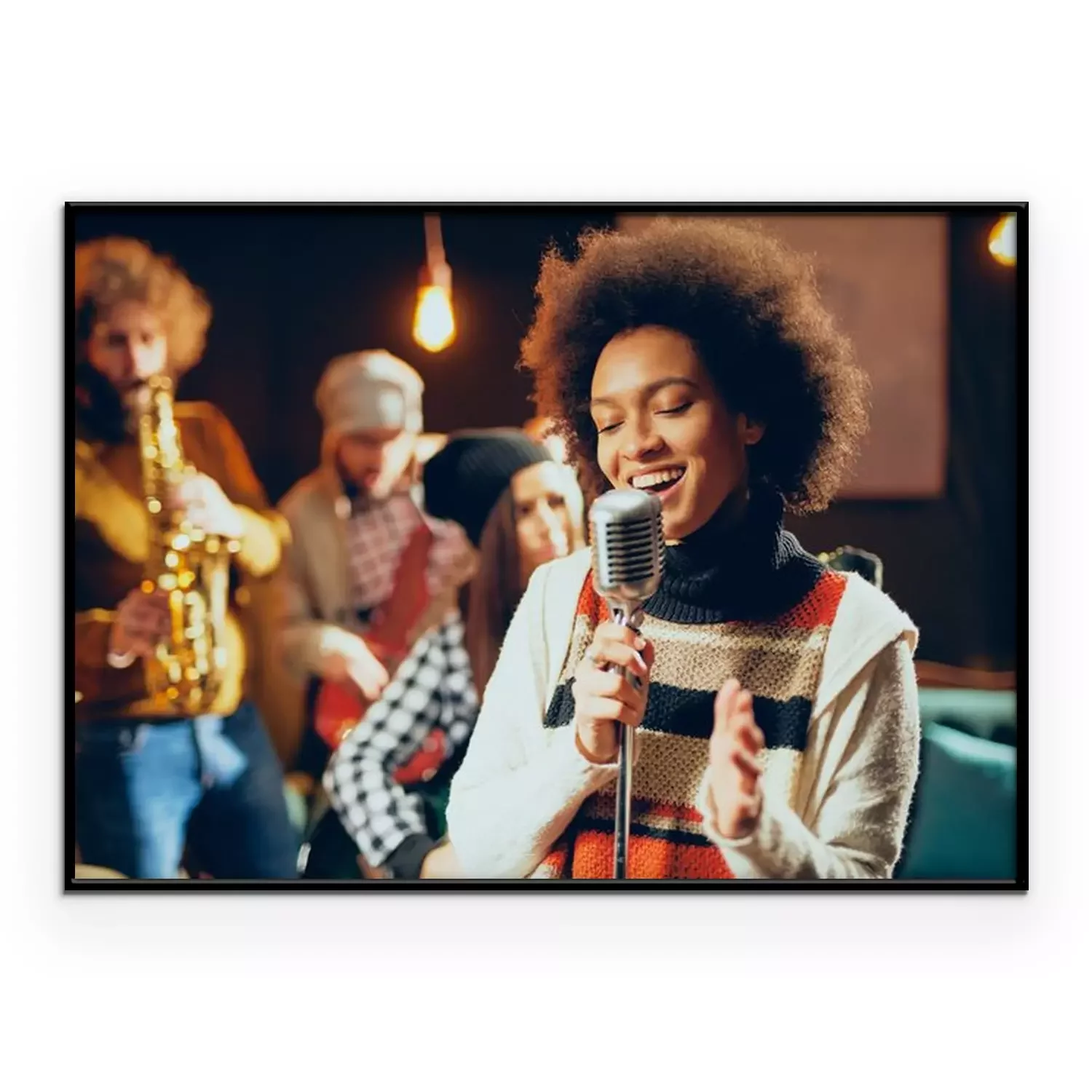 Poster  Gros plan d'une femme métisse chantant. En bande de fond jouant des instruments. Intérieur du home studio.