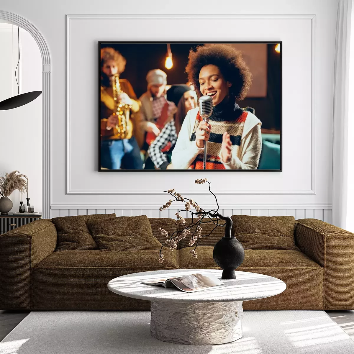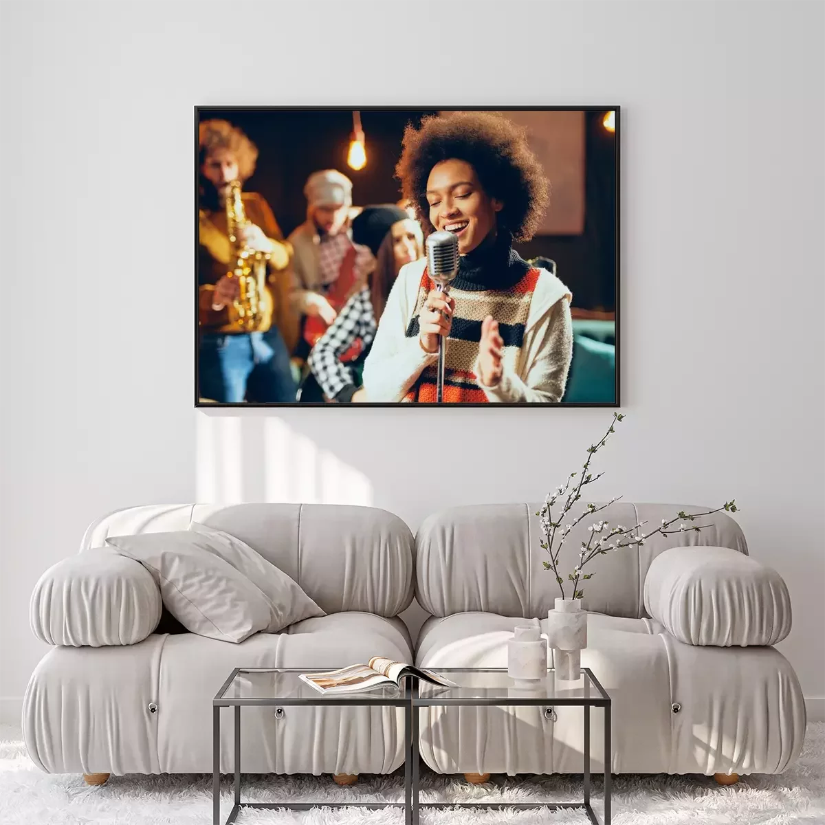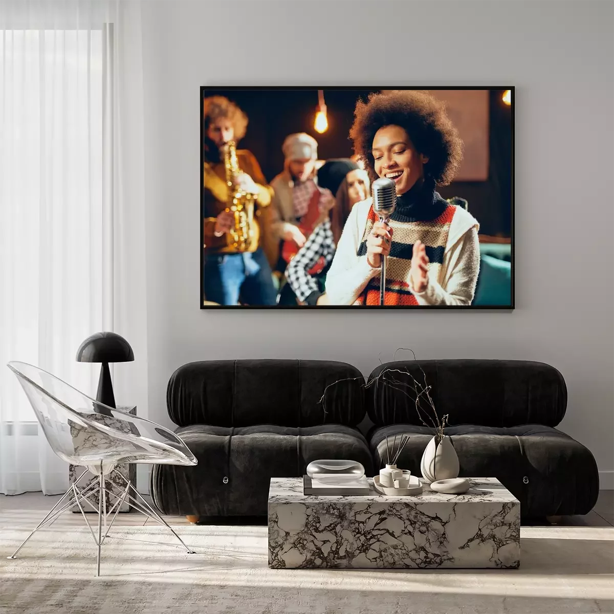 Poster  Gros plan d'une femme métisse chantant. En bande de fond jouant des instruments. Intérieur du home studio.