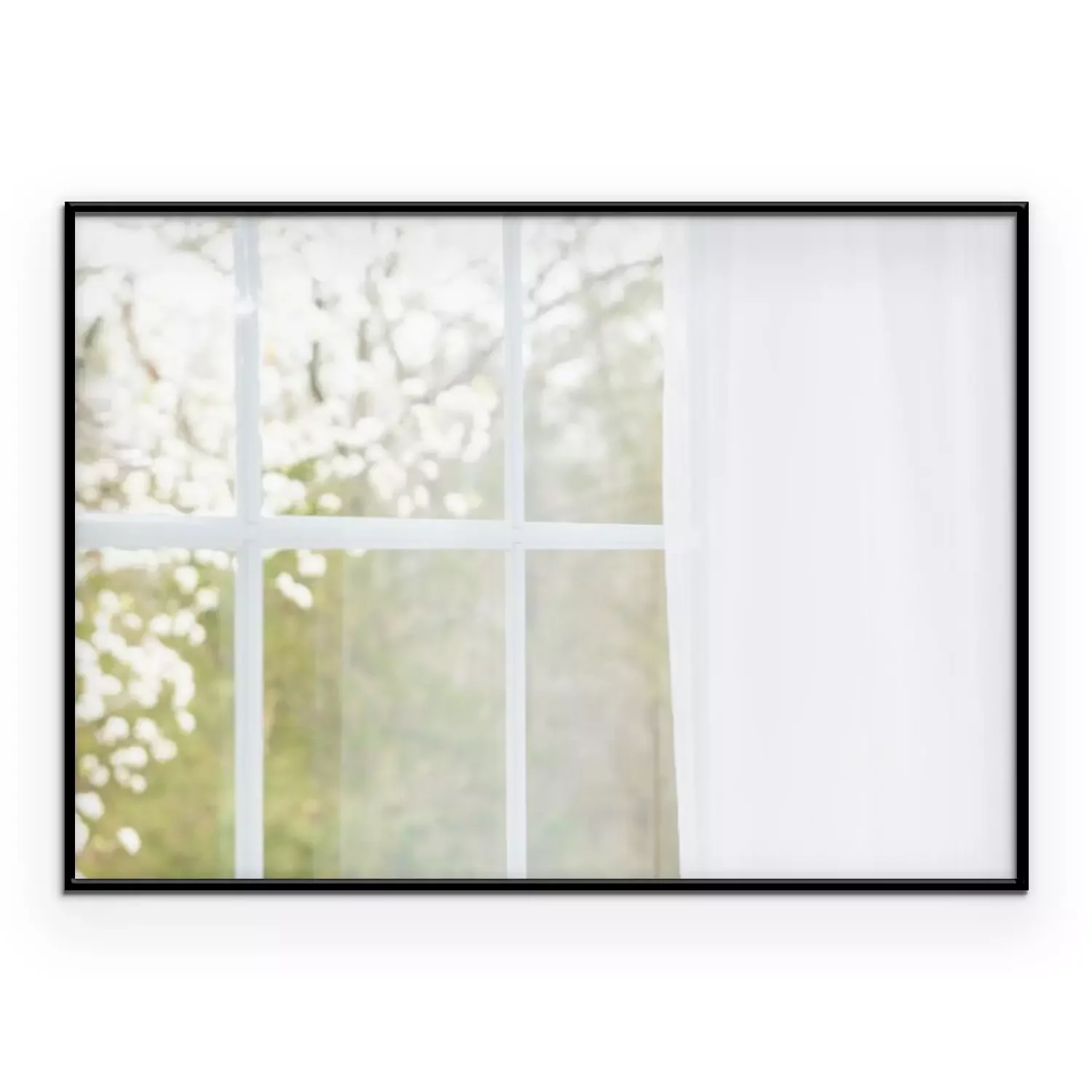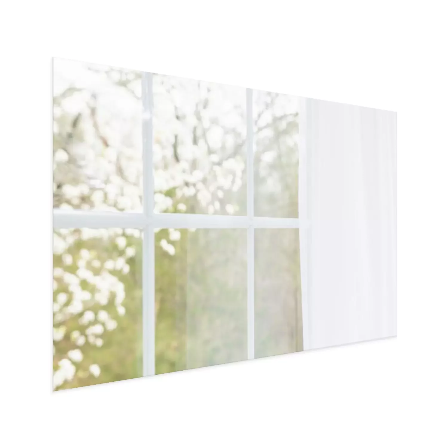Poster  Gros plan de rideaux de dentelle blanche moderne avec vue à travers une vitre sur le jardin au printemps ou en été avec sakura, arbre de fleurs de cerisiers en fleurs