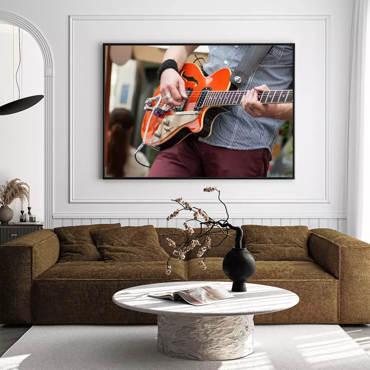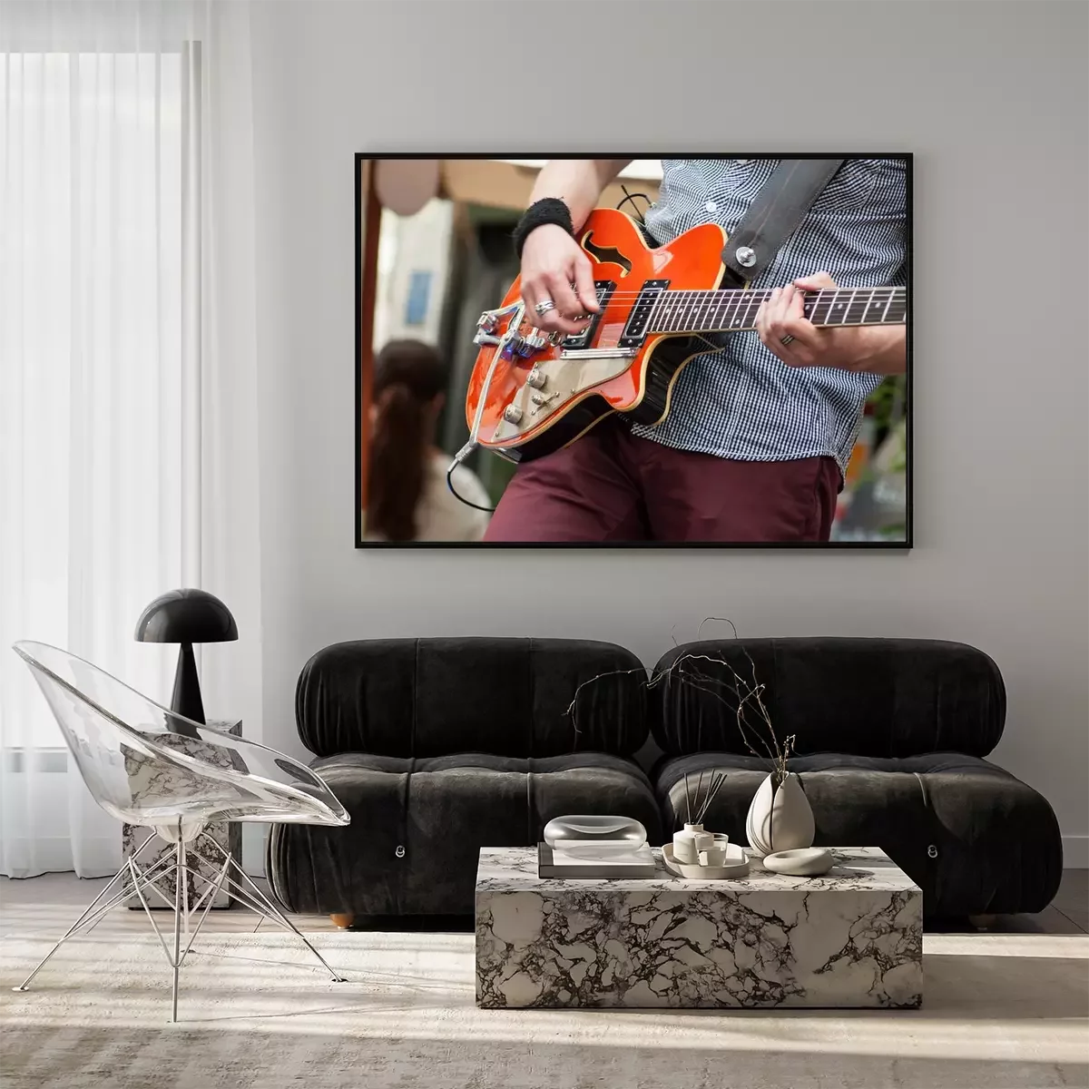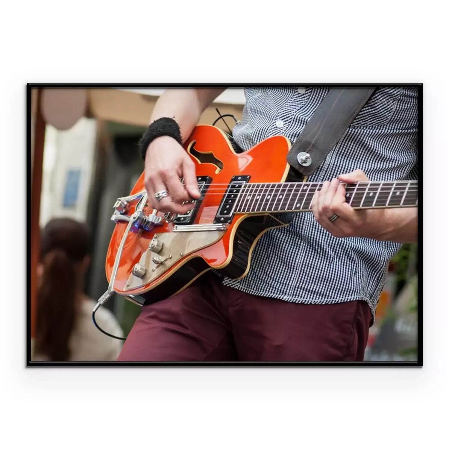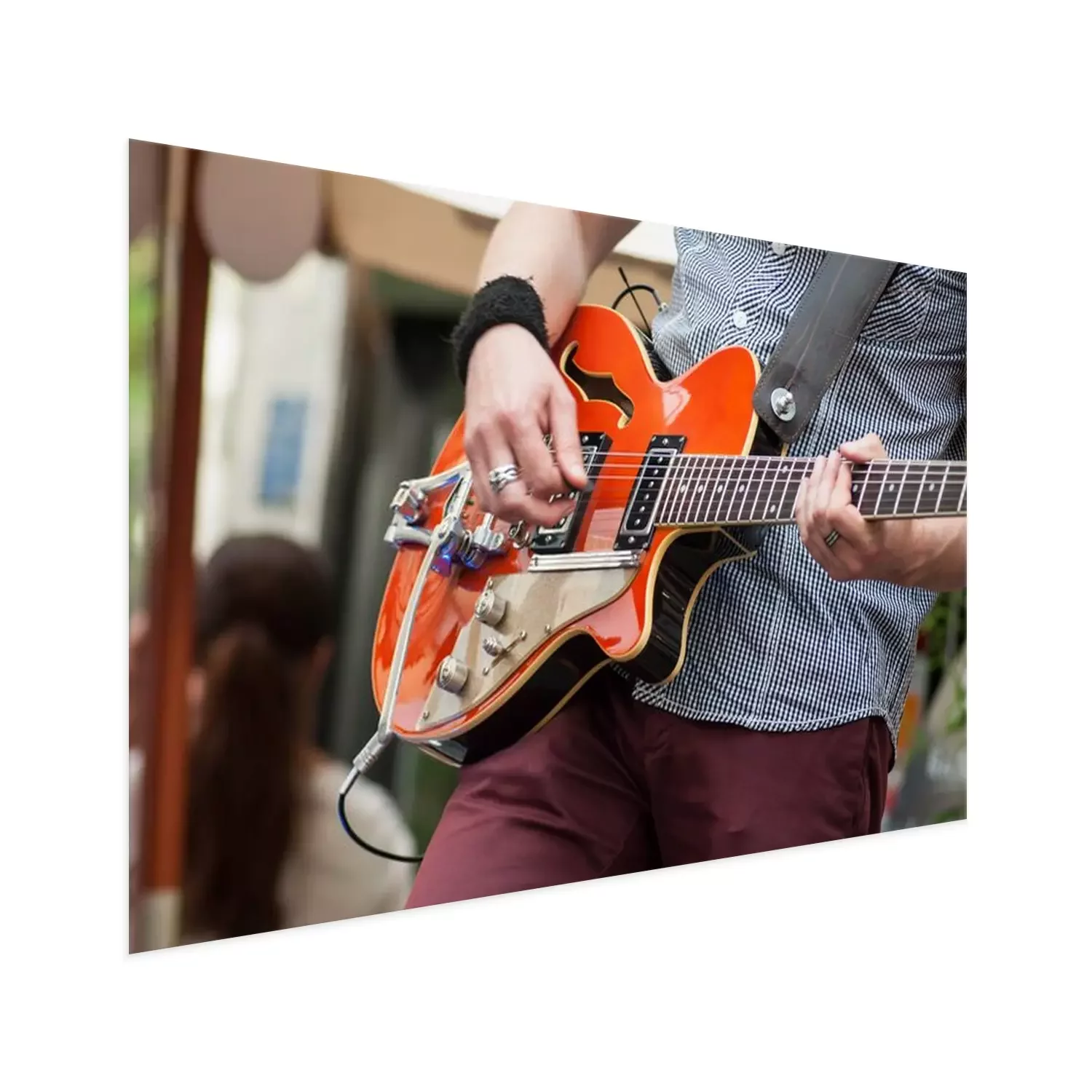 Poster : gros plan du guitariste jouant de la guitare avec un groupe de rock dans la rue