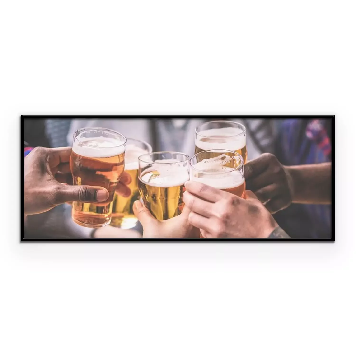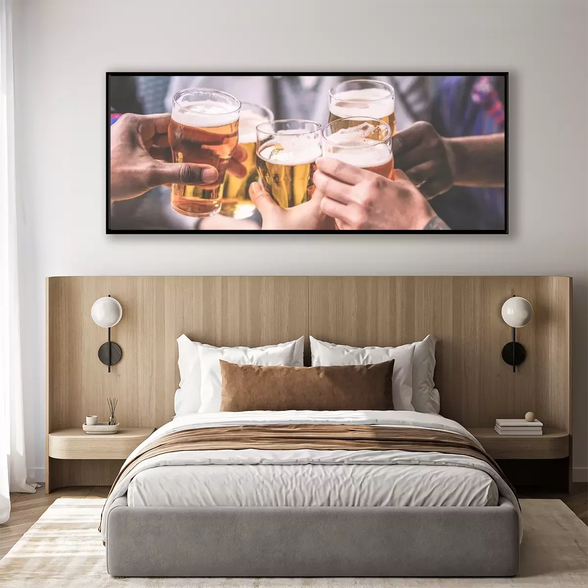 Poster  Group of friends enjoying a beer glasses in brewery english pub - Young people cheering at bar restaurant - Friendship and youth concept - Warm vintage filter - Main focus on left black hand