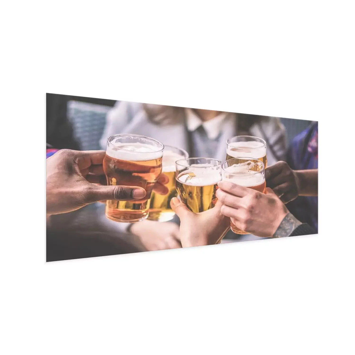 Poster : Group of friends enjoying a beer glasses in brewery english pub - Young people cheering at bar restaurant - Friendship and youth concept - Warm vintage filter - Main focus on left black hand