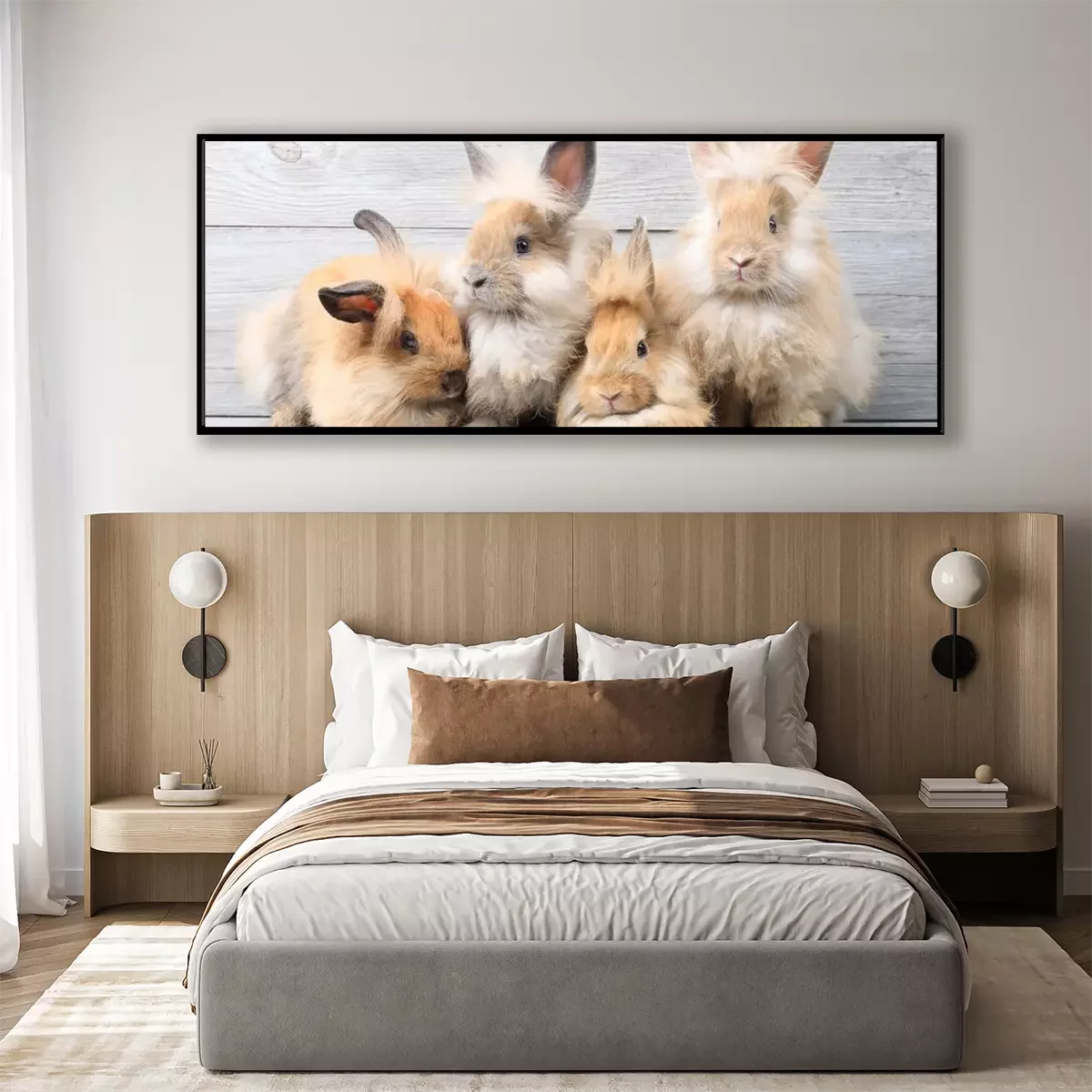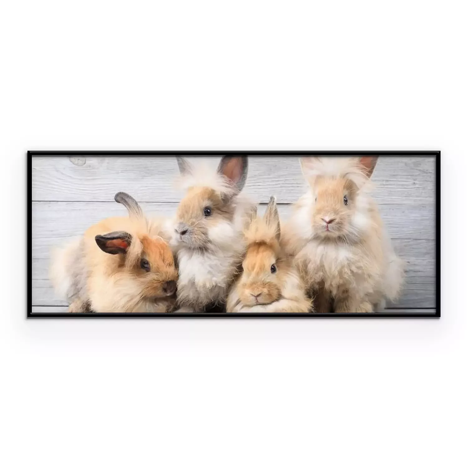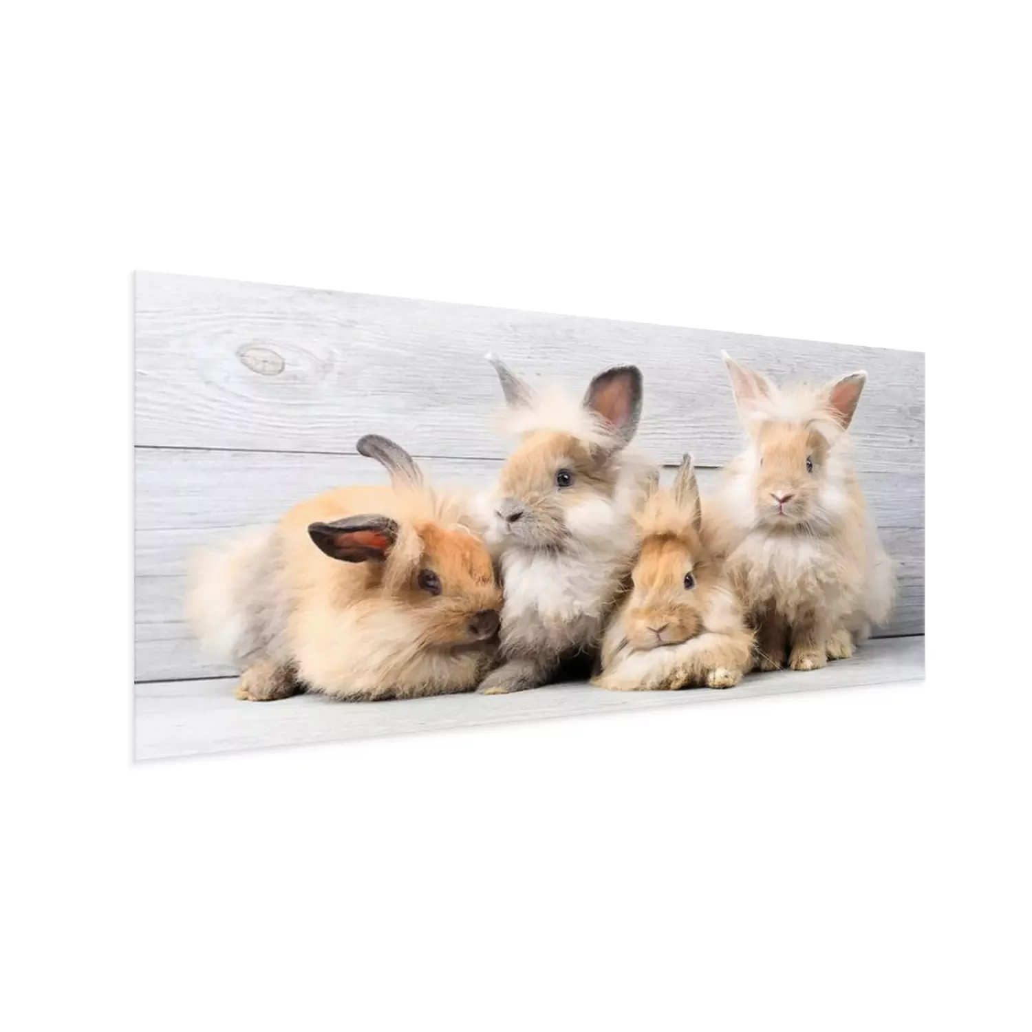 Poster  Group of lovely bunny easter rabbits on wooden background. beautiful lovely pets.
