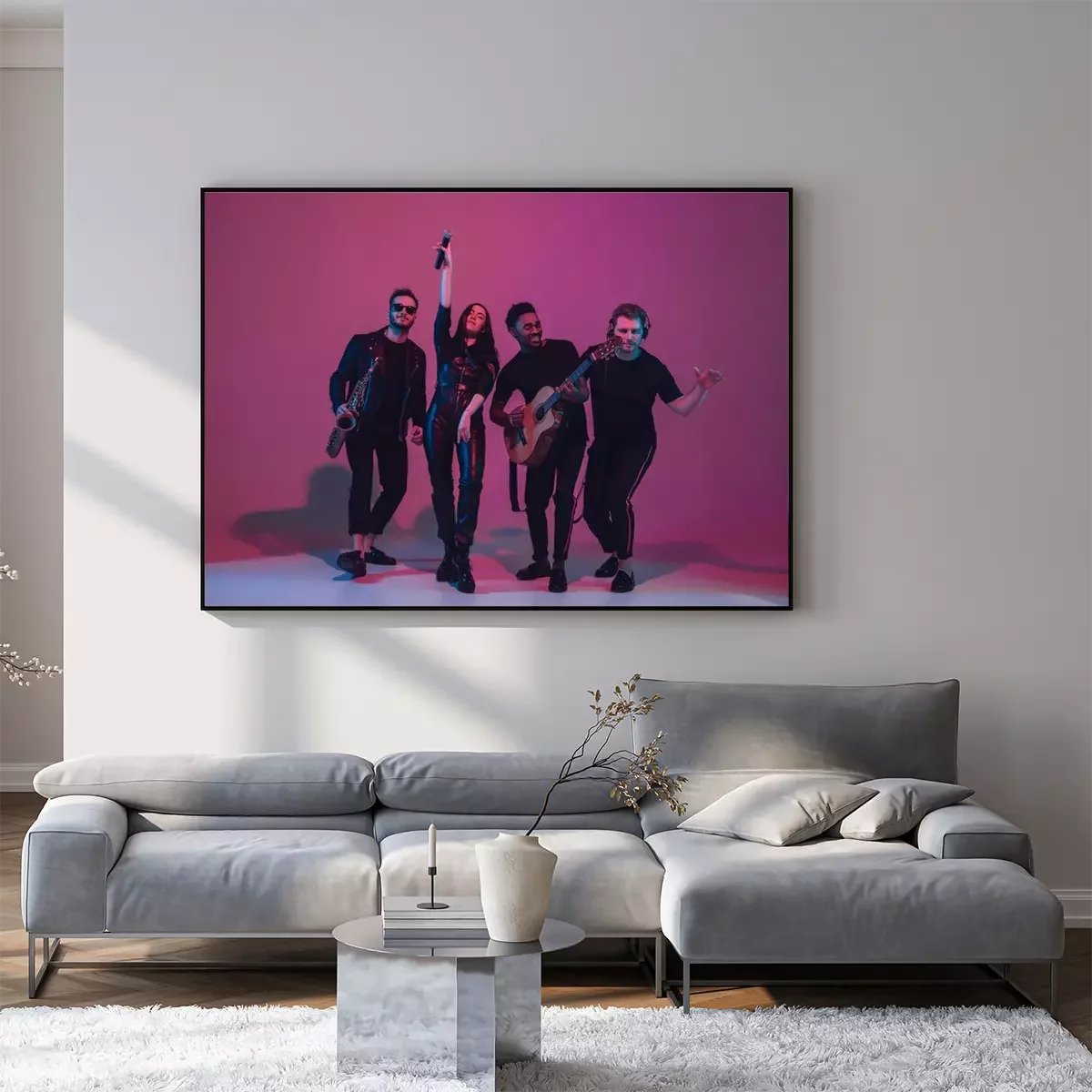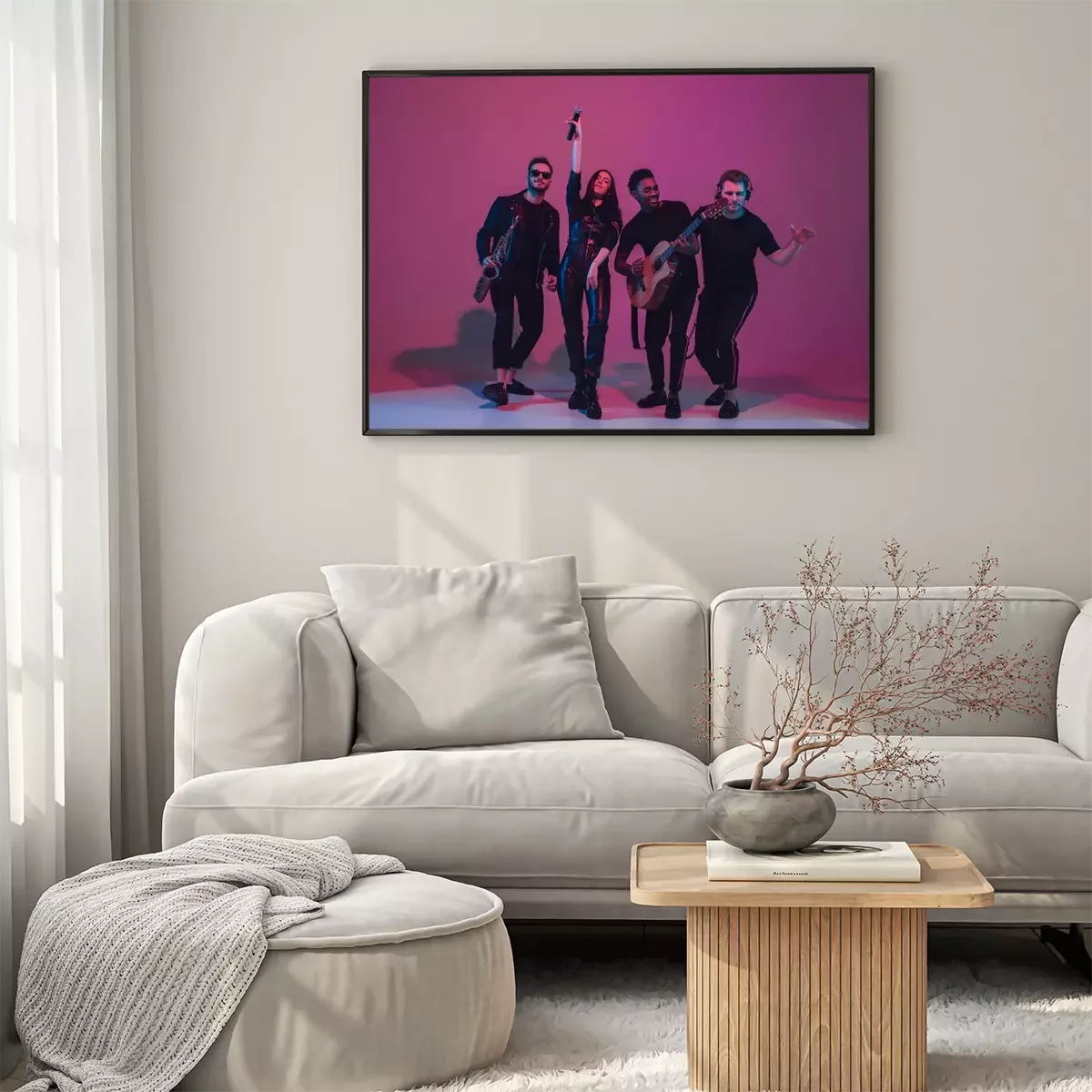 Poster : Group of young multiethnic musicians created band, dancing in neon light on pink background. Concept of music, hobby, festival, wellness. Joyful party host, dancer, singer, guitarist, saxophonist.