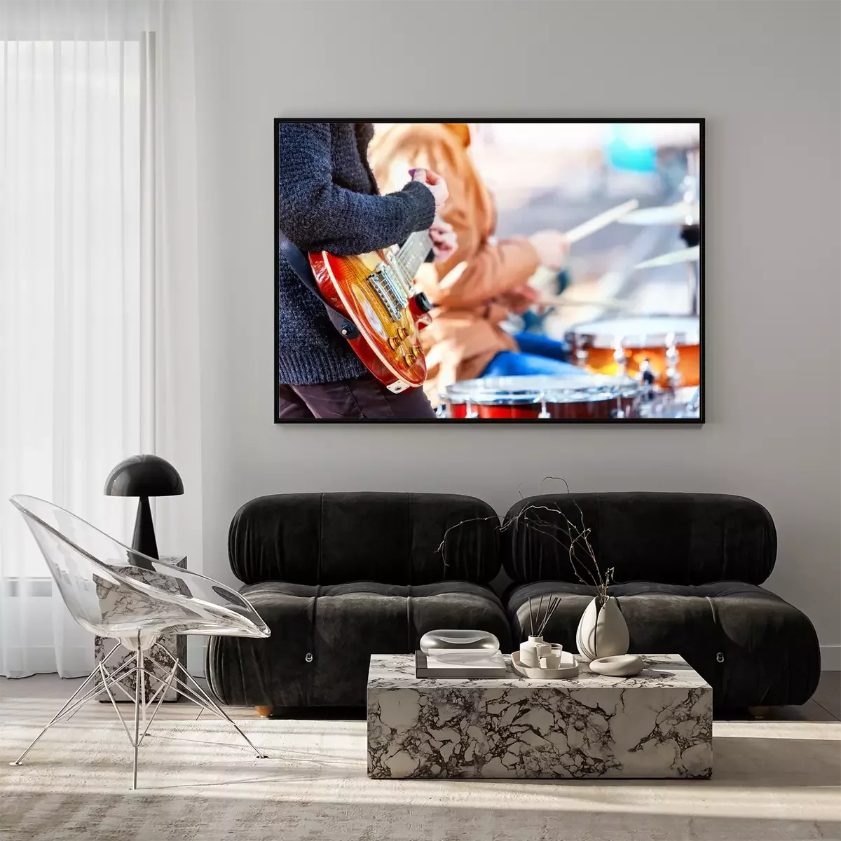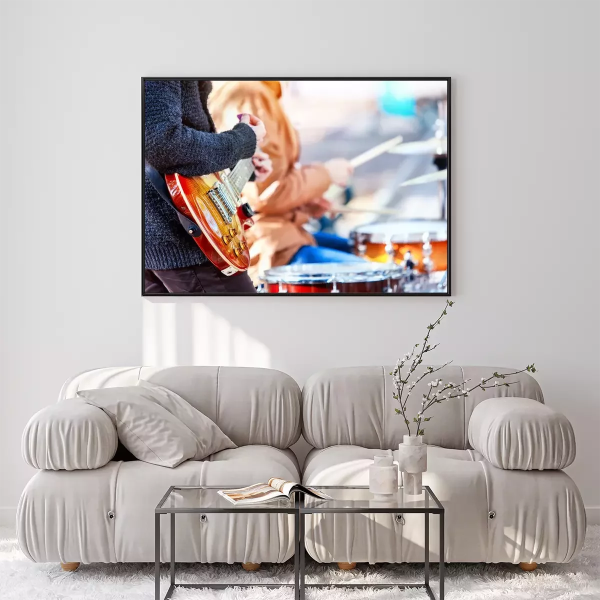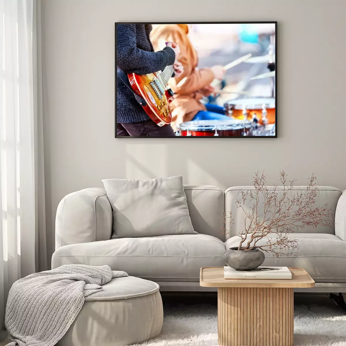 Poster  Groupe de musique du festival. Mains jouant sur des instruments de percussion dans le parc de la ville. Batterie avec des closeup de bâtons. Partie du corps des musiciens masculins. Sharpen est la gui