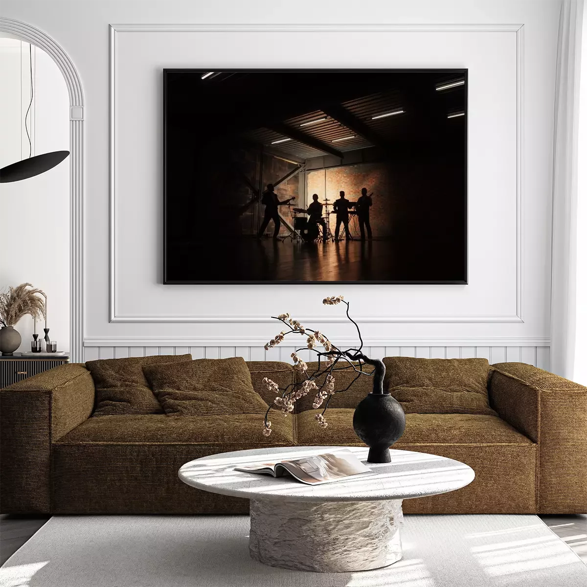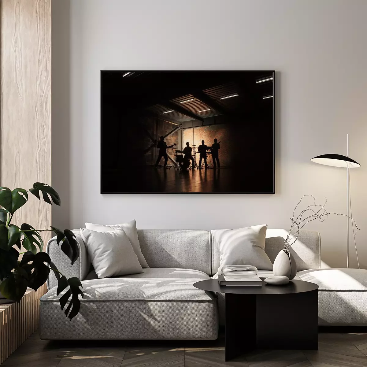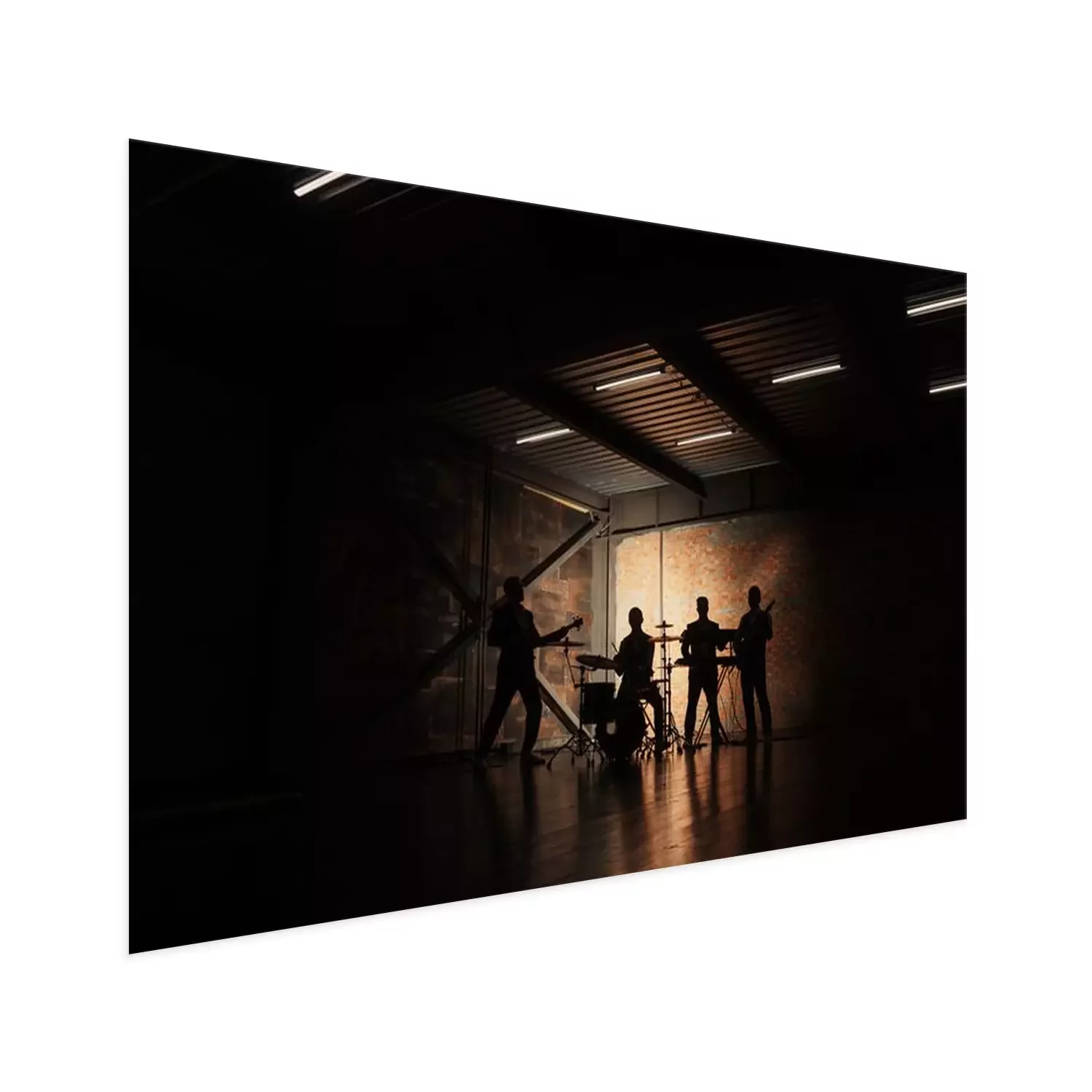 Poster  Groupe de musique et de la mode. Beau jeunes hommes en costumes jouant de la chanson rock et chant. Bandes silhouettes avec un concert.