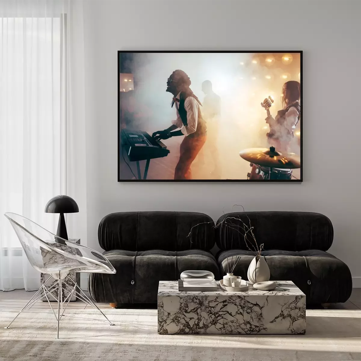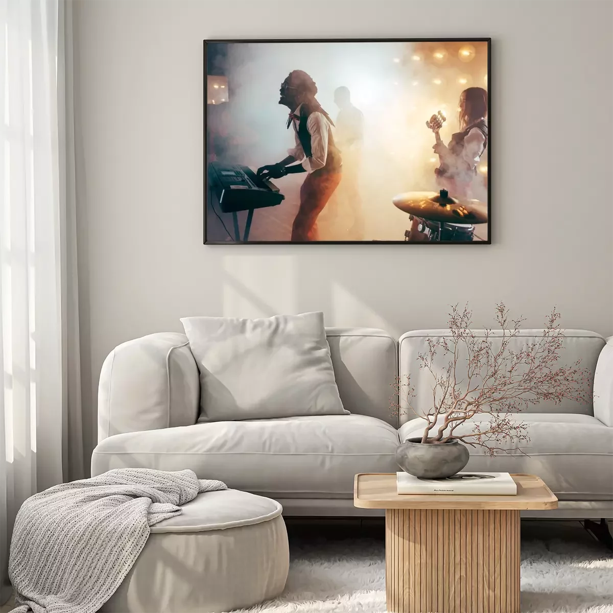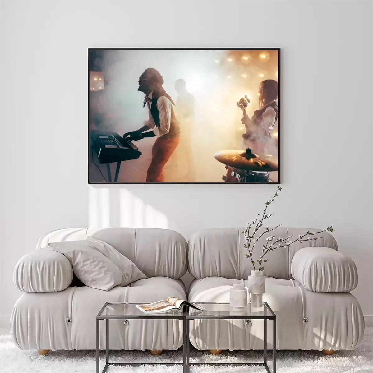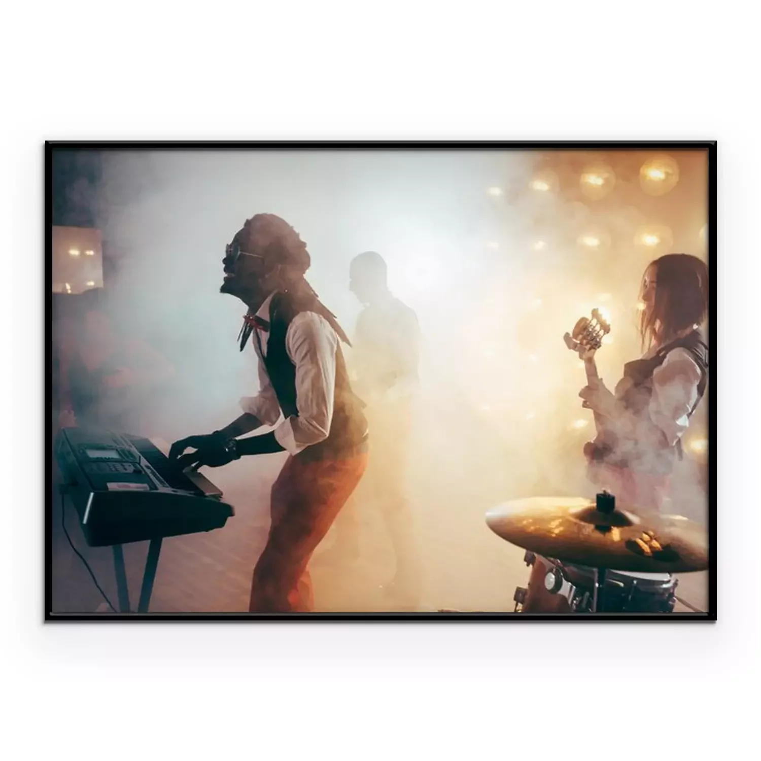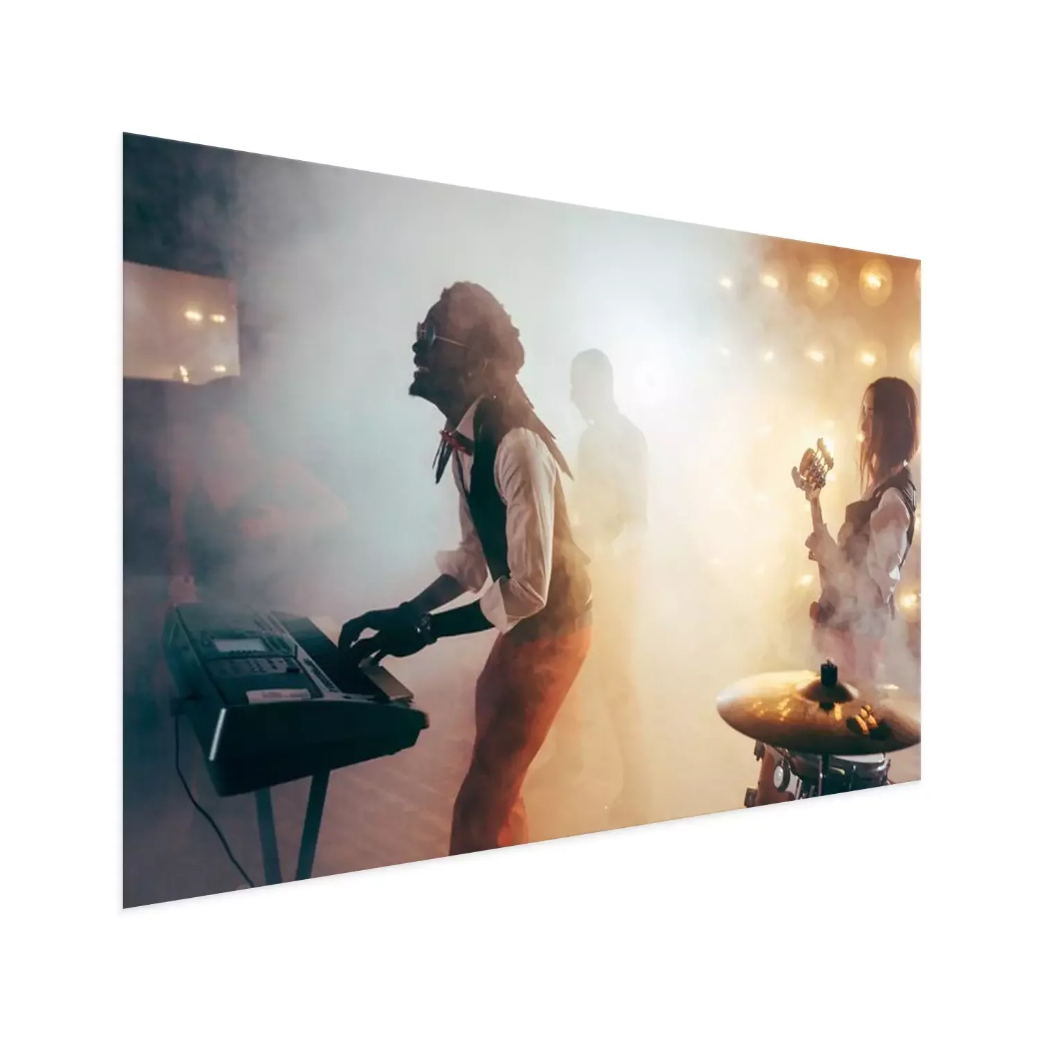 Poster : groupe génial se réjouissant de la musique sur une scène enfumée. photo vue de côté. jeunes musiciens attirant un public