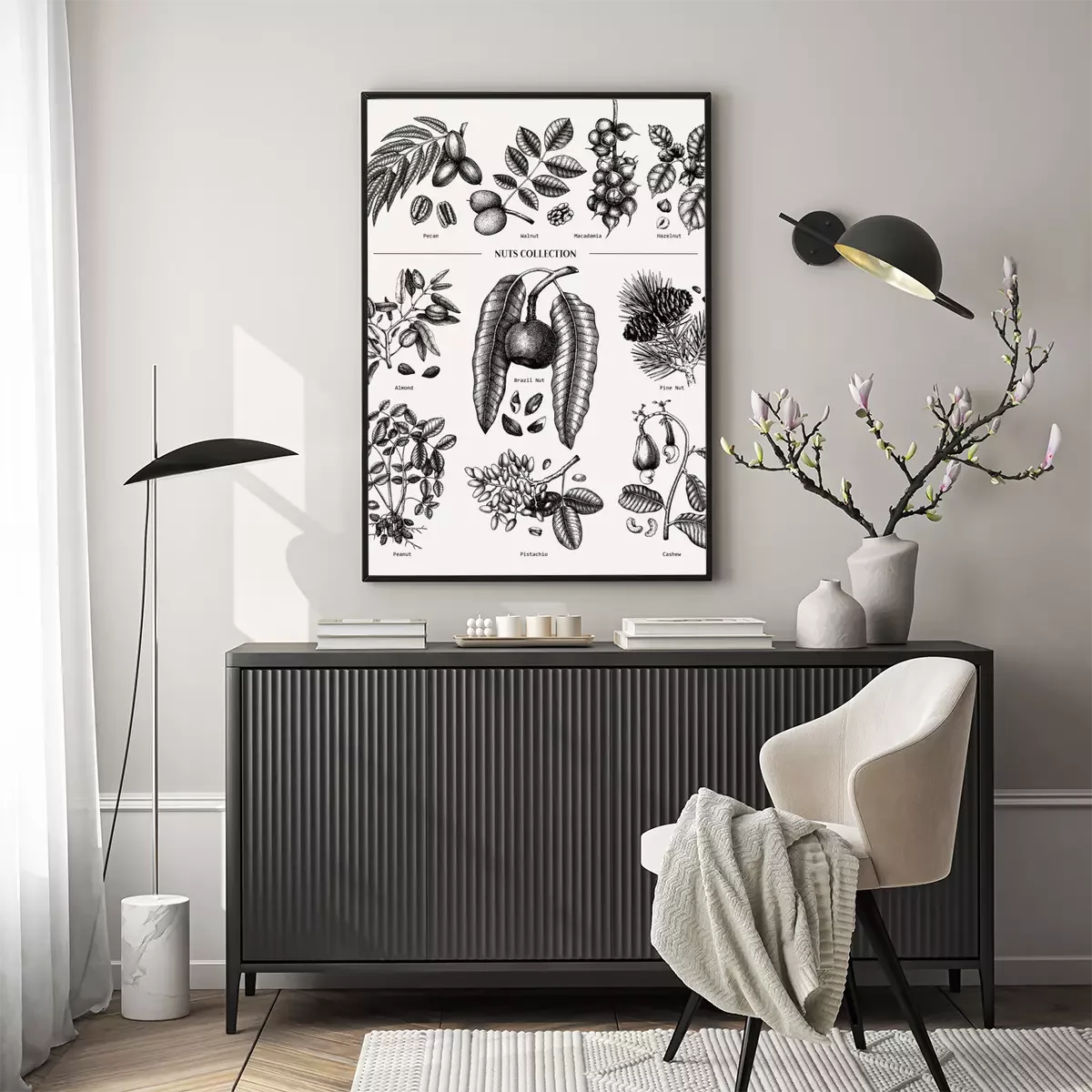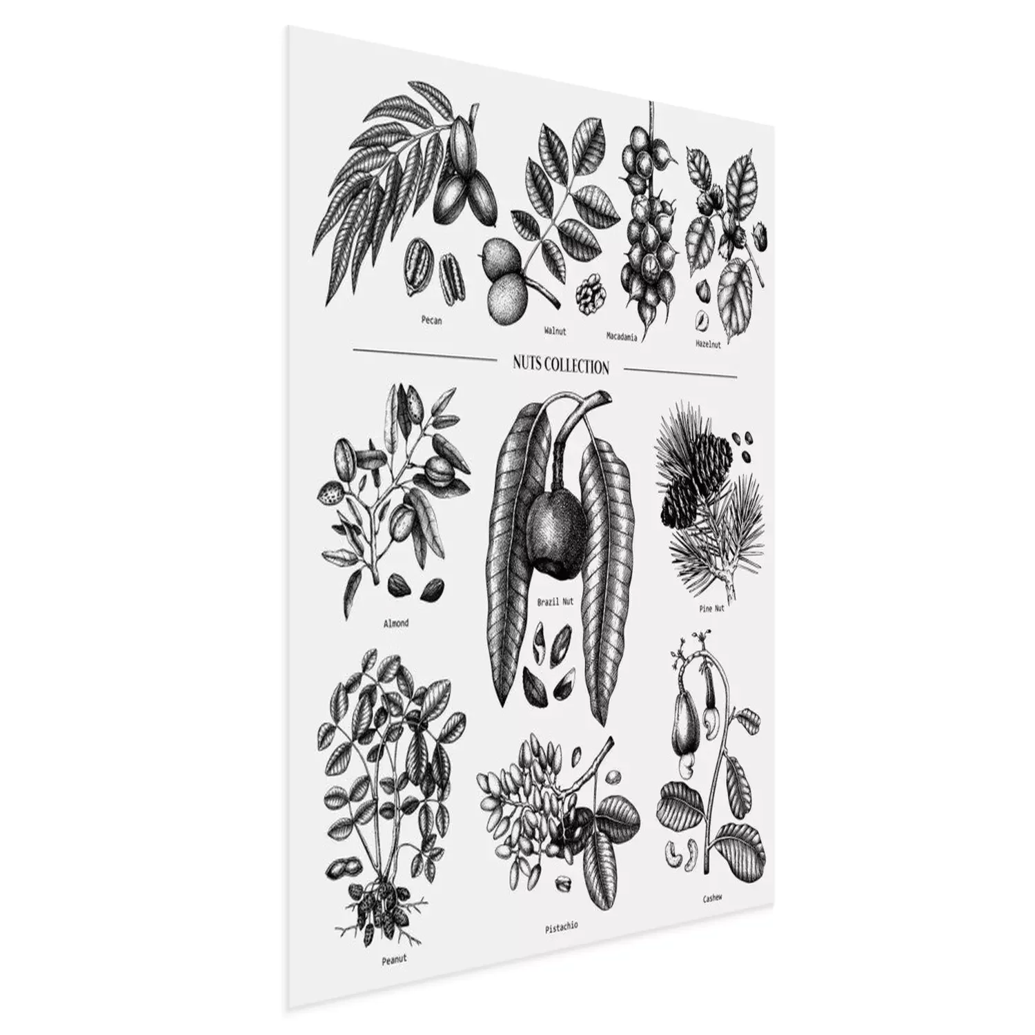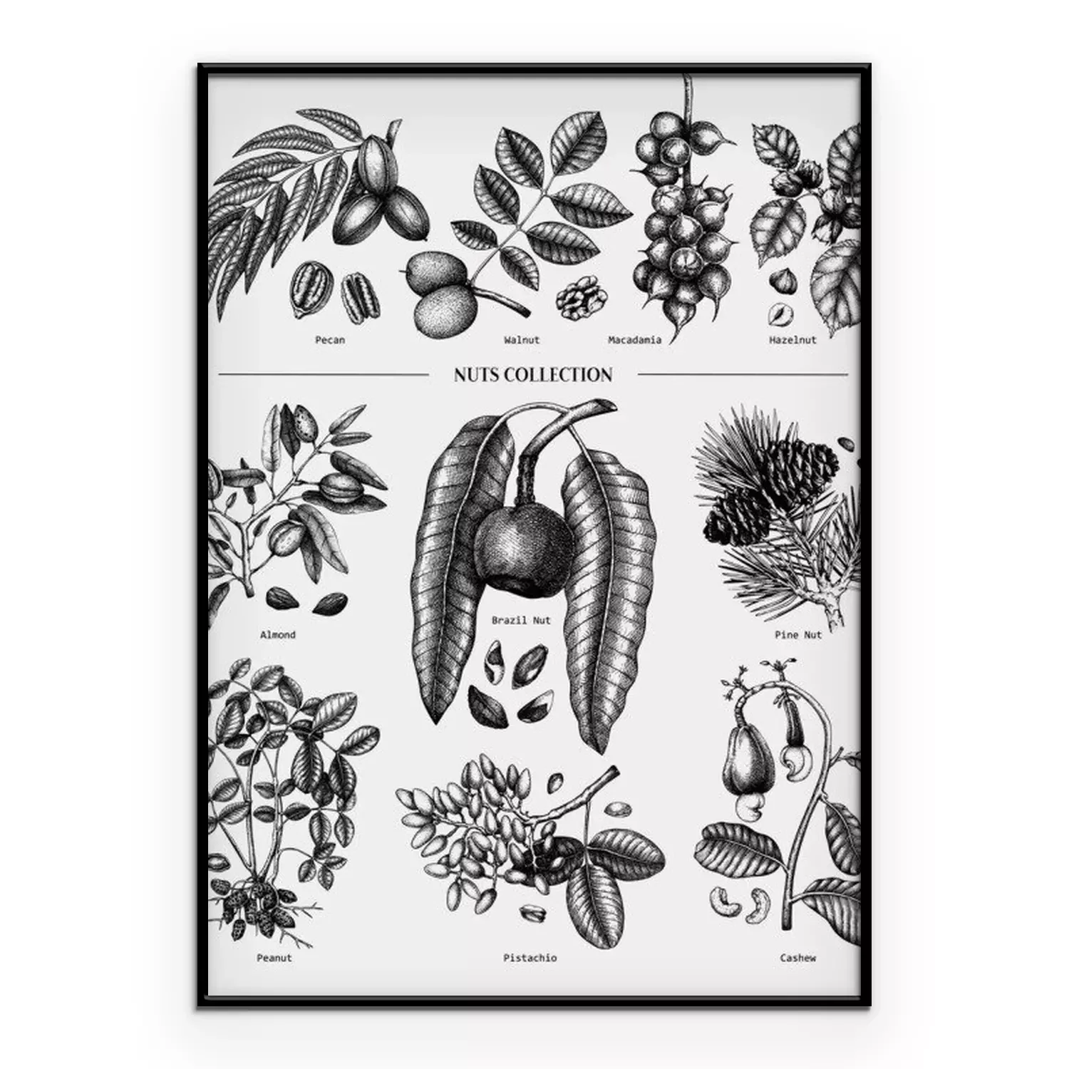 Poster  Hand drawn nut trees and plants collection. Botanical elements set. With branches, nuts, fruits, leaves, conifers and cones sketches. Culinary nuts vector illustrations. Healthy food drawings.