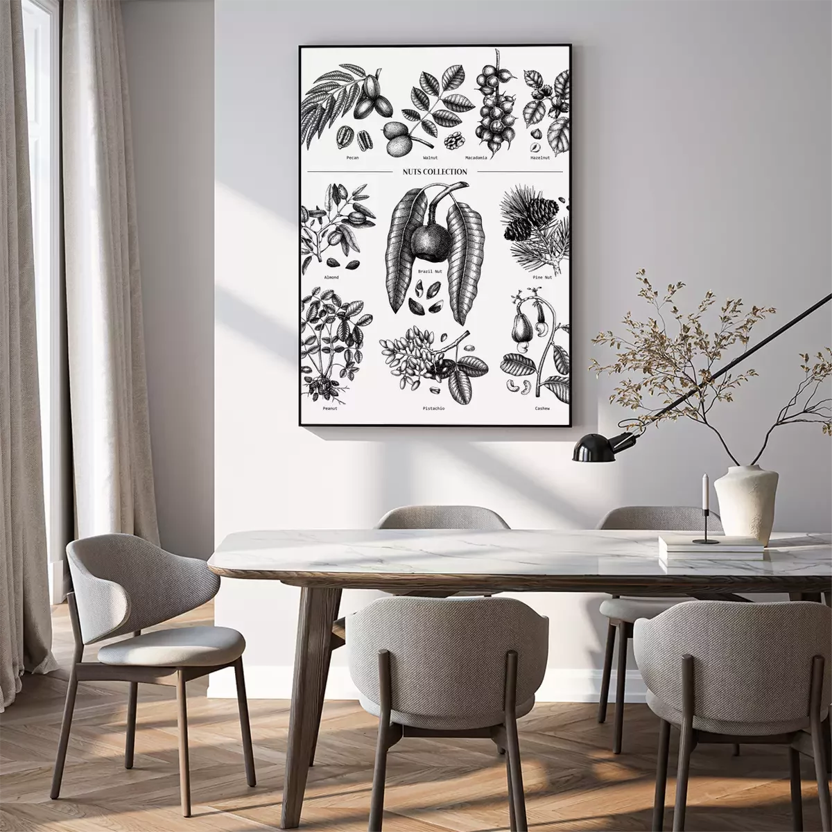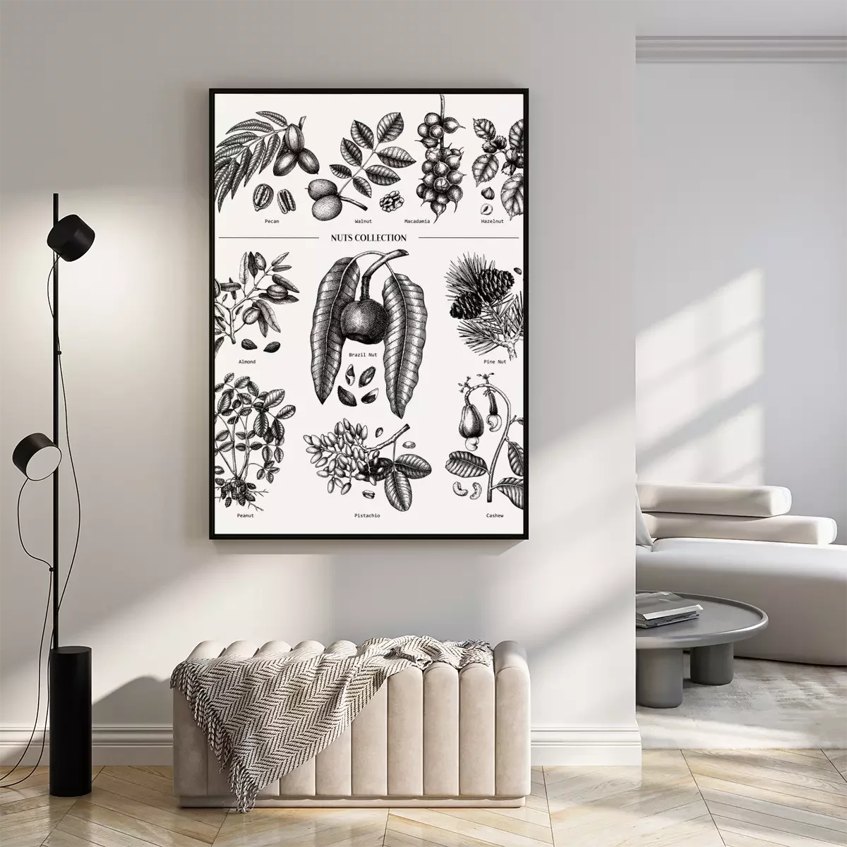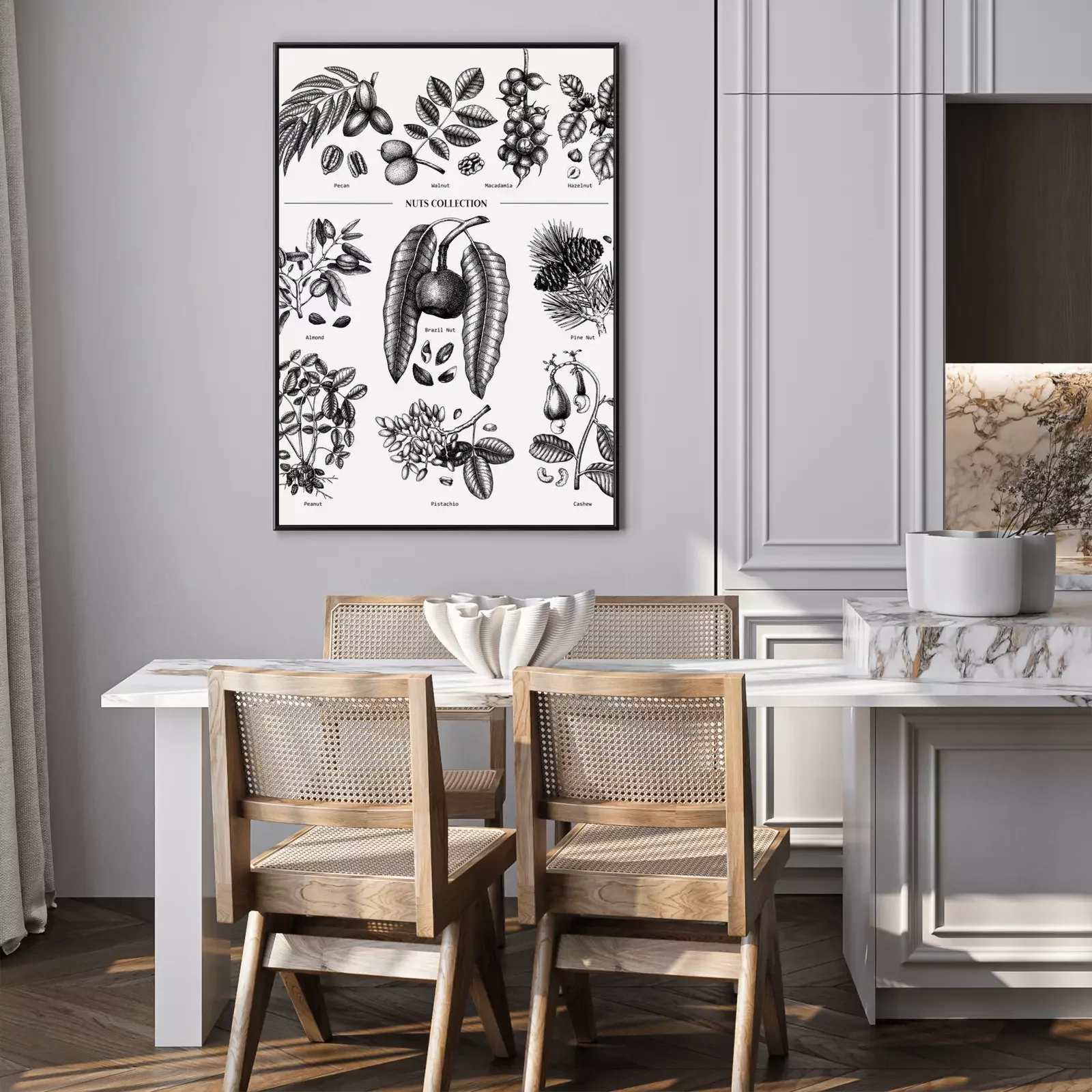Poster  Hand drawn nut trees and plants collection. Botanical elements set. With branches, nuts, fruits, leaves, conifers and cones sketches. Culinary nuts vector illustrations. Healthy food drawings.