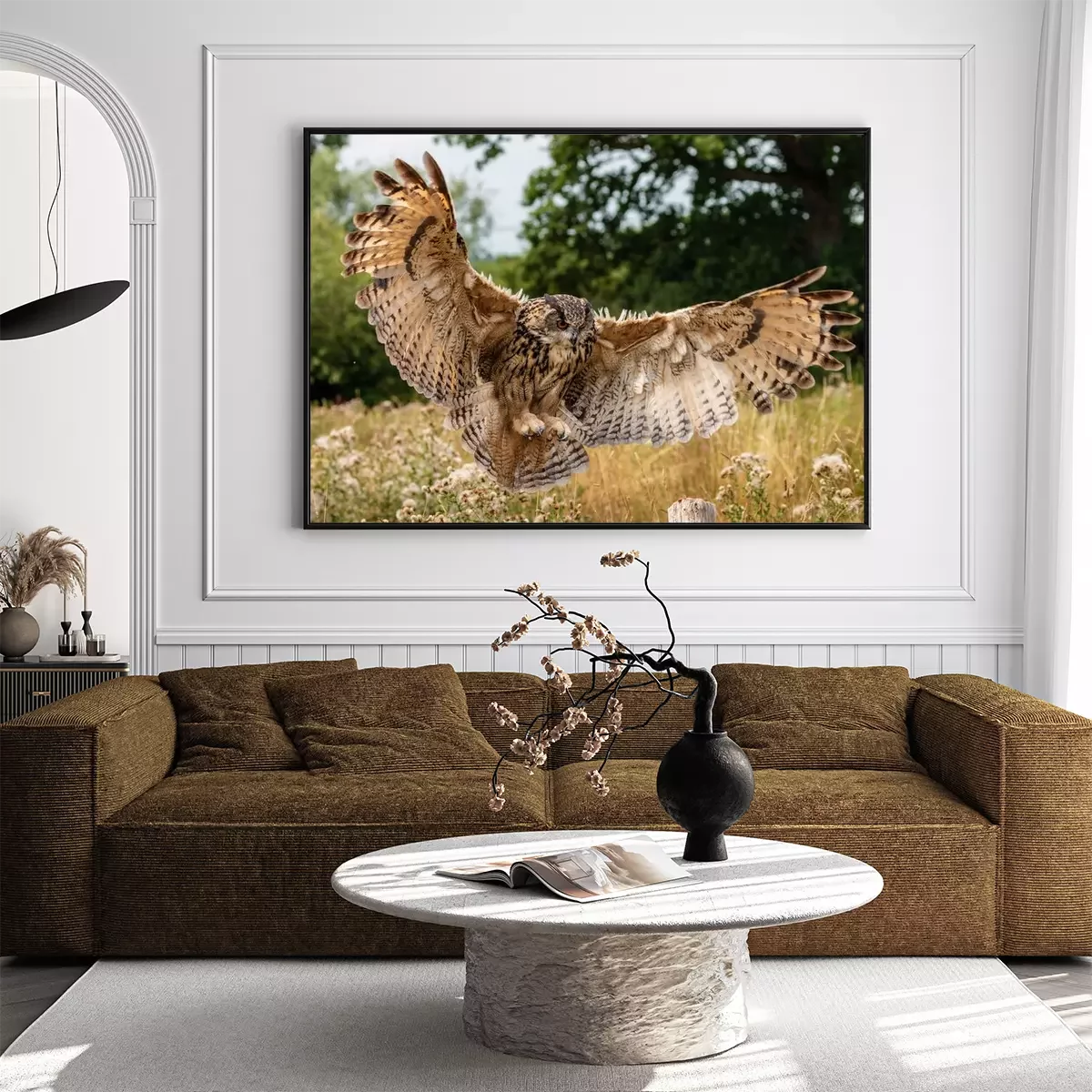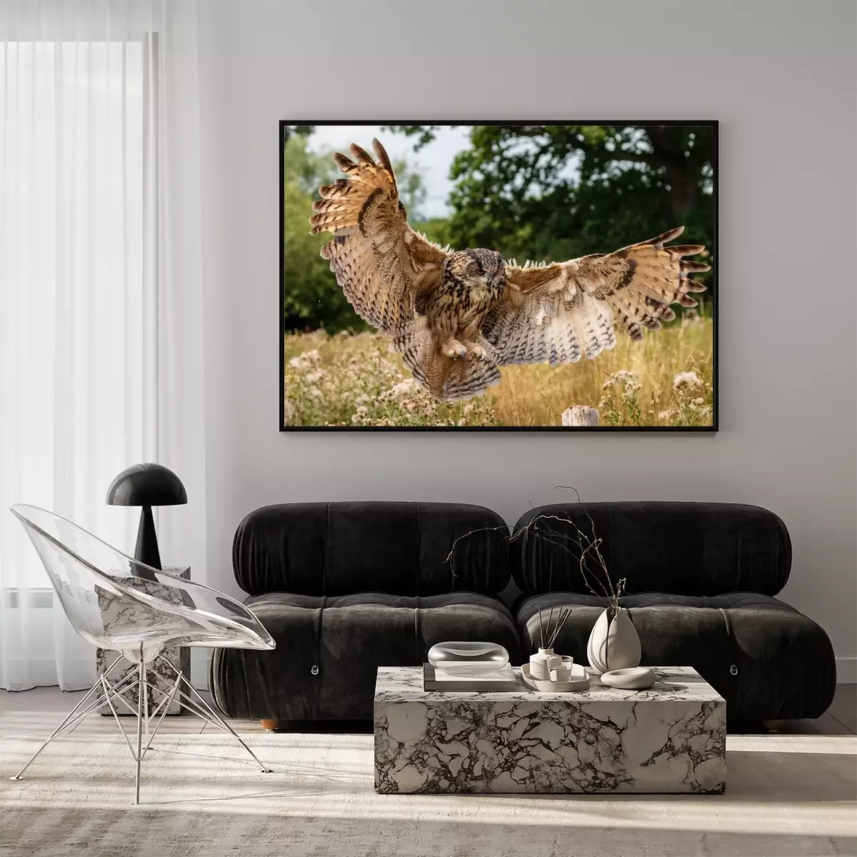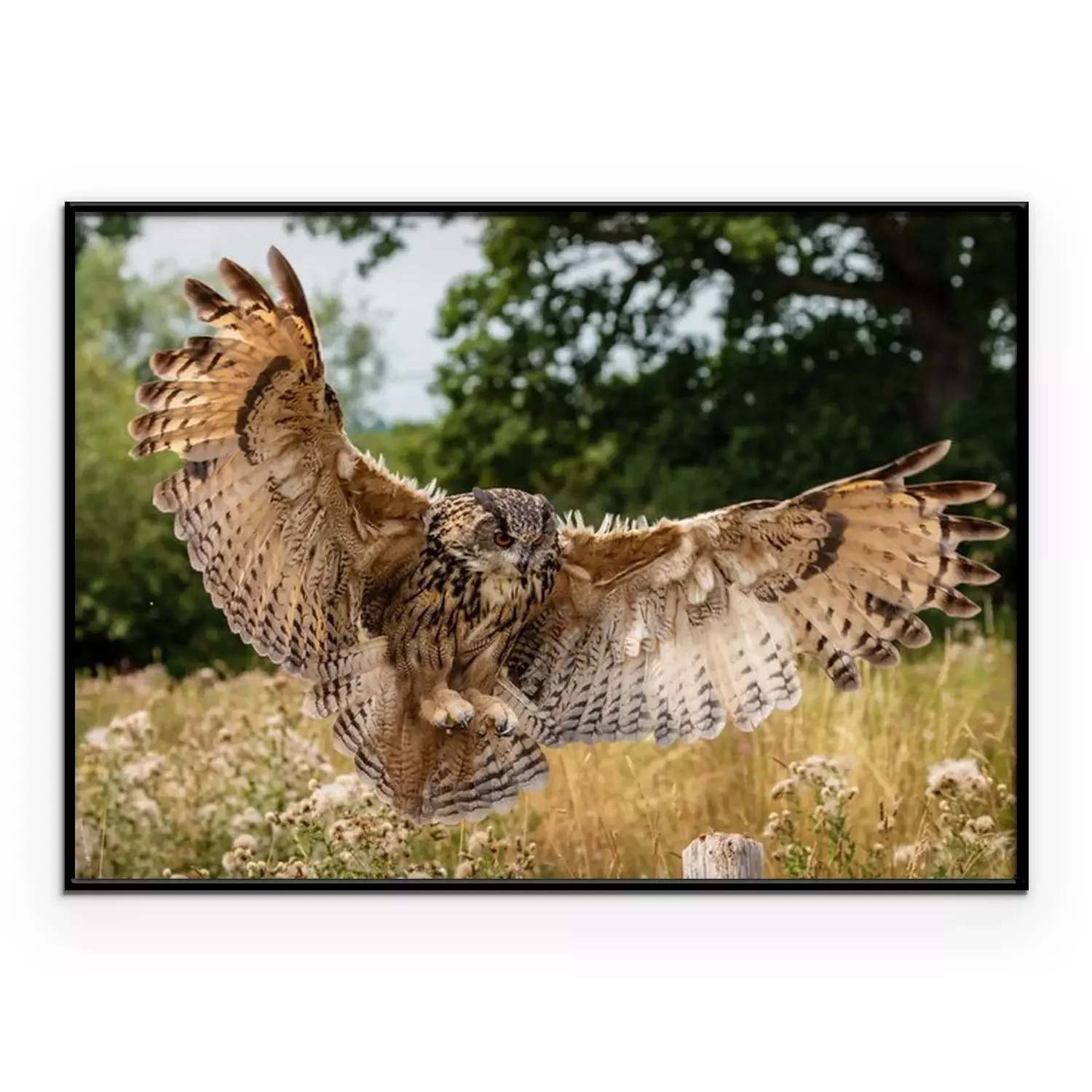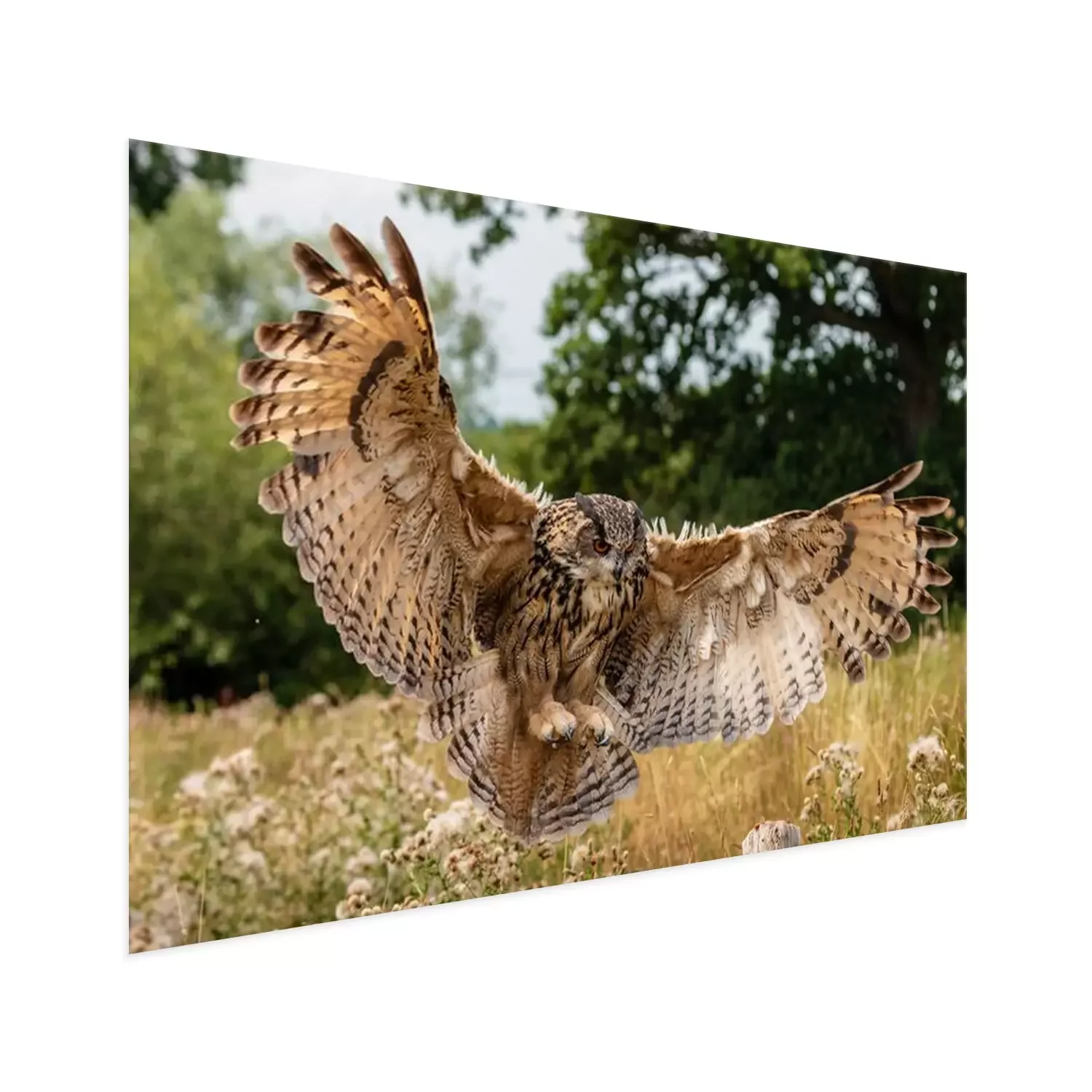 Poster : Hibou atterrissant dans le pré