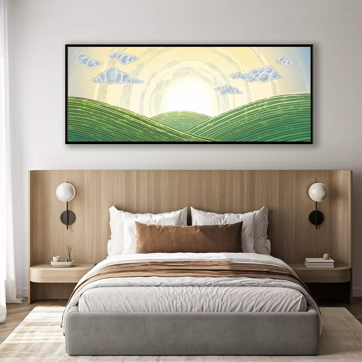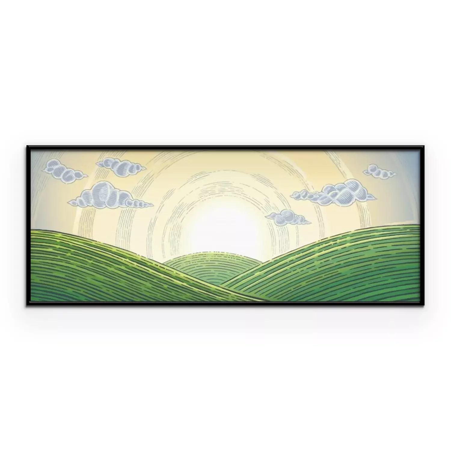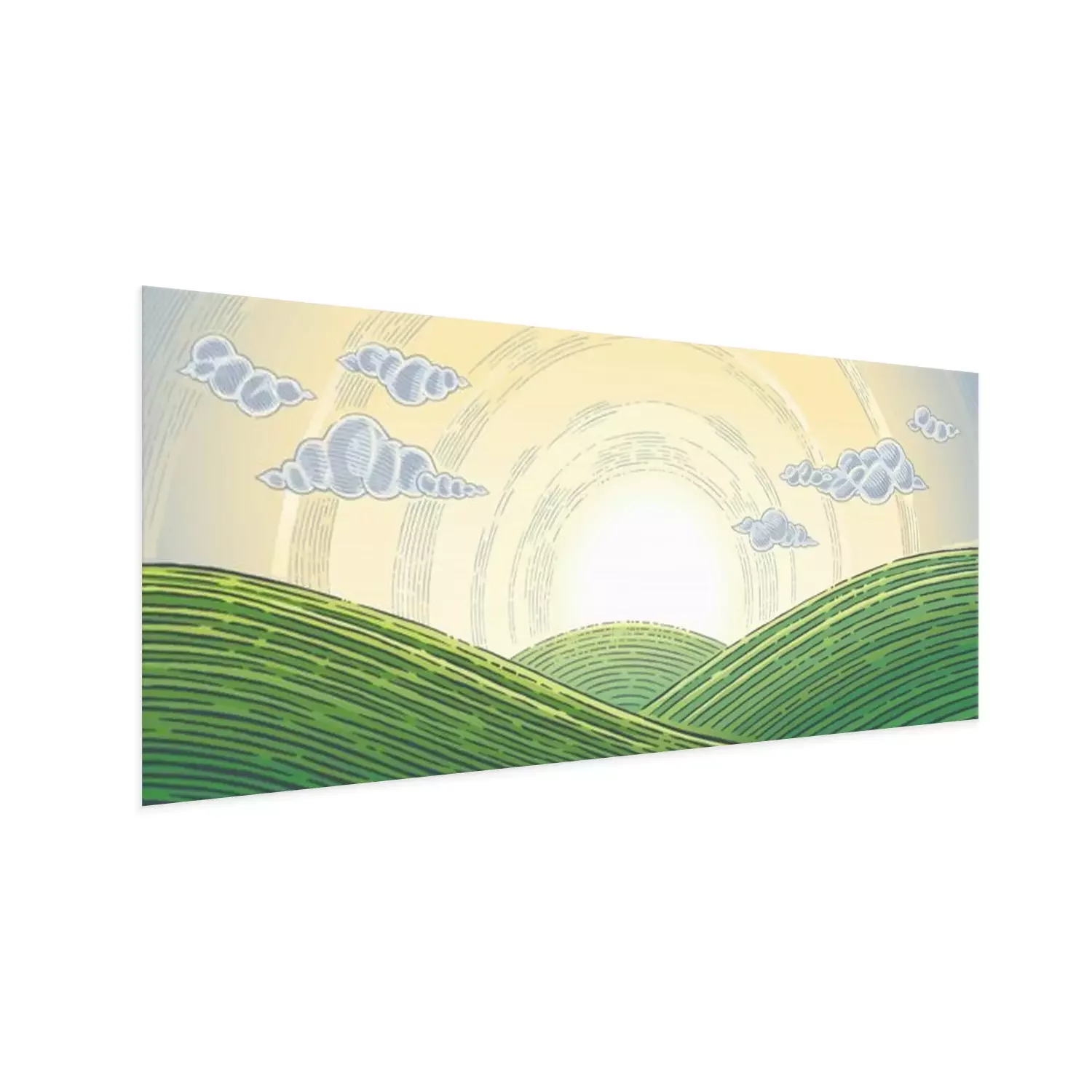 Poster : Hilly landscape, sunrise above hills in graphical style.