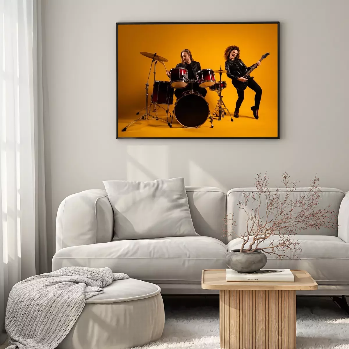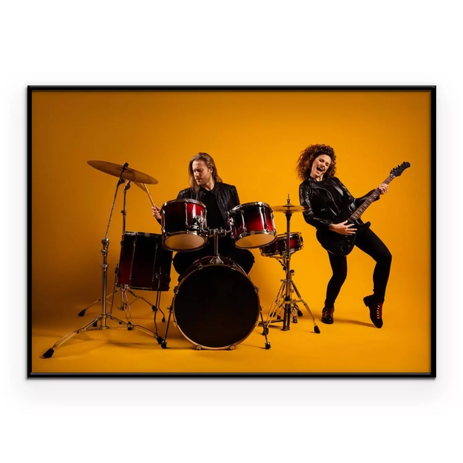 Poster  His he her she nice attractive cheerful cheery glad positive couple playing live music bass sound cymbal having fun hobby isolated on bright vivid shine vibrant yellow color background
