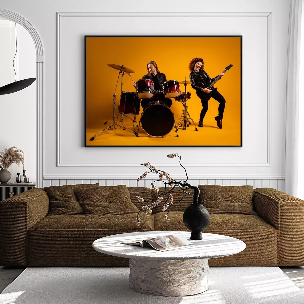 Poster : His he her she nice attractive cheerful cheery glad positive couple playing live music bass sound cymbal having fun hobby isolated on bright vivid shine vibrant yellow color background