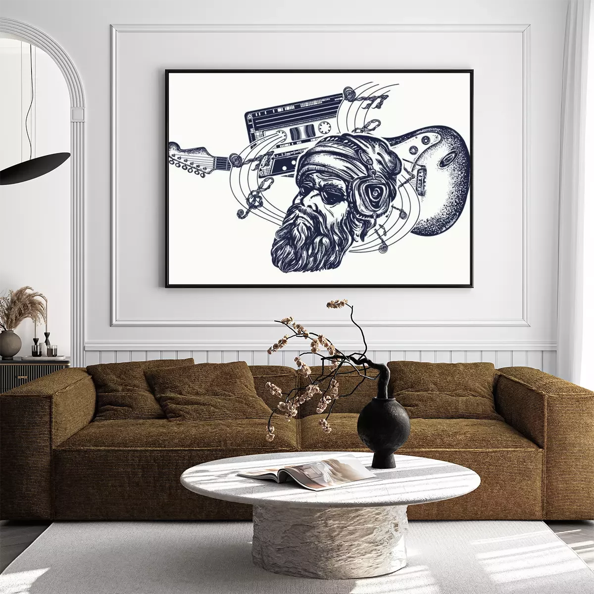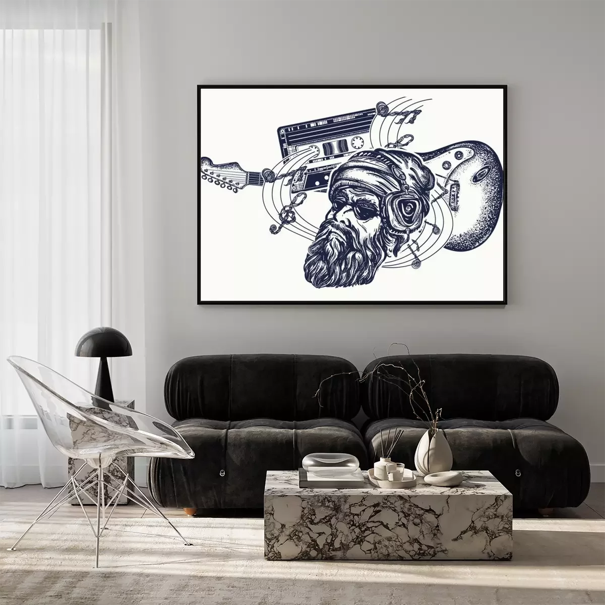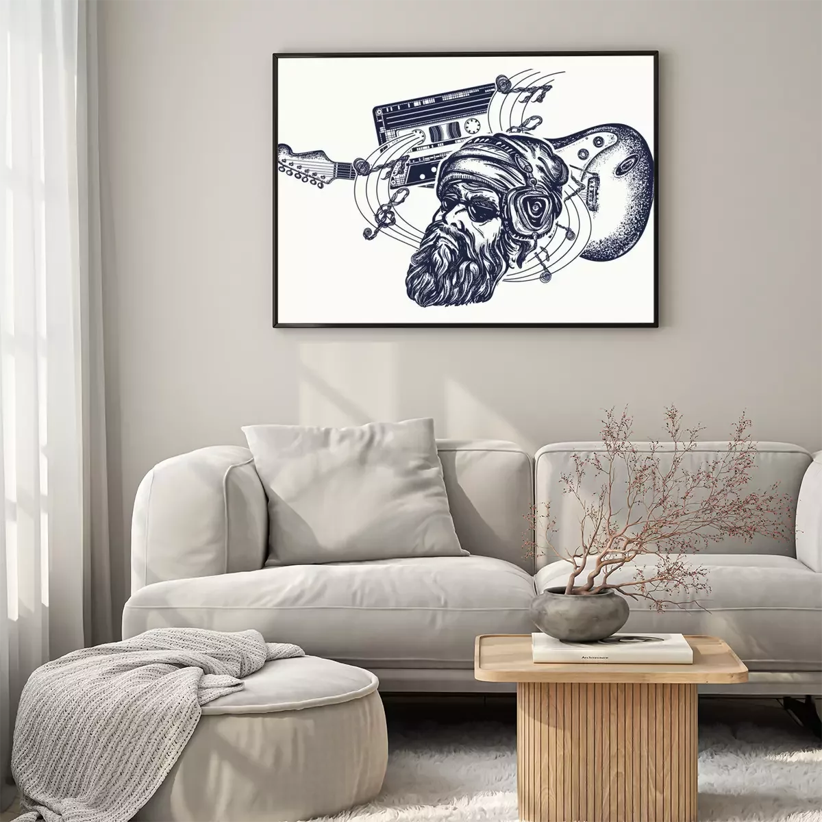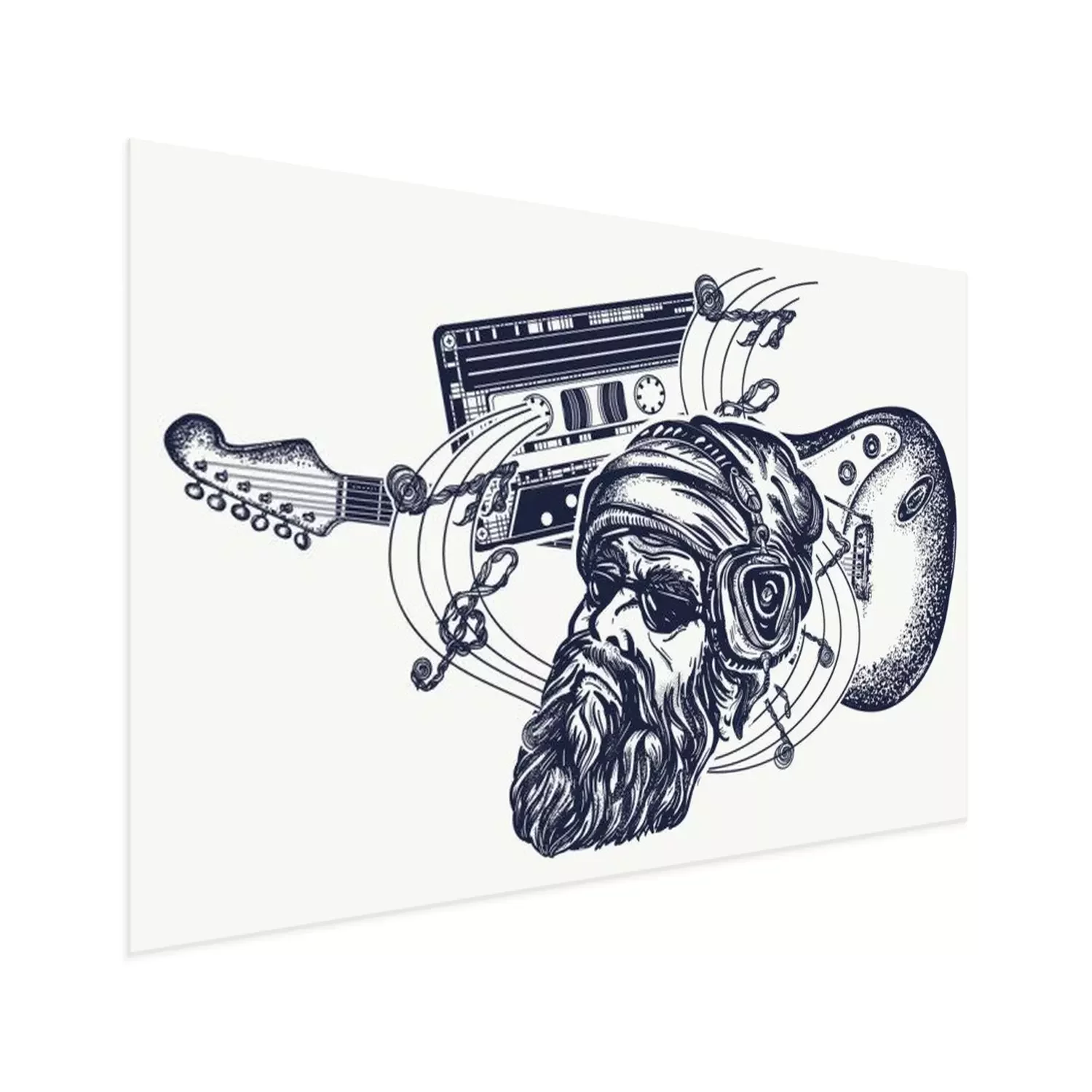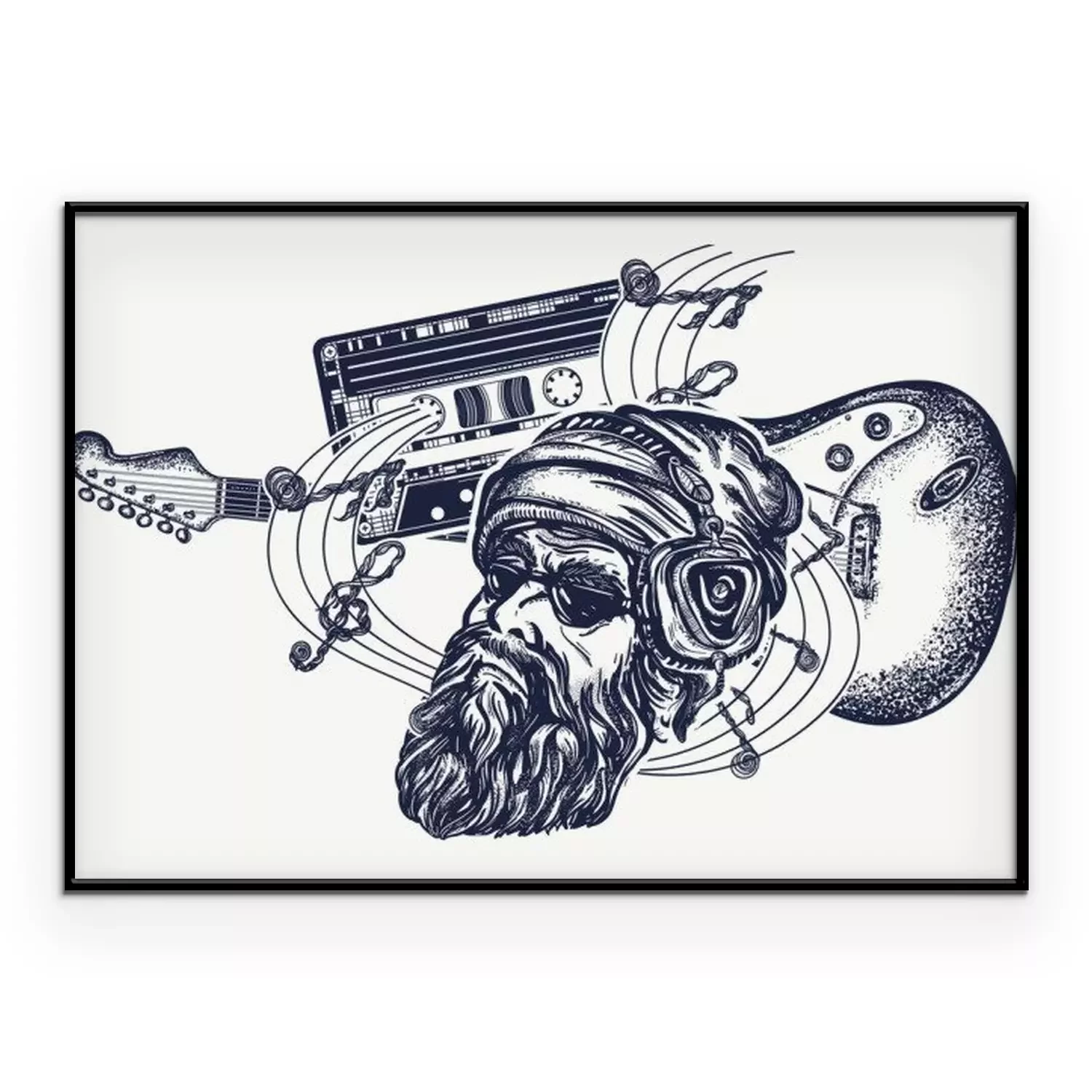 Poster  Homme barbu, guitare et cassette audio tatouage et conception de t-shirt. Guitare électro et notes de musique rock, symbole du hard rock, de la musique punk, de l'art du rock and roll