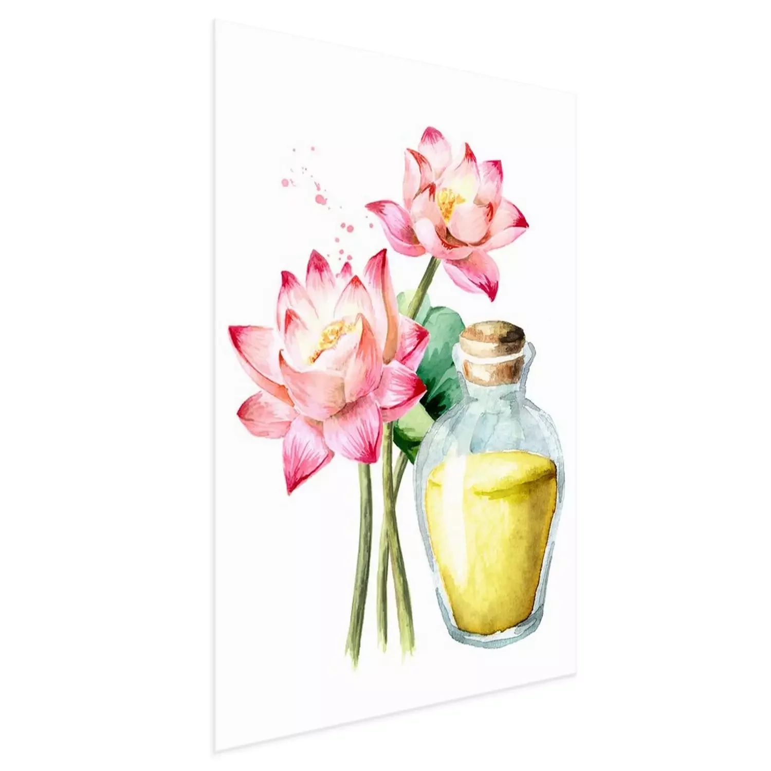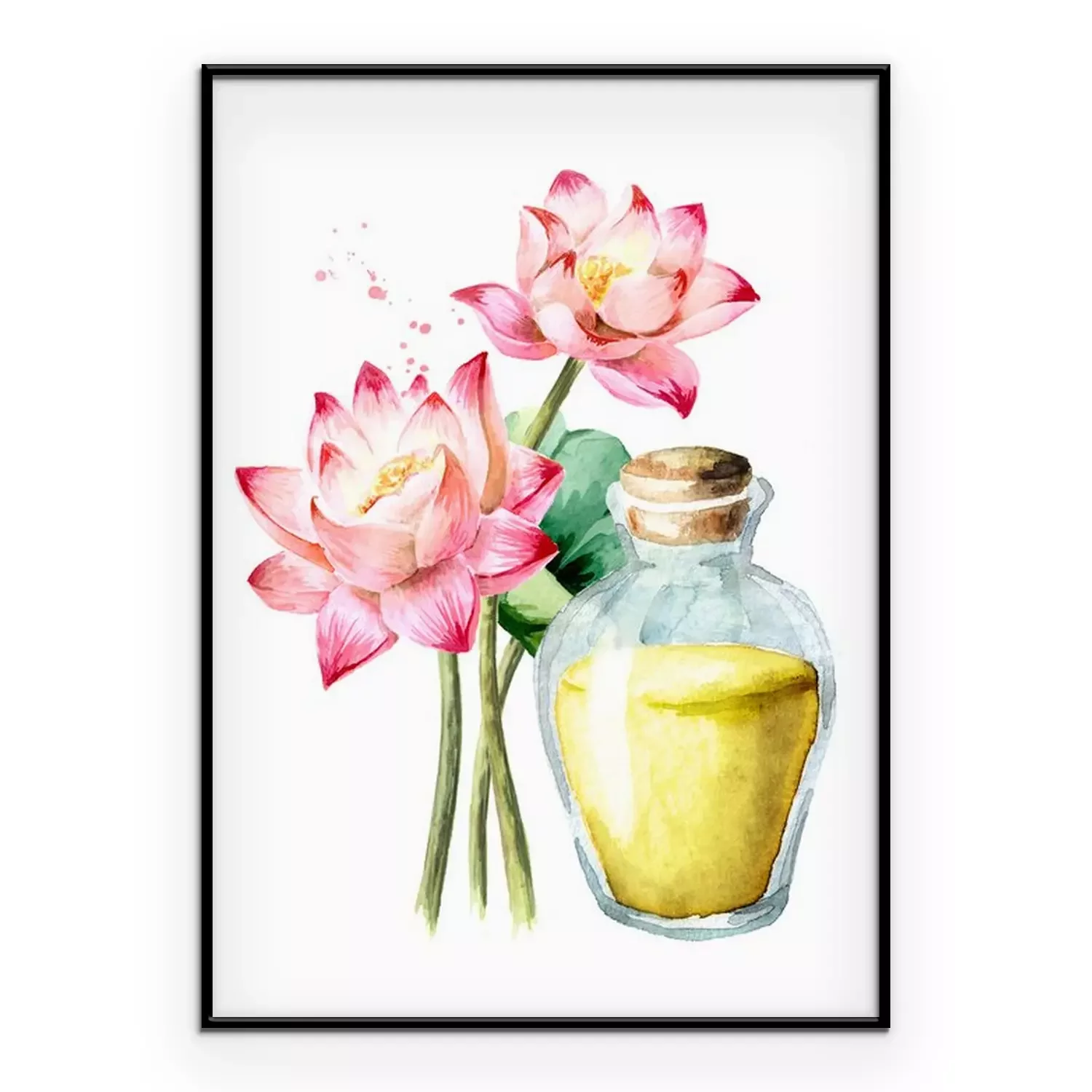 Poster  Huile essentielle dans un plat en verre et dessin de fleurs
