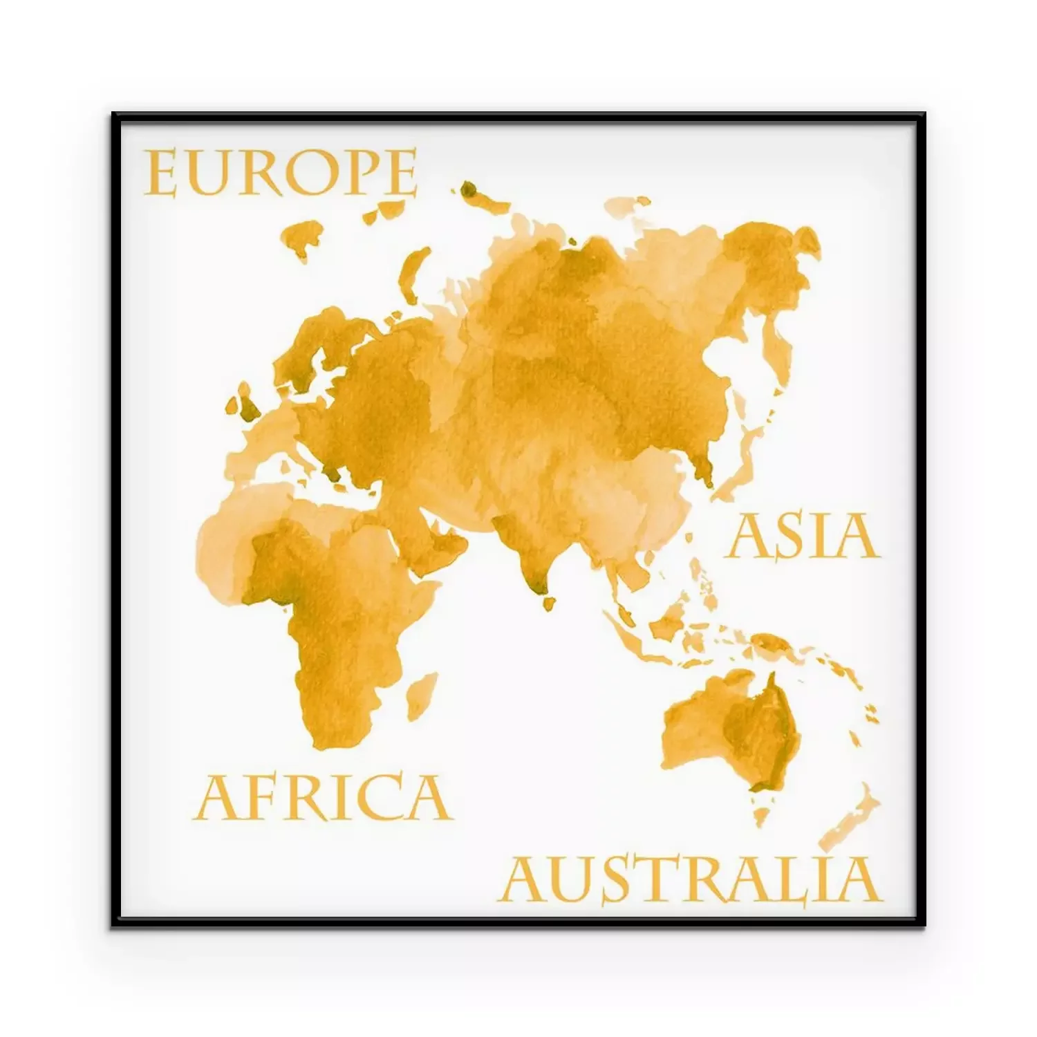 Poster : Illustration aquarelle des parties de la carte du monde comme l'Europe, l'Asie, l'Afrique et l'Australie peints à l'encre d'or sépia